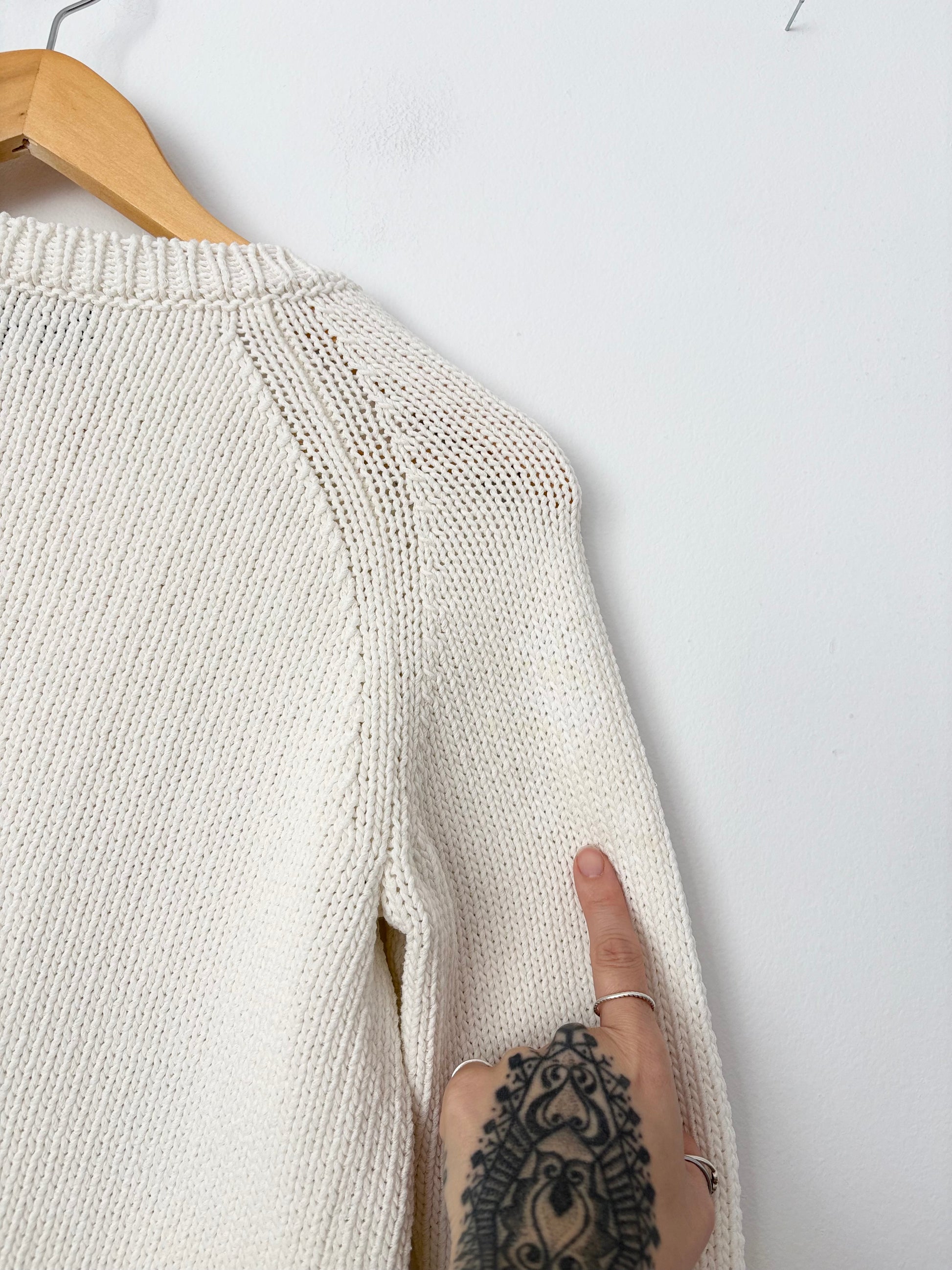 Un détail remarquable, composé de boutonnières, orne ce pull en maille texturée du col jusqu'aux manches.