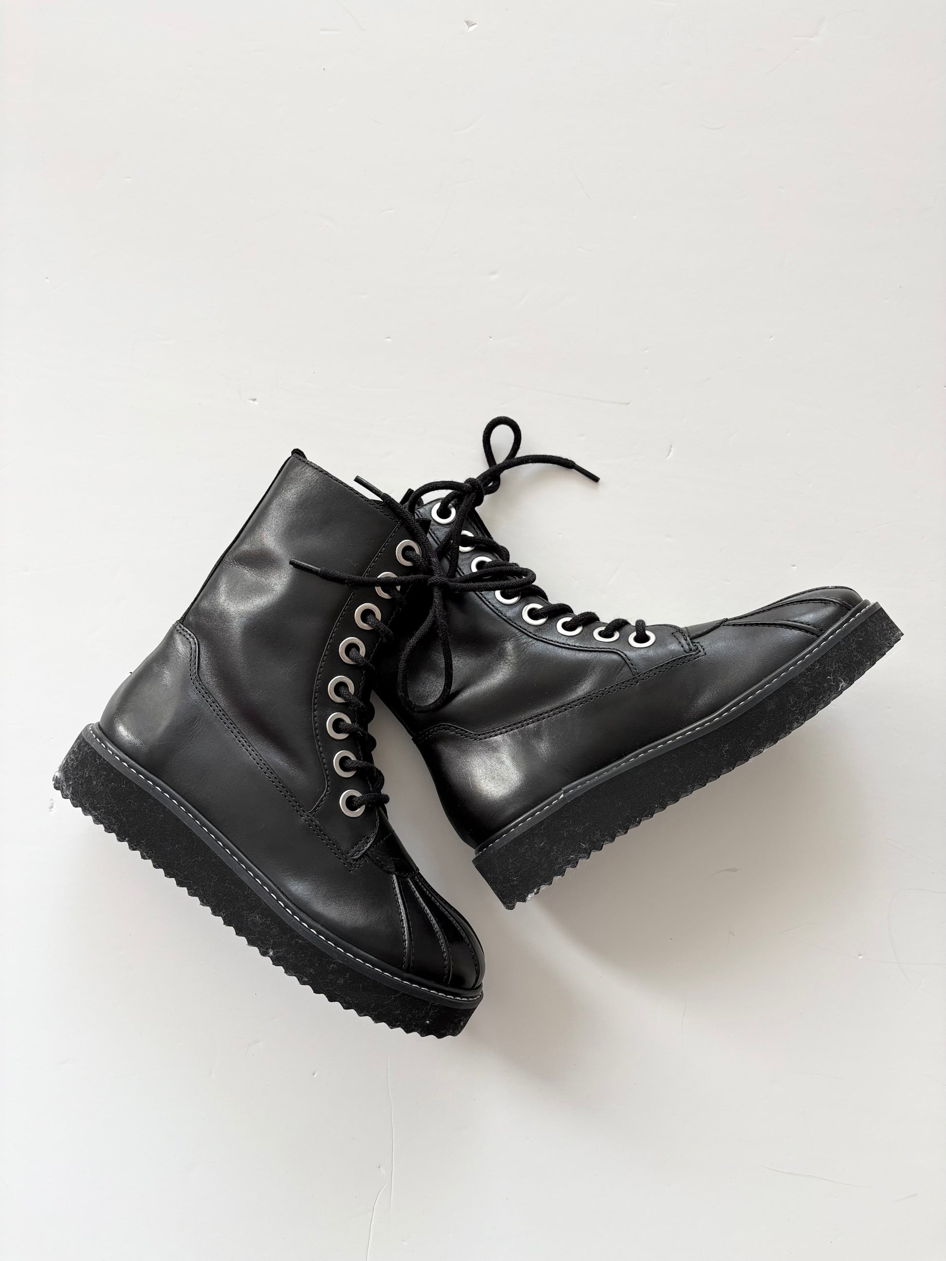 Bottes de combat emblématiques à 8 œillets en cuir noir classique, ornées de coutures en relief au niveau des orteils.