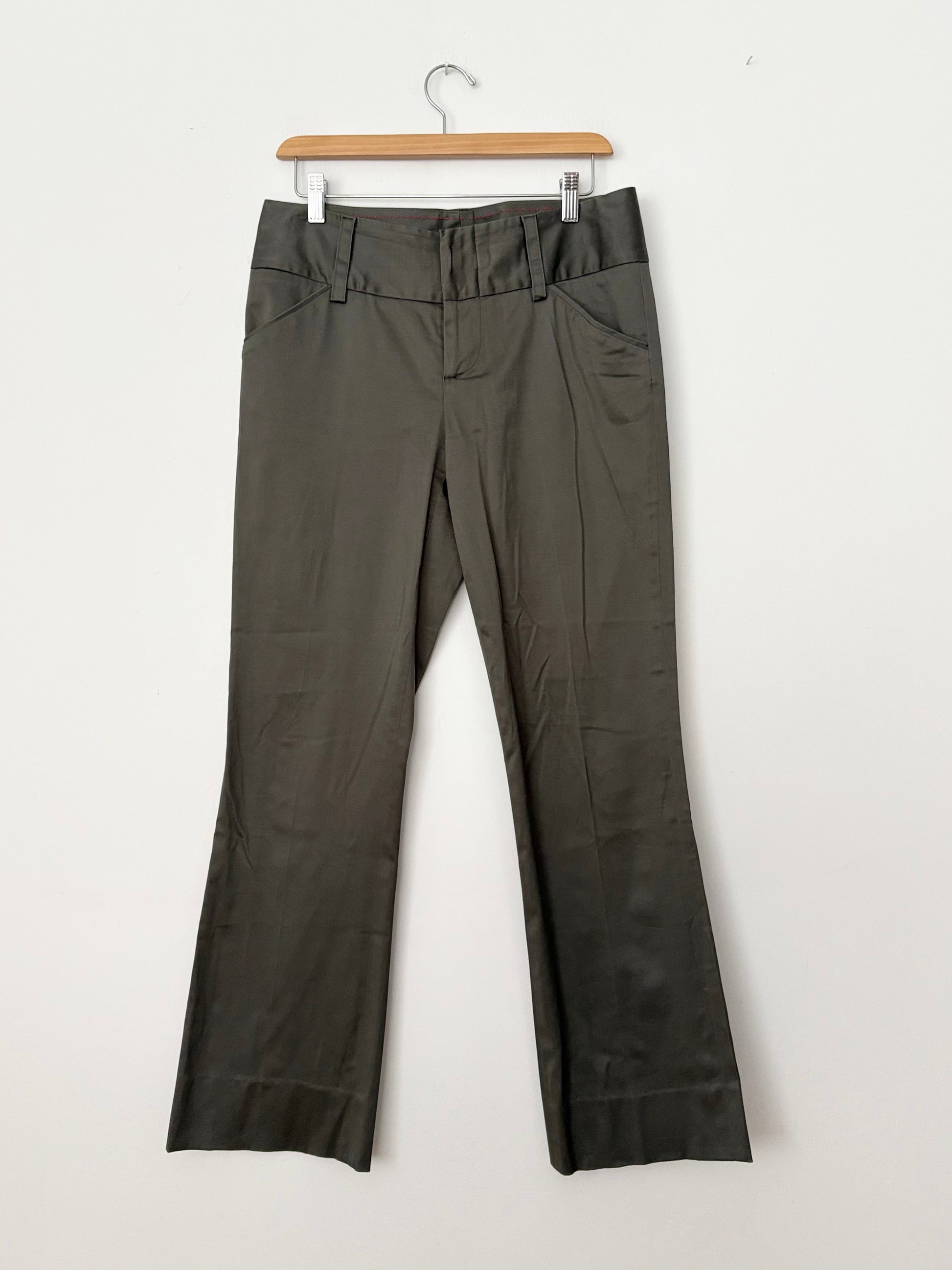 Pantalon de travail gris taille basse style années 2000, légèrement évasé et à large ceinture.