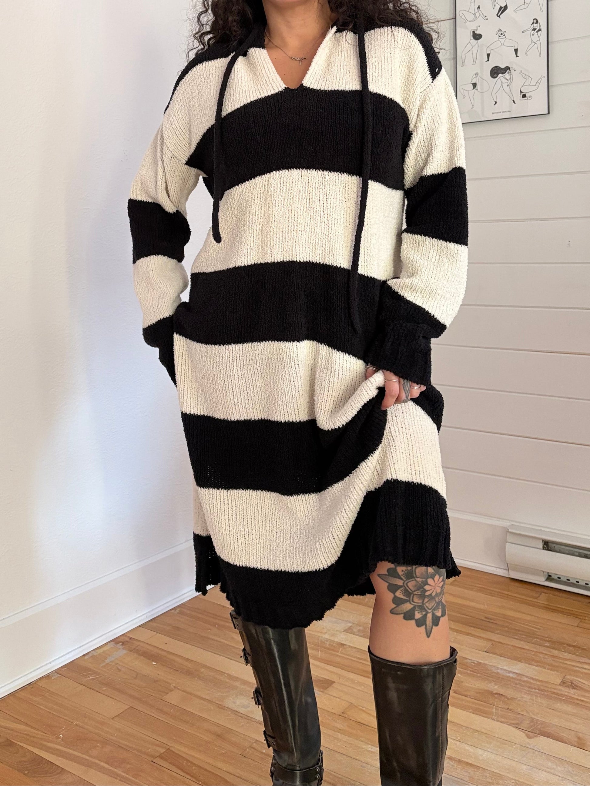 Robe pull à capuche rayée noire et blanche en tissu éponge