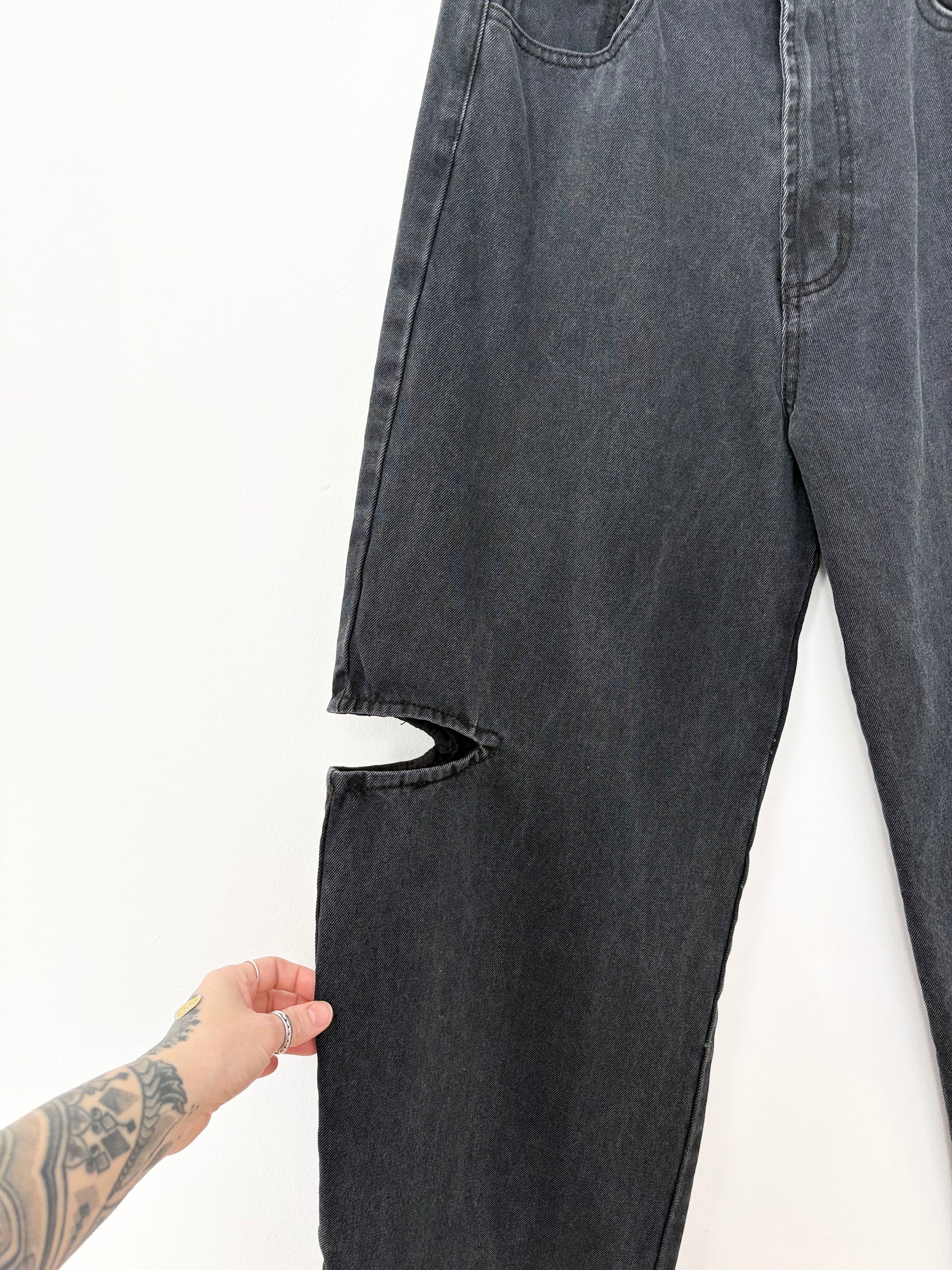 Jean noir délavé à coupe droite avec découpes latérales aux genoux