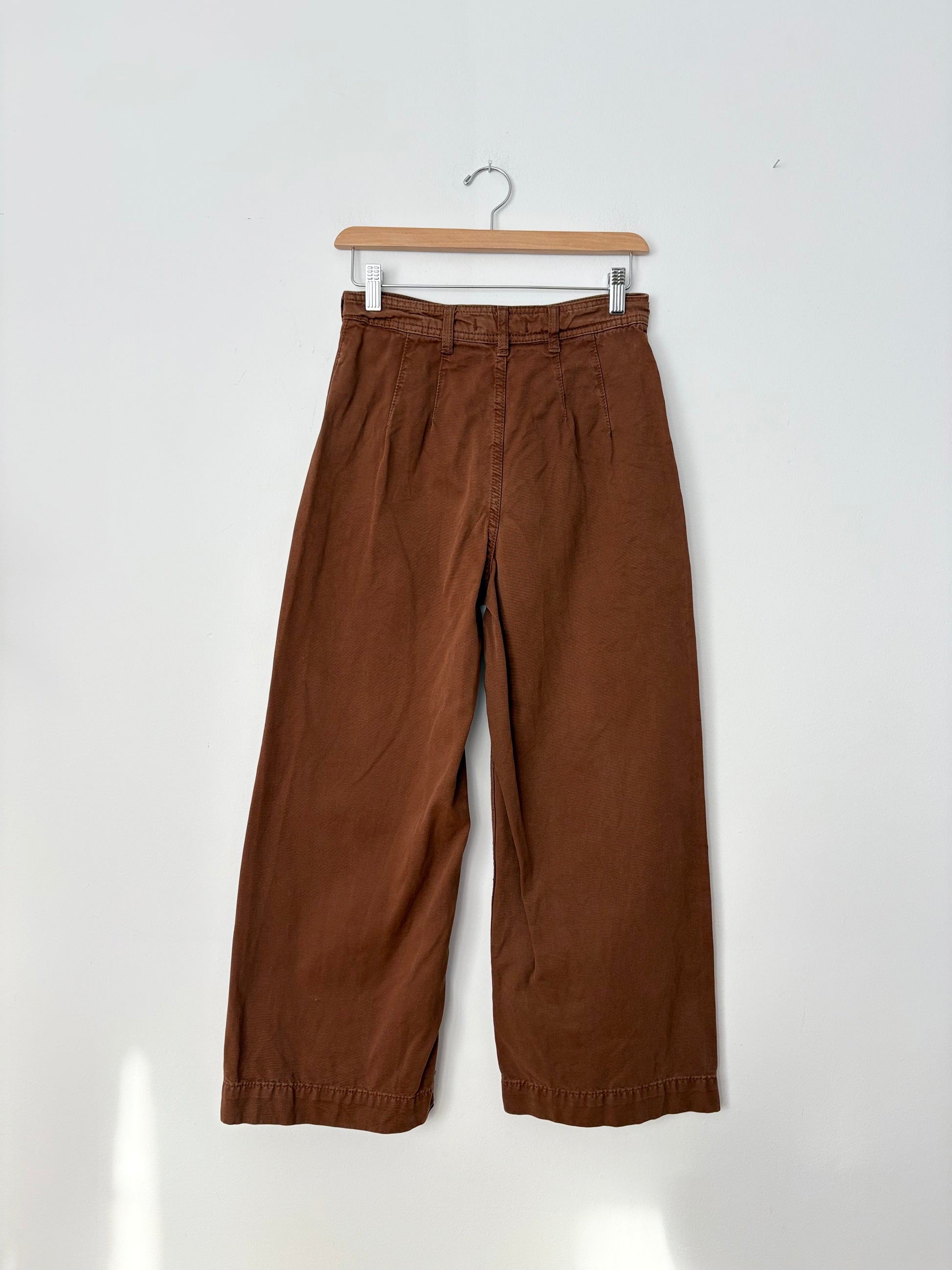 Pantalon taille haute d'inspiration rétro, à la coupe ample et 7/8, pour un look bohème décontracté. Confectionné en sergé de coton robuste, il est doté d'une fermeture boutonnée et zippée, et d'une coupe droite sur le devant pour des lignes épurées.
