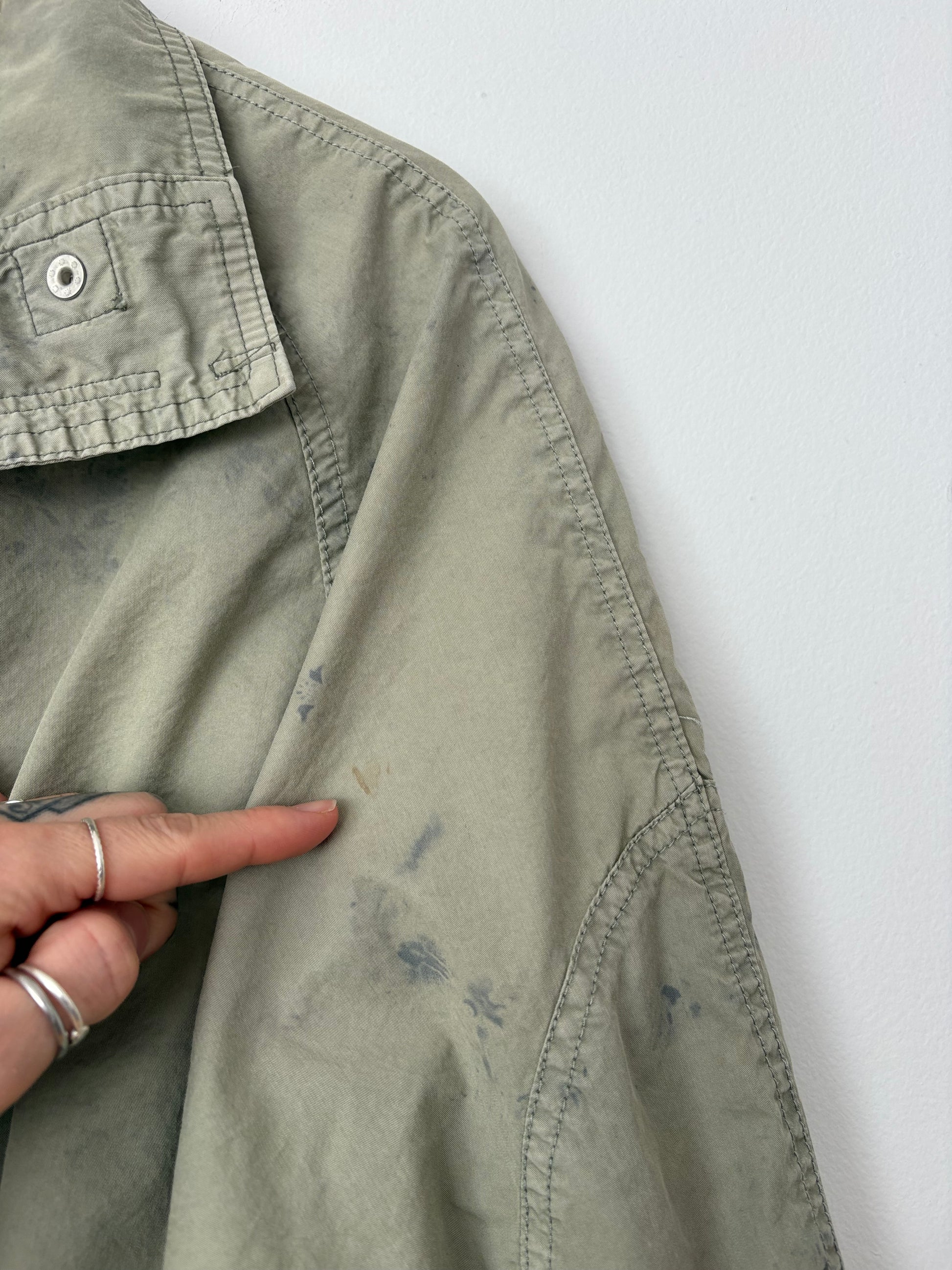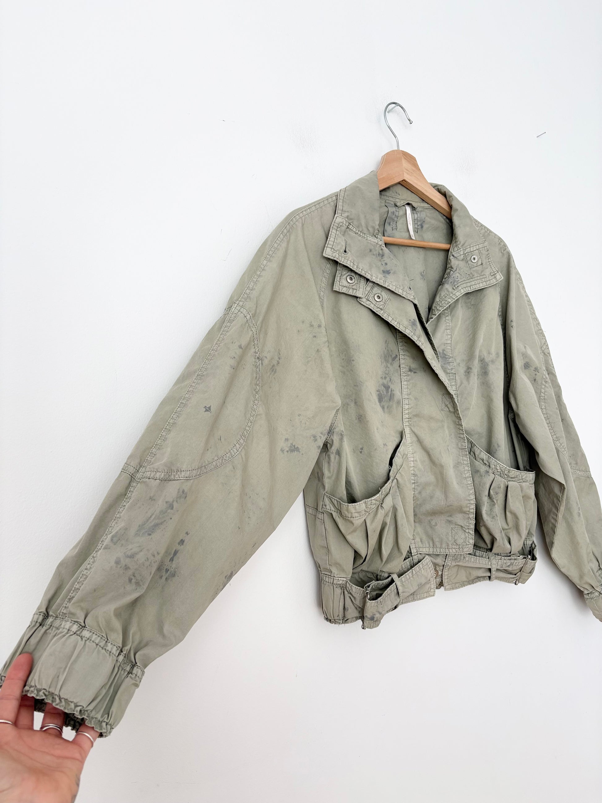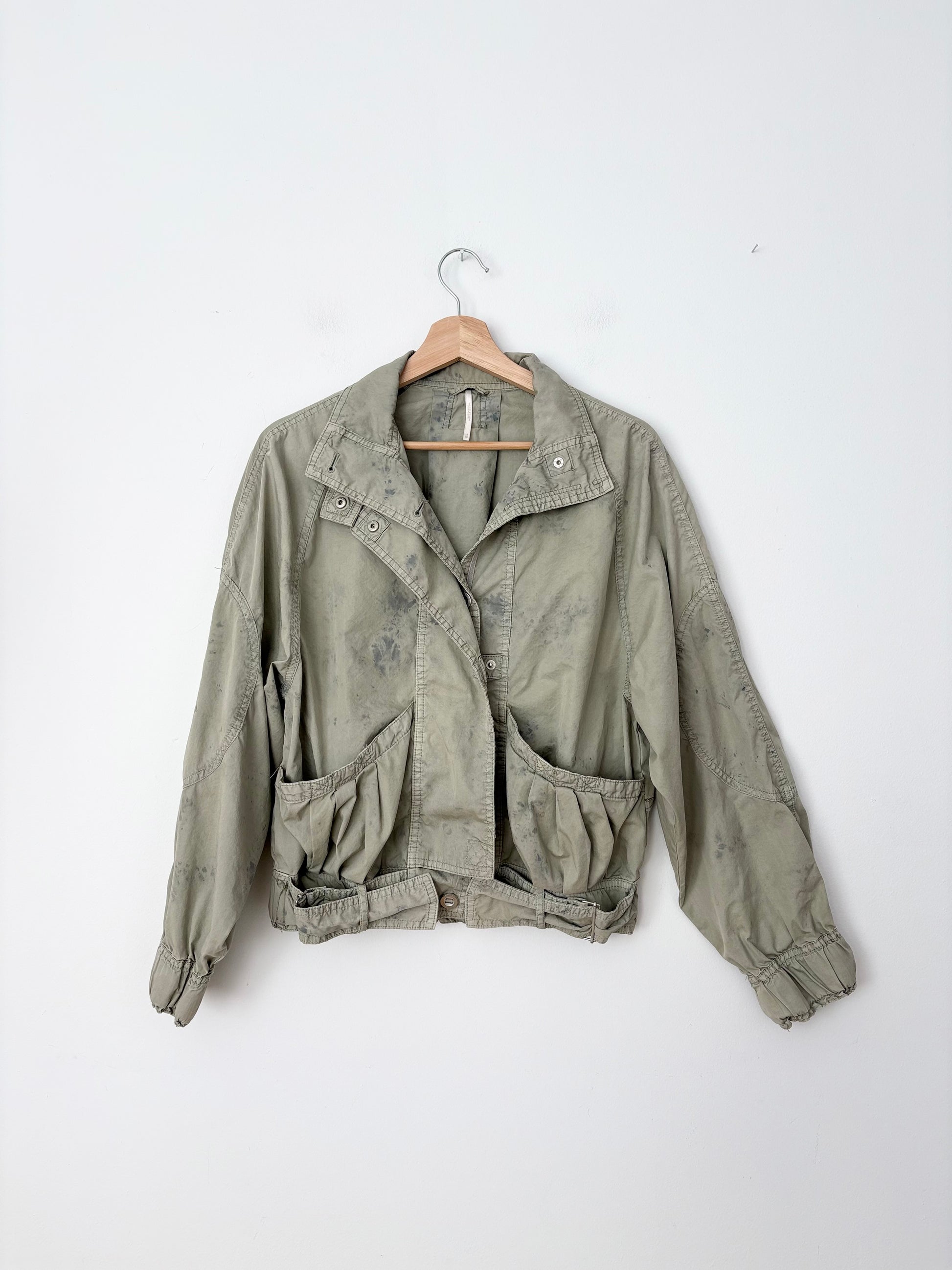 Veste décontractée et ultra-légère. Idéale pour la mi-saison, cette veste légère présente une coupe sportive et oversize, des poches avant décontractées, des poignets élastiqués et des boucles tendance à la taille. Vert kaki clair avec un effet délavé/vieilli sur l'ensemble, rehaussé de touches de bleu.