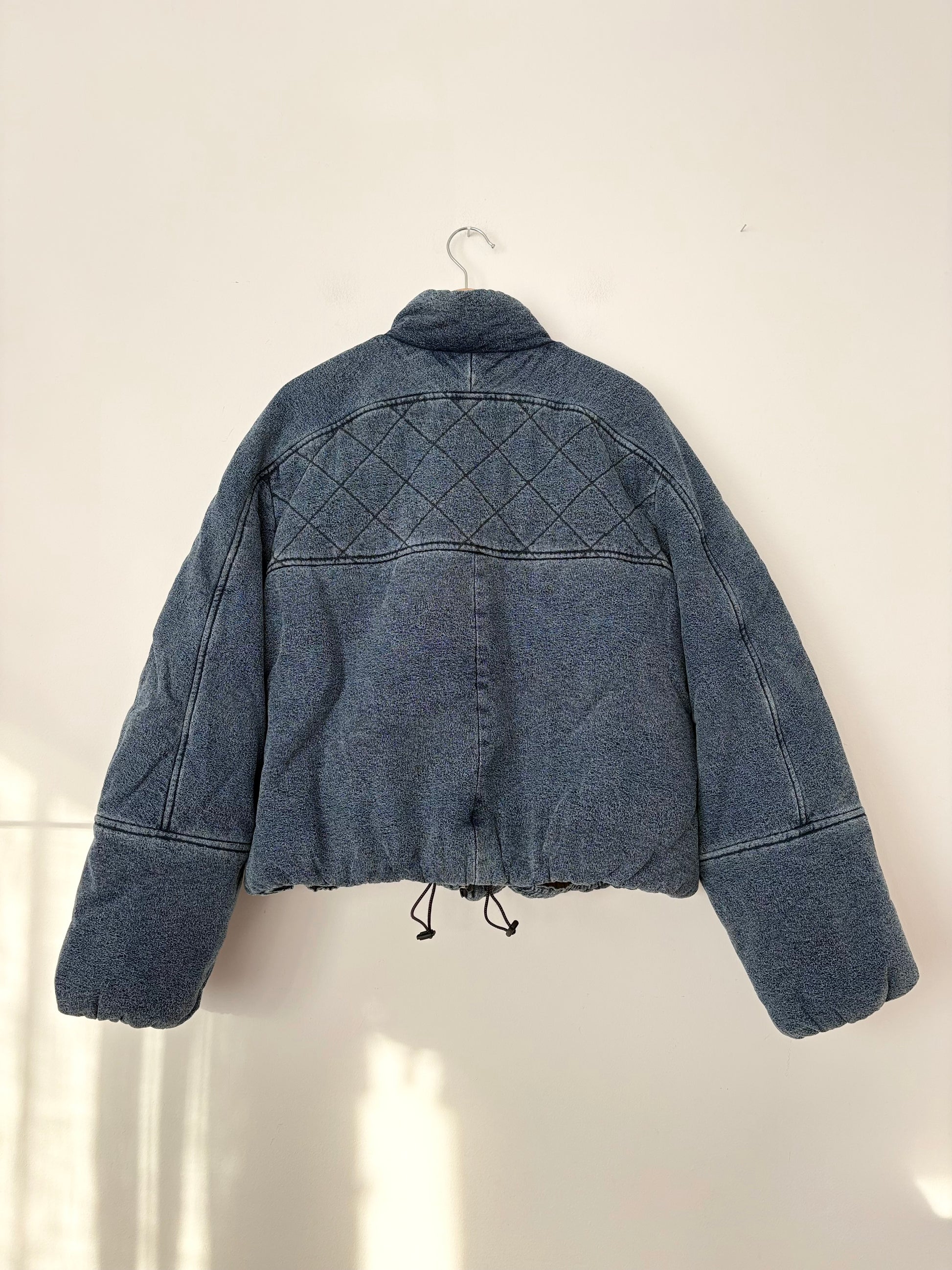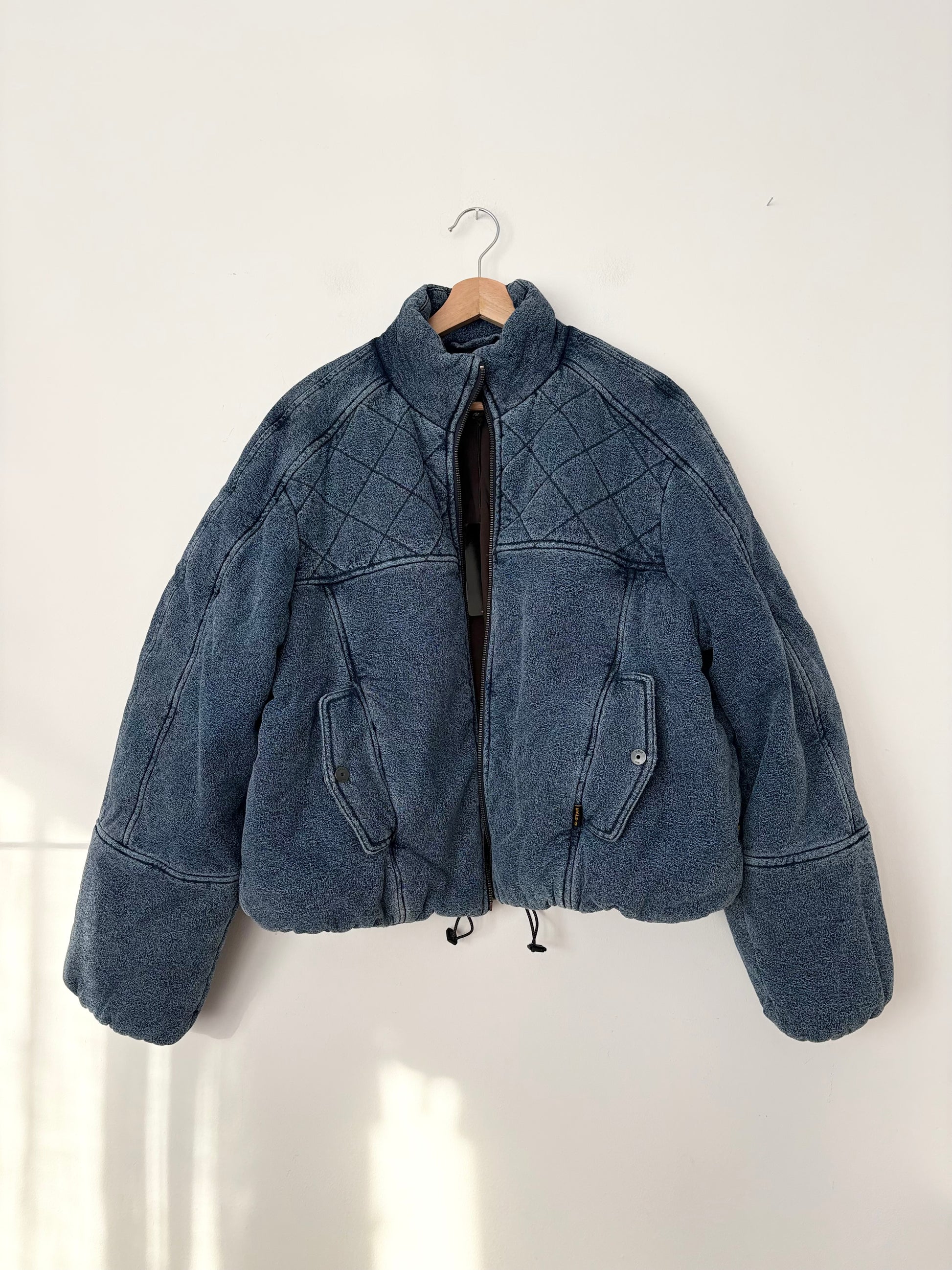 Le blouson bomber cocon est plus court et matelassé. Il présente un devant montant avec fermeture éclair, des poches à rabat à la taille et une fermeture à bouton-pression. Un cordon de serrage à la taille permet d'ajuster le volume.
