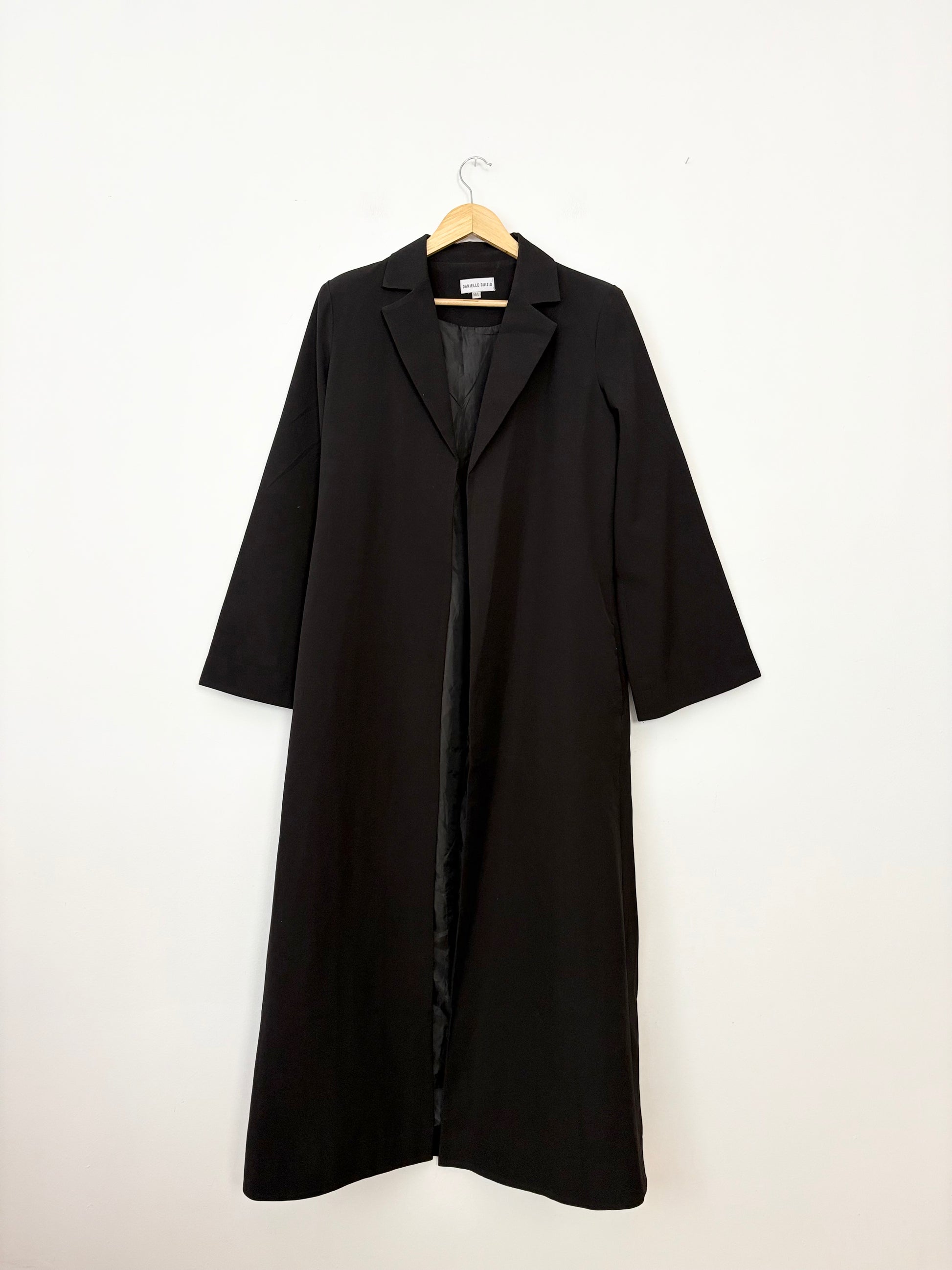 Manteau blazer long noir à col pointu, poches fendues et devant ouvert