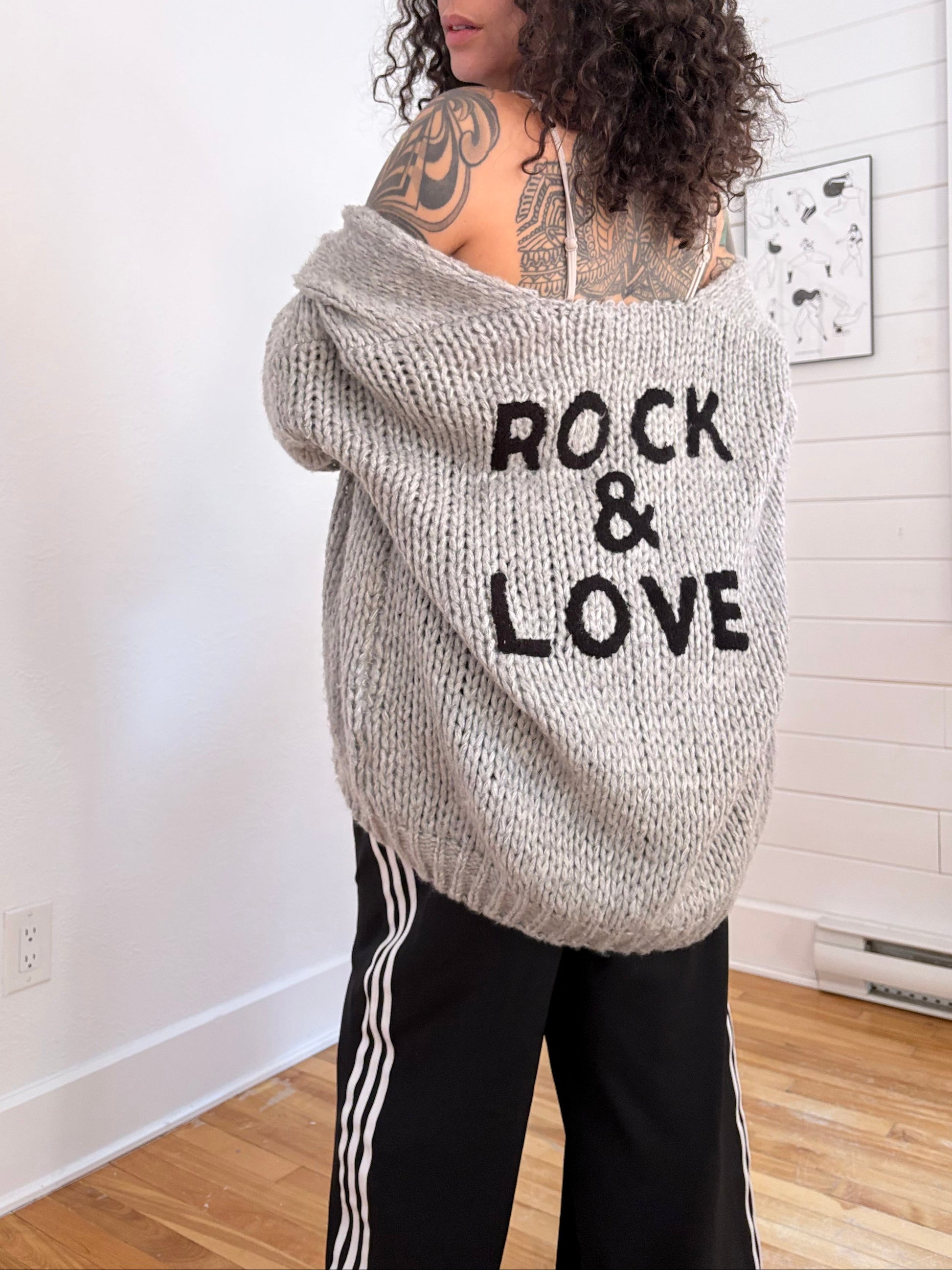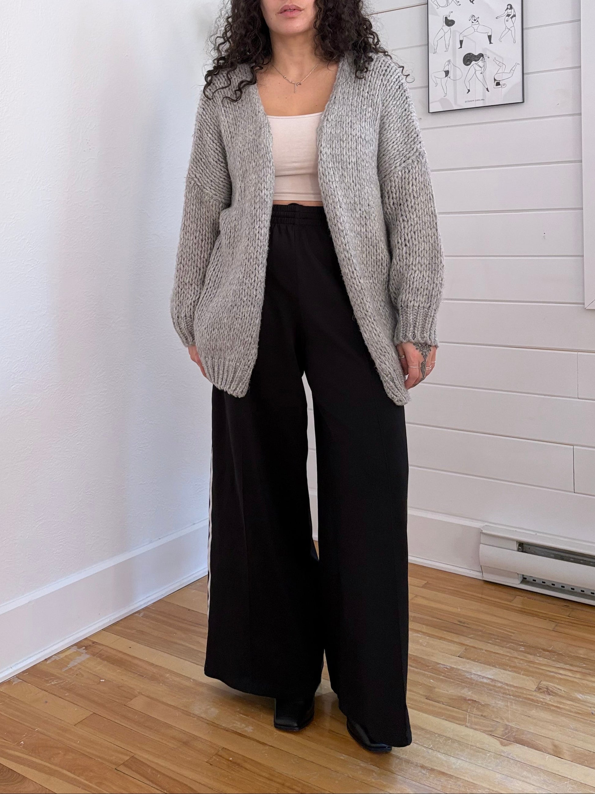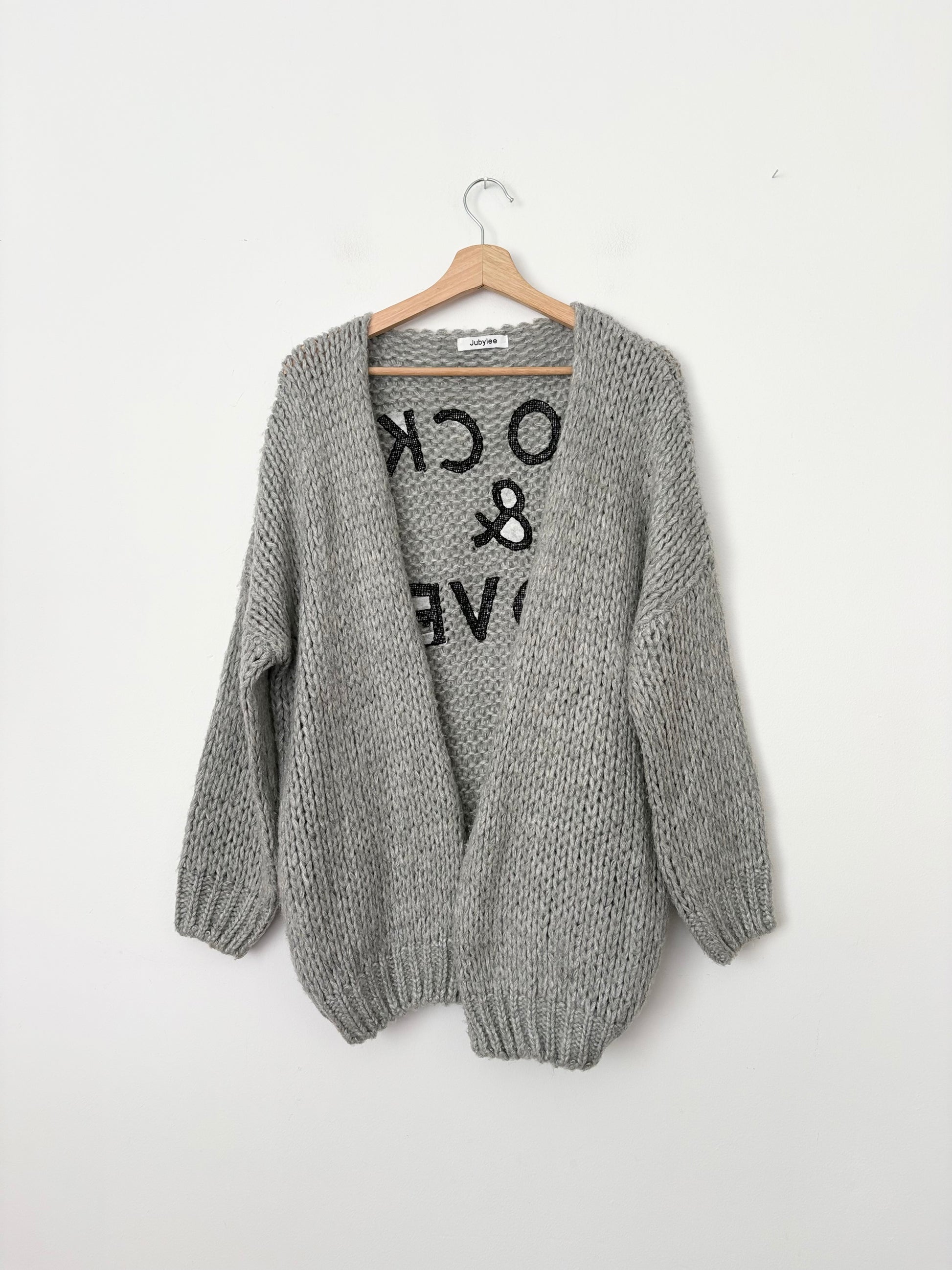 Gilet long gris en maille, ouvert sur le devant, avec broderie au dos