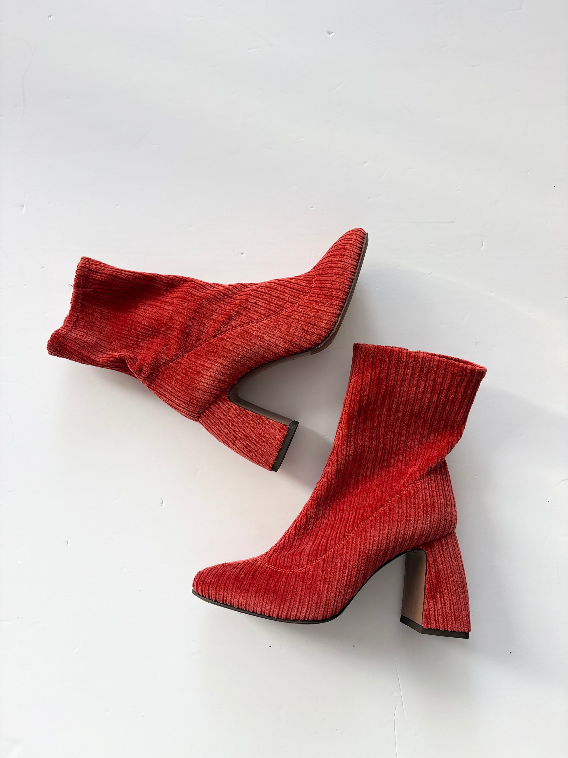 Bottines en velours côtelé couleur corail avec talon bloc arrondi