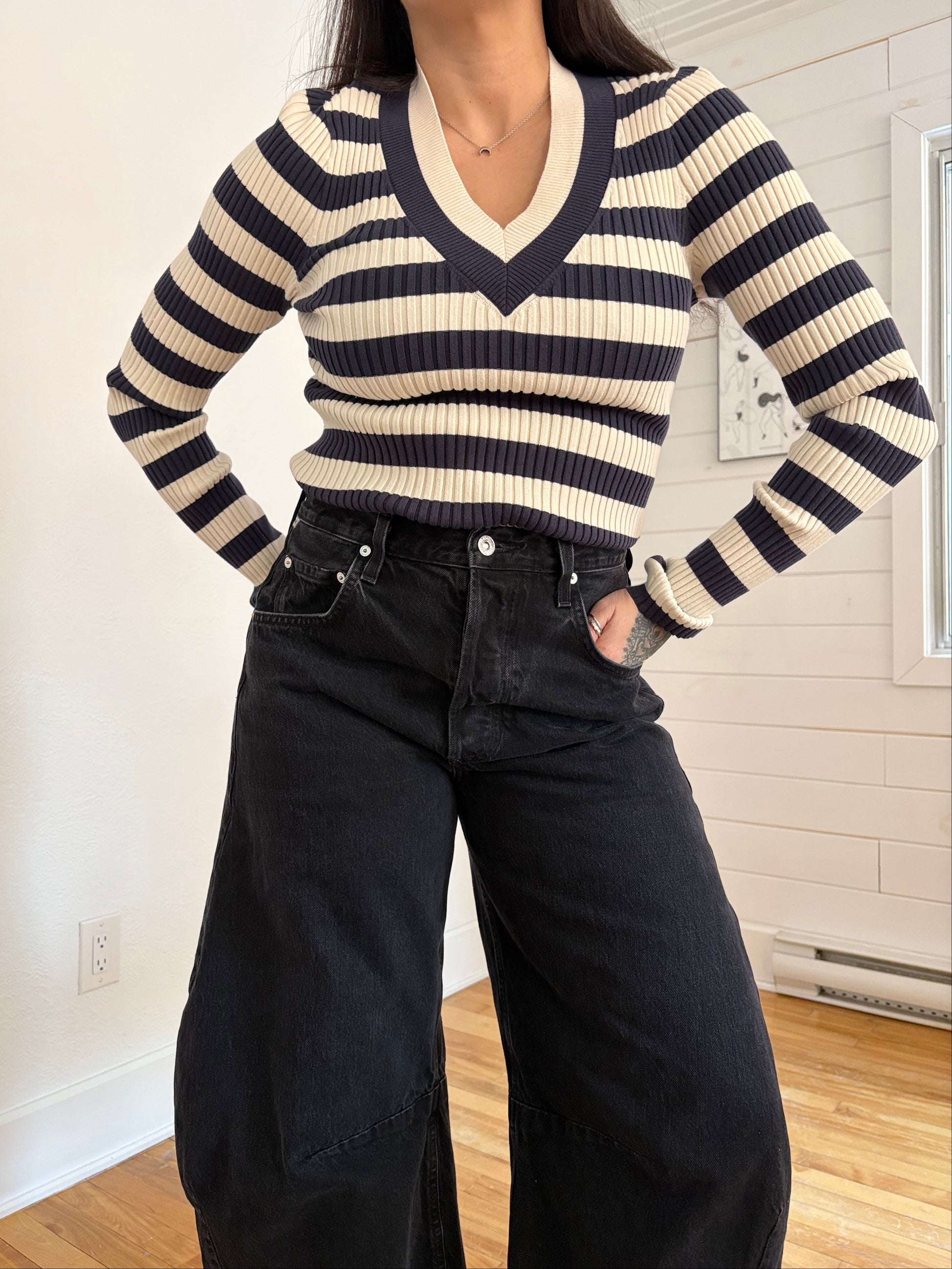 Ce pull rayé en coton mélangé léger présente un col en V. Il se marie parfaitement avec votre jean préféré pour un look élégant et décontracté.