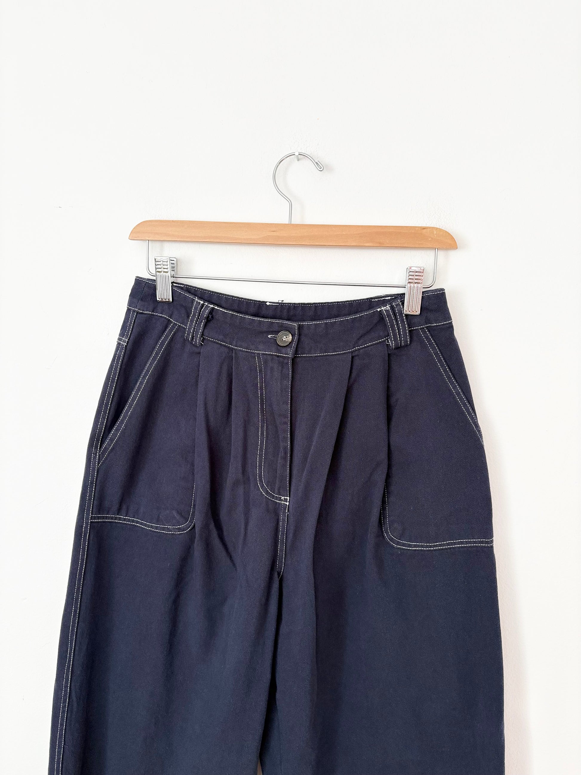 Jean bouffant bleu marine foncé avec surpiqûres contrastées