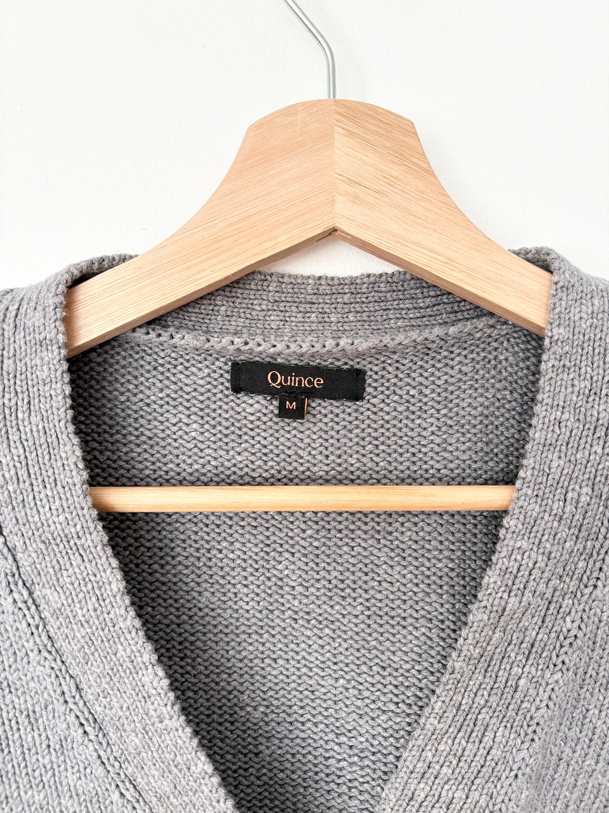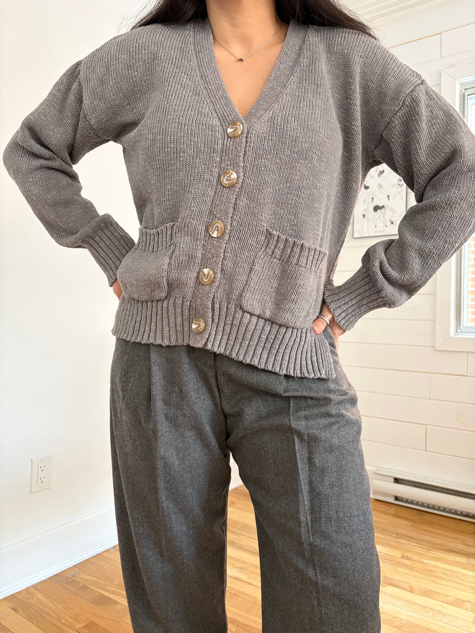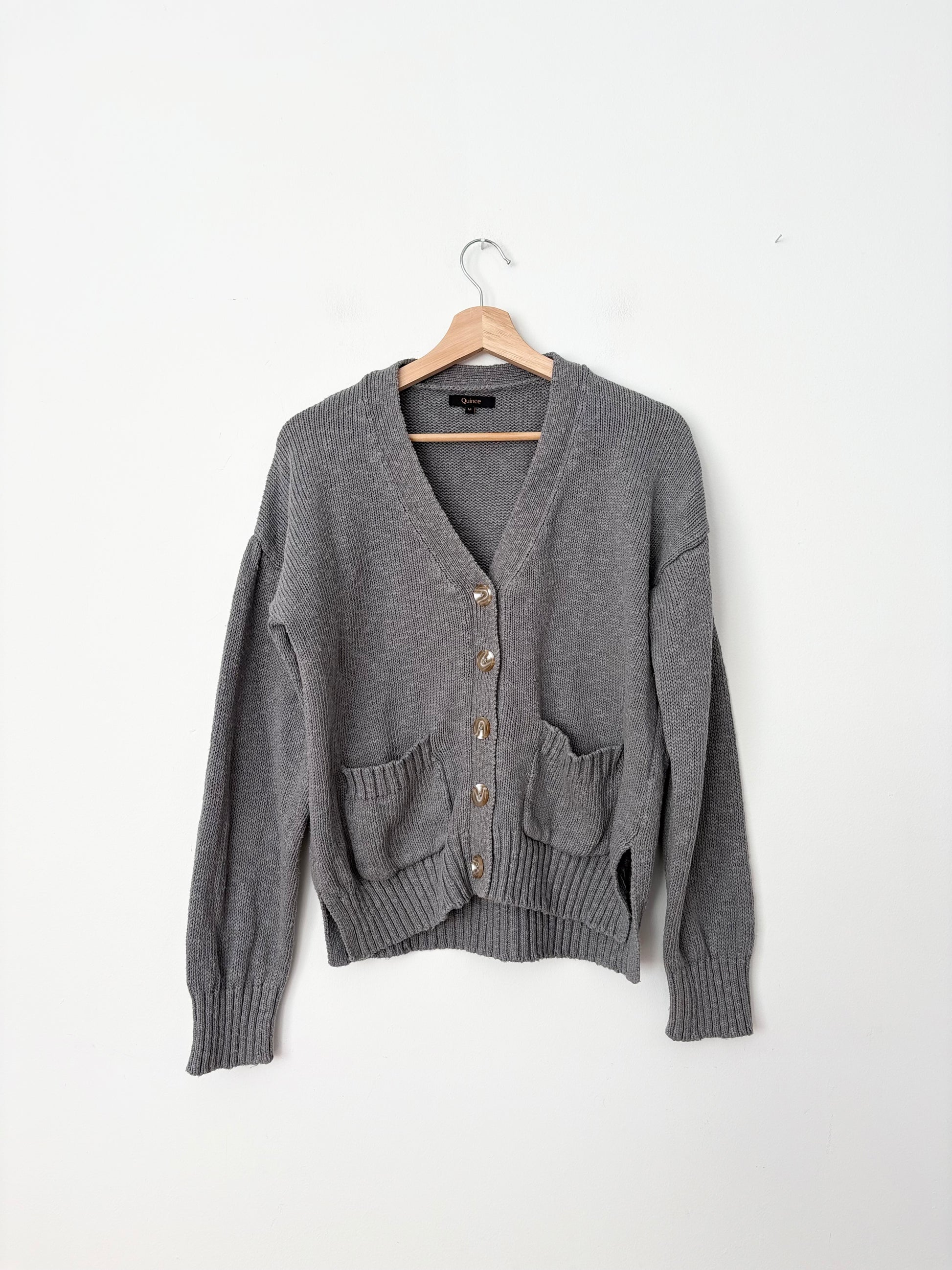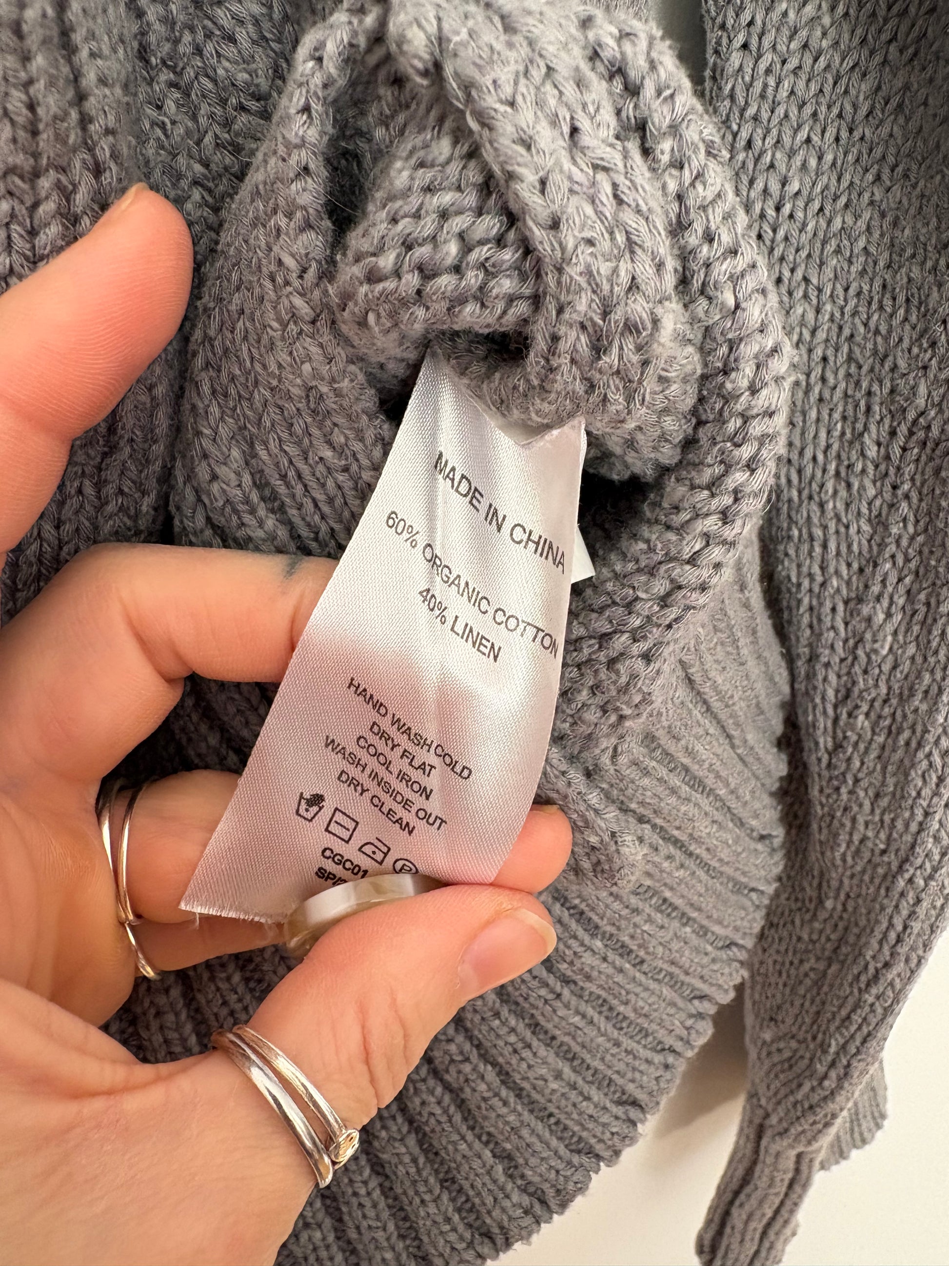 Cardigan boyfriend style pêcheur en lin mélangé, orné de gros boutons et de poches. Couleur bleu poudré tirant sur le gris bleuté.