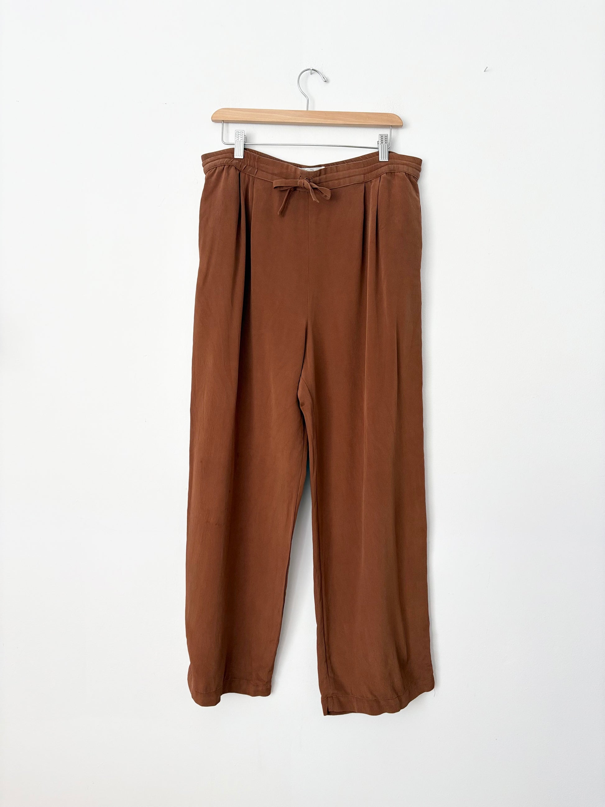 Pantalon large en soie marron avec taille élastiquée à cordon