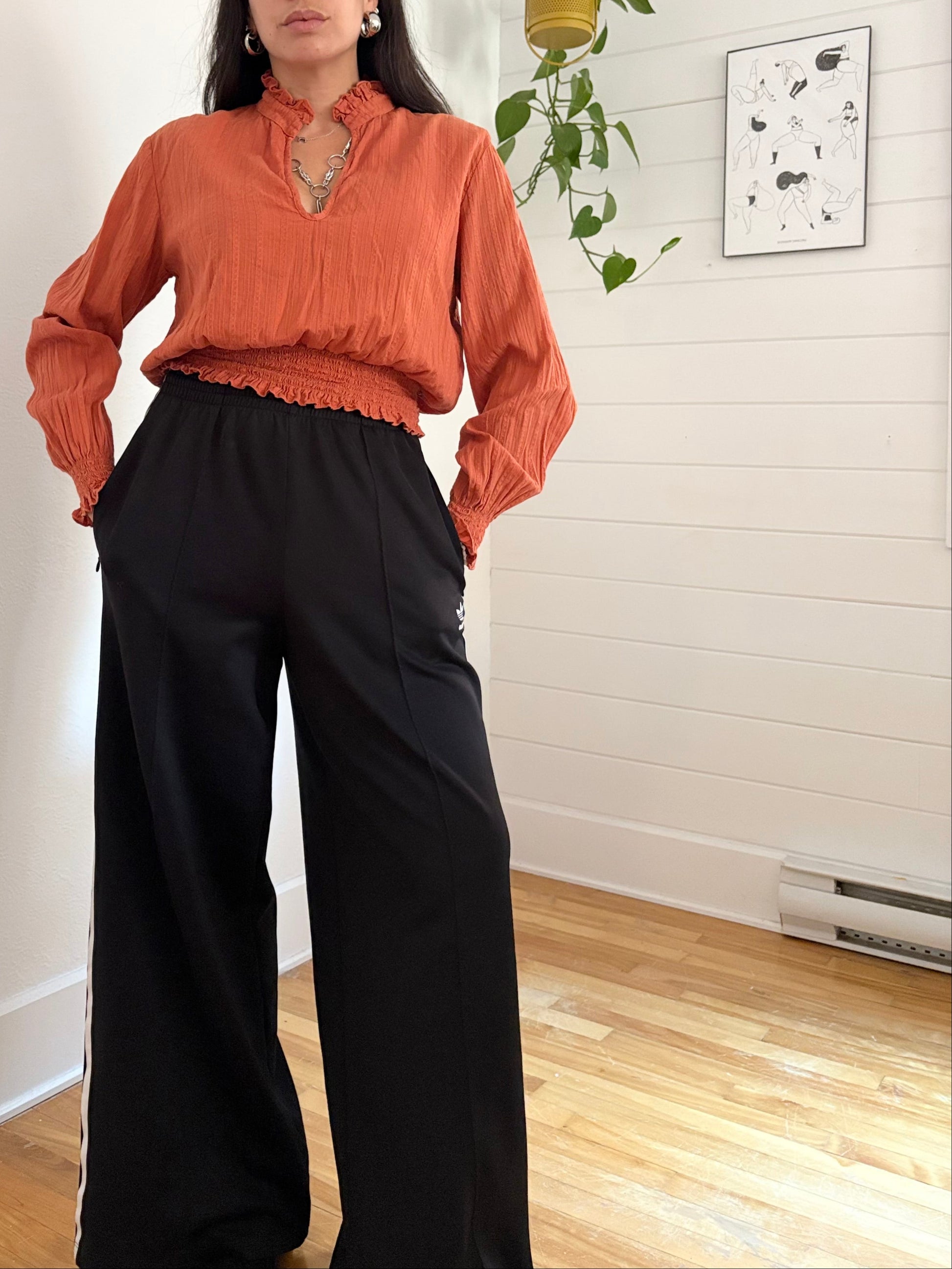 Chemisier à rayures brodées, col en V, ourlet smocké