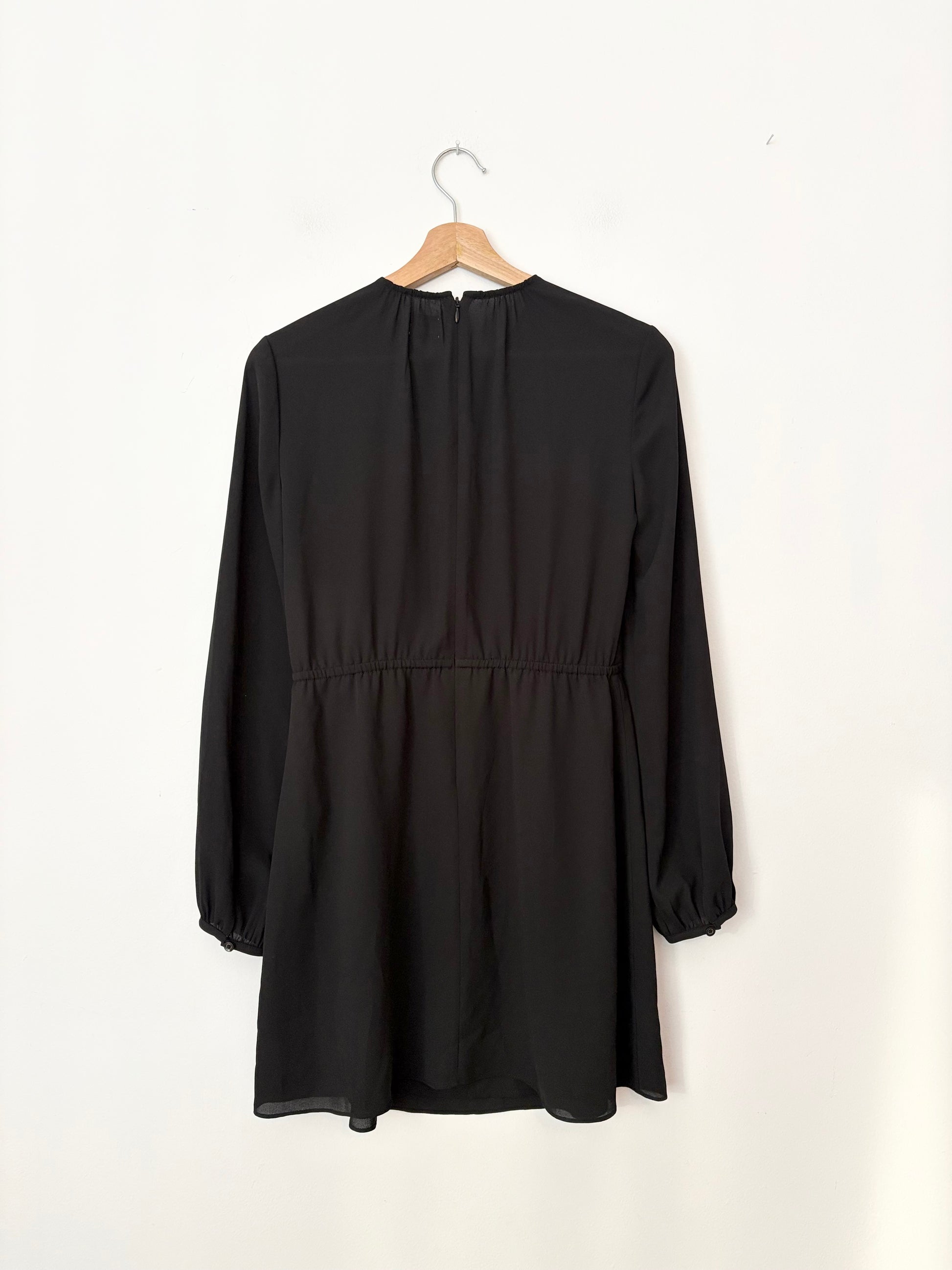 Robe en mousseline noire semi-transparente, taille élastiquée et manches bouffantes. Devant et jupe doublés.