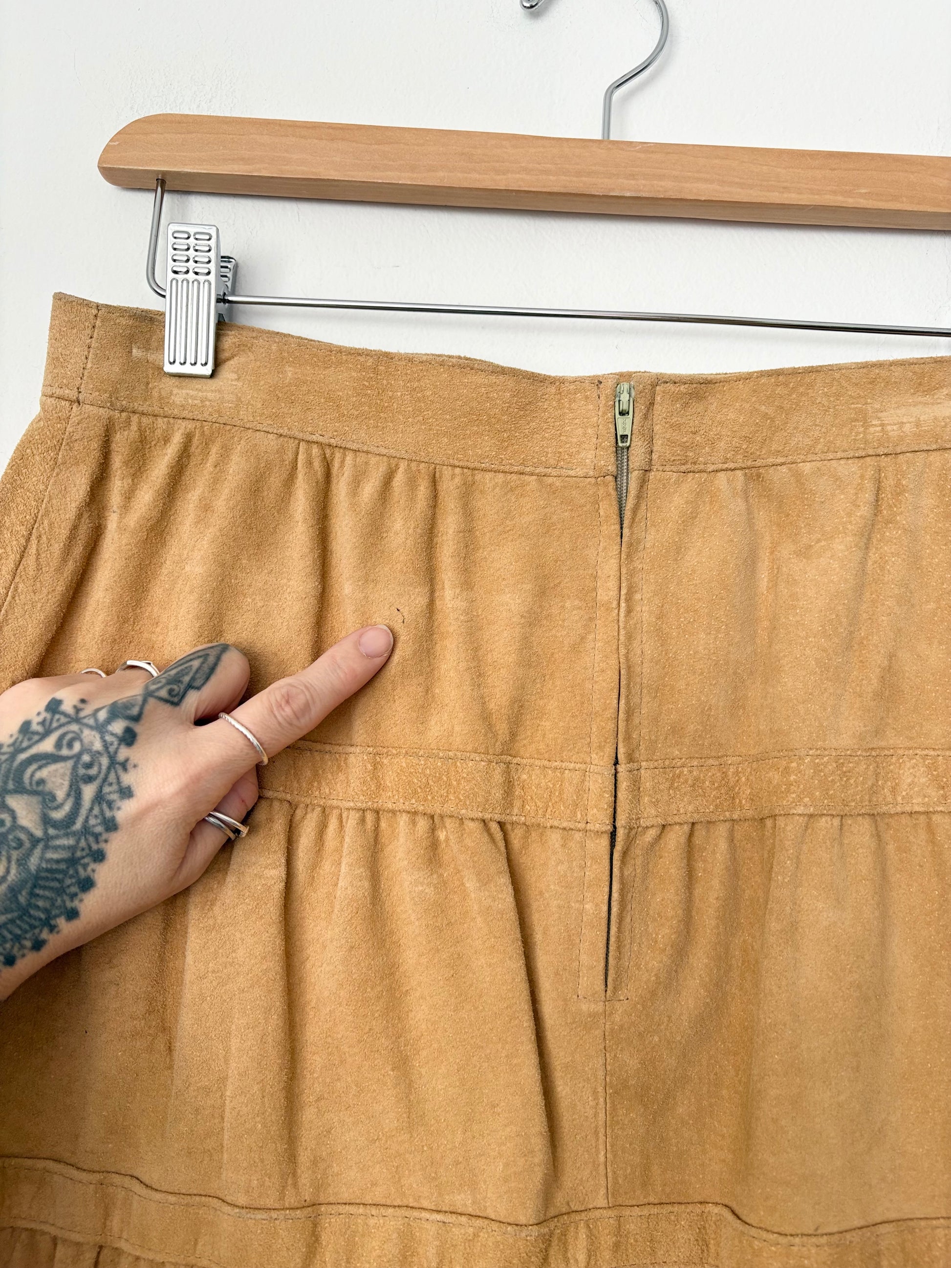 Jupe midi vintage en daim véritable à volants, taille XS/S