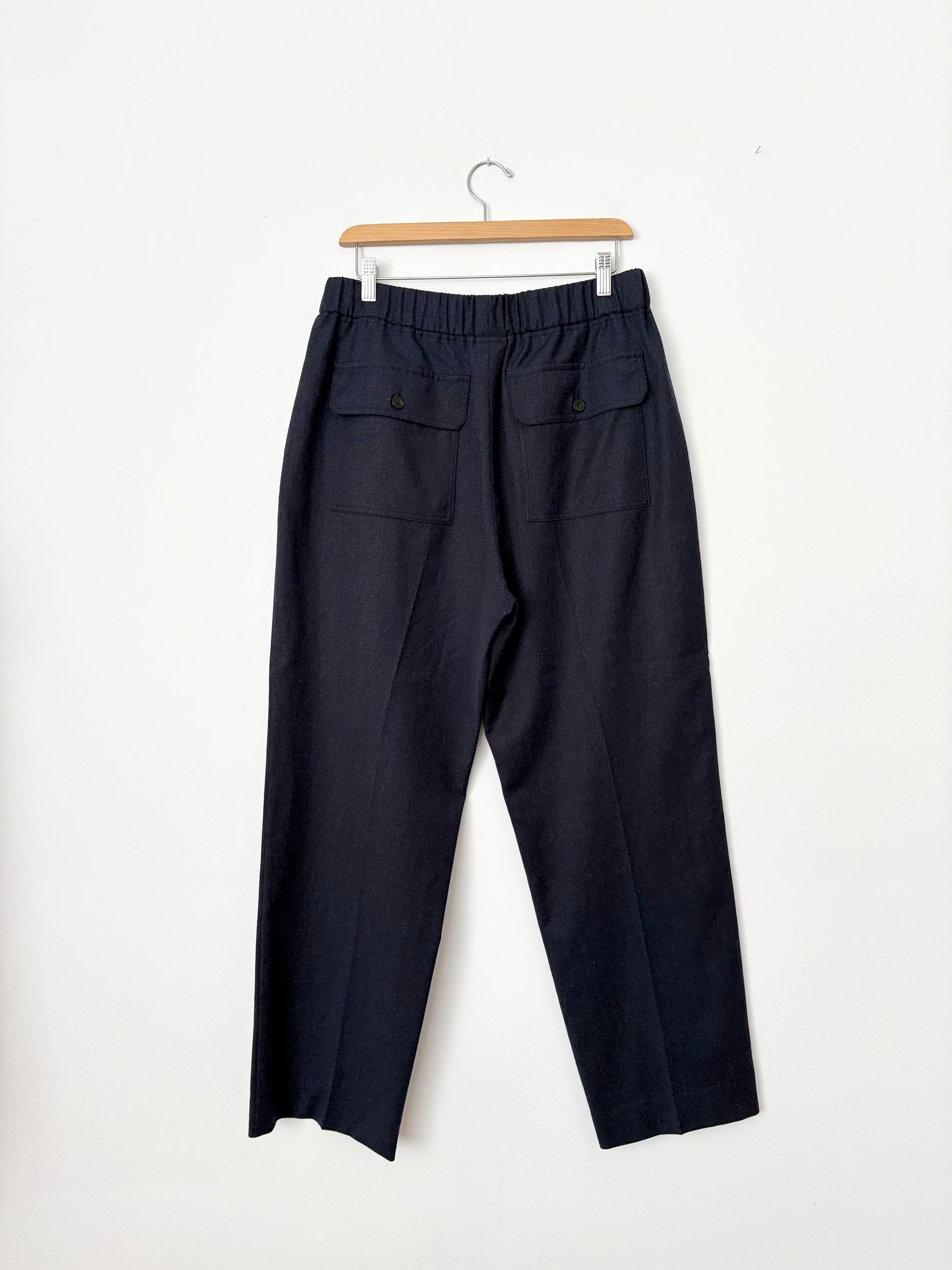 Pantalon court en flanelle de laine stretch bleu marine foncé, longueur cheville, taille élastiquée, poches latérales en biais et grandes poches plaquées à rabat et bouton à l'arrière.