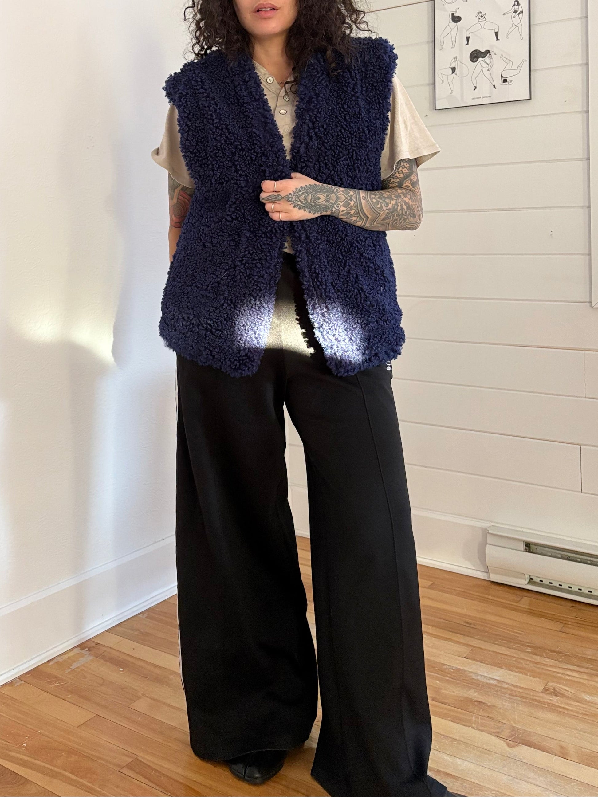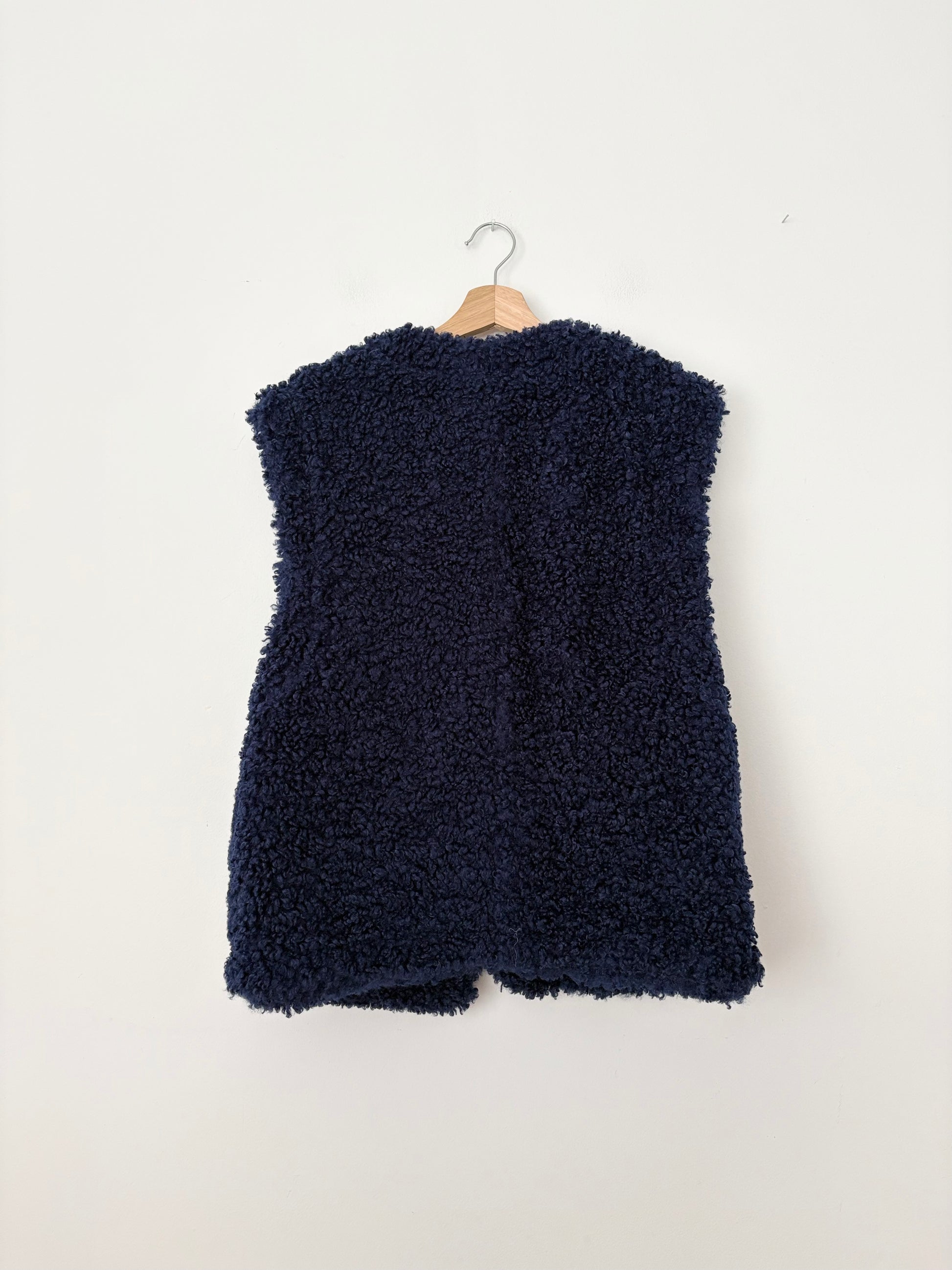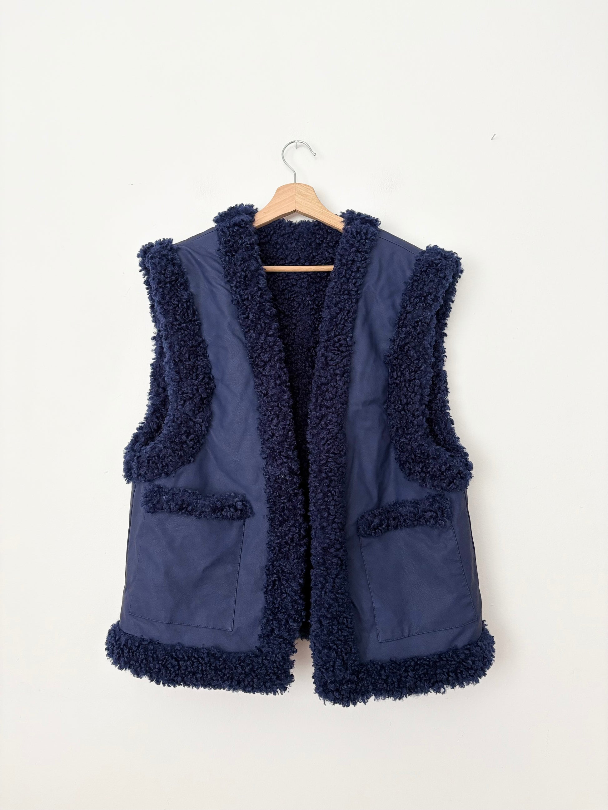 Une pièce polyvalente et élégante à superposer, d'un bleu marine profond et à la coupe oversize. Un côté est en sherpa doux et confortable pour un effet texturé et moelleux, tandis que l'autre côté offre une finition lisse en similicuir avec des bordures en sherpa.
