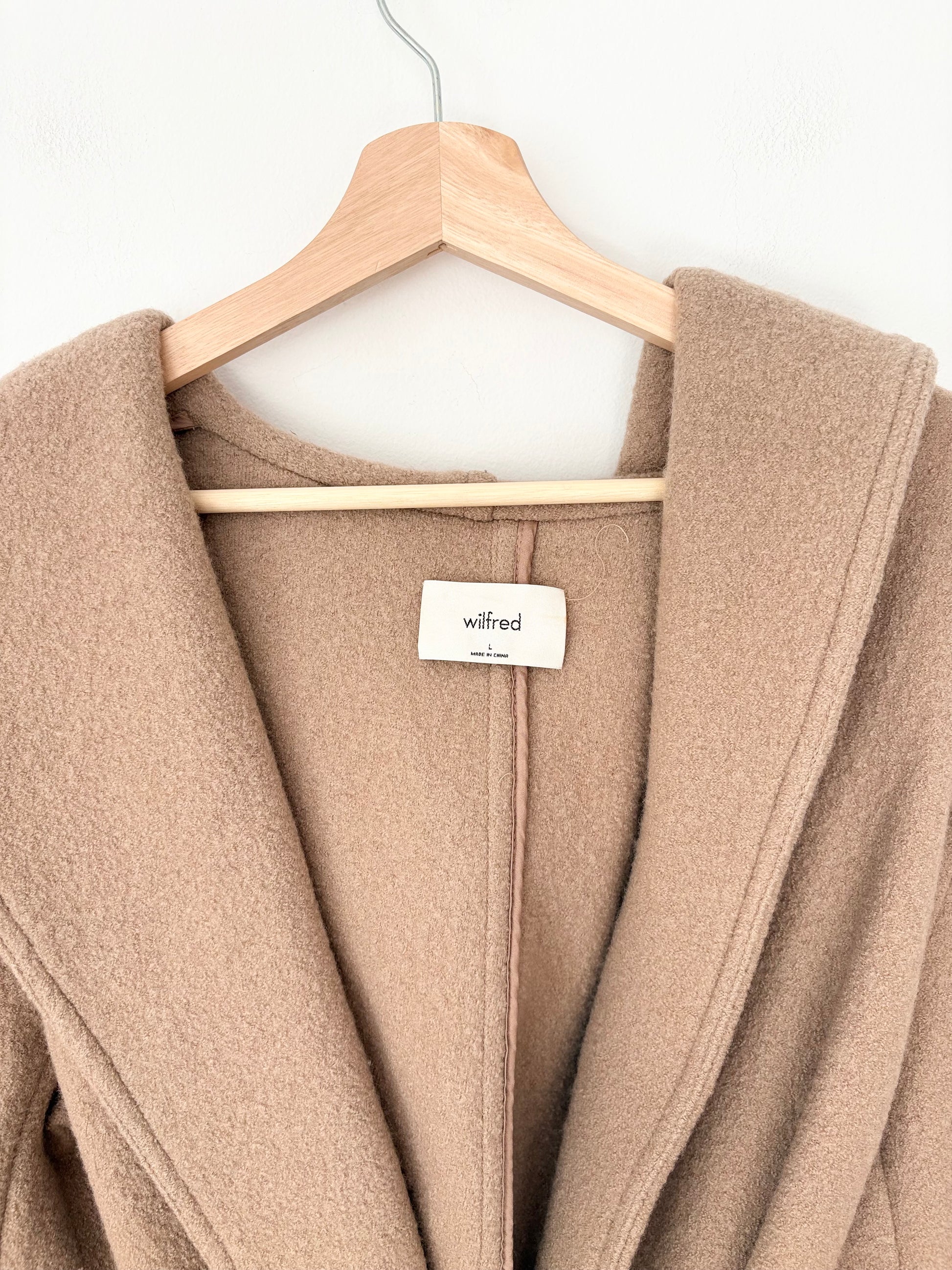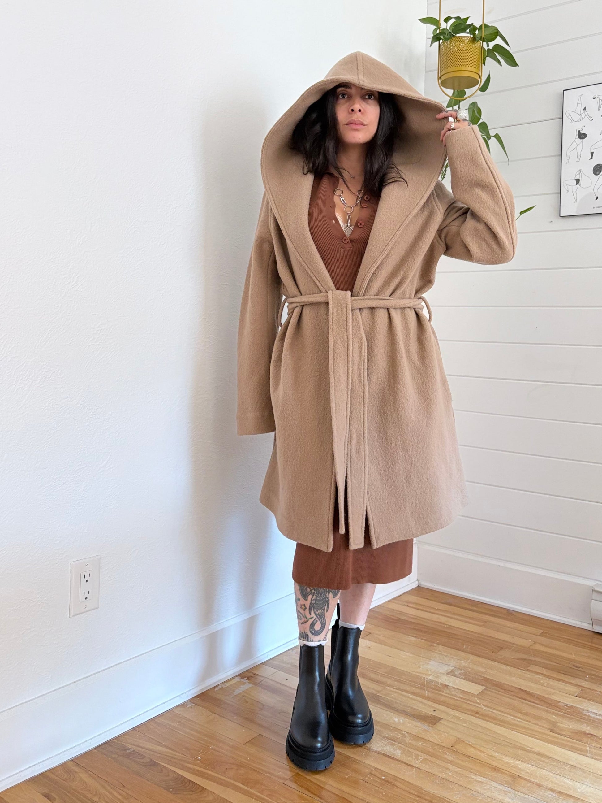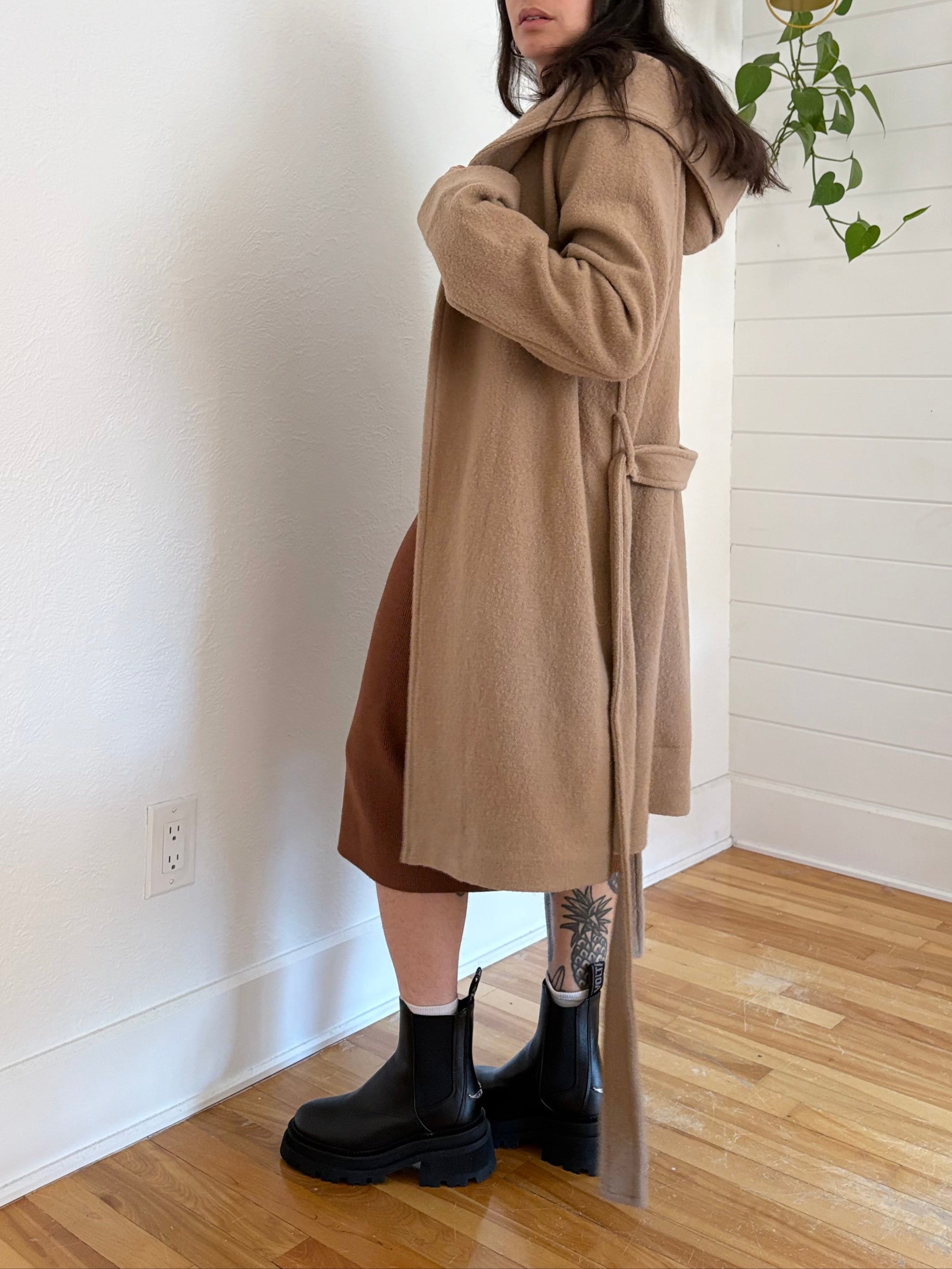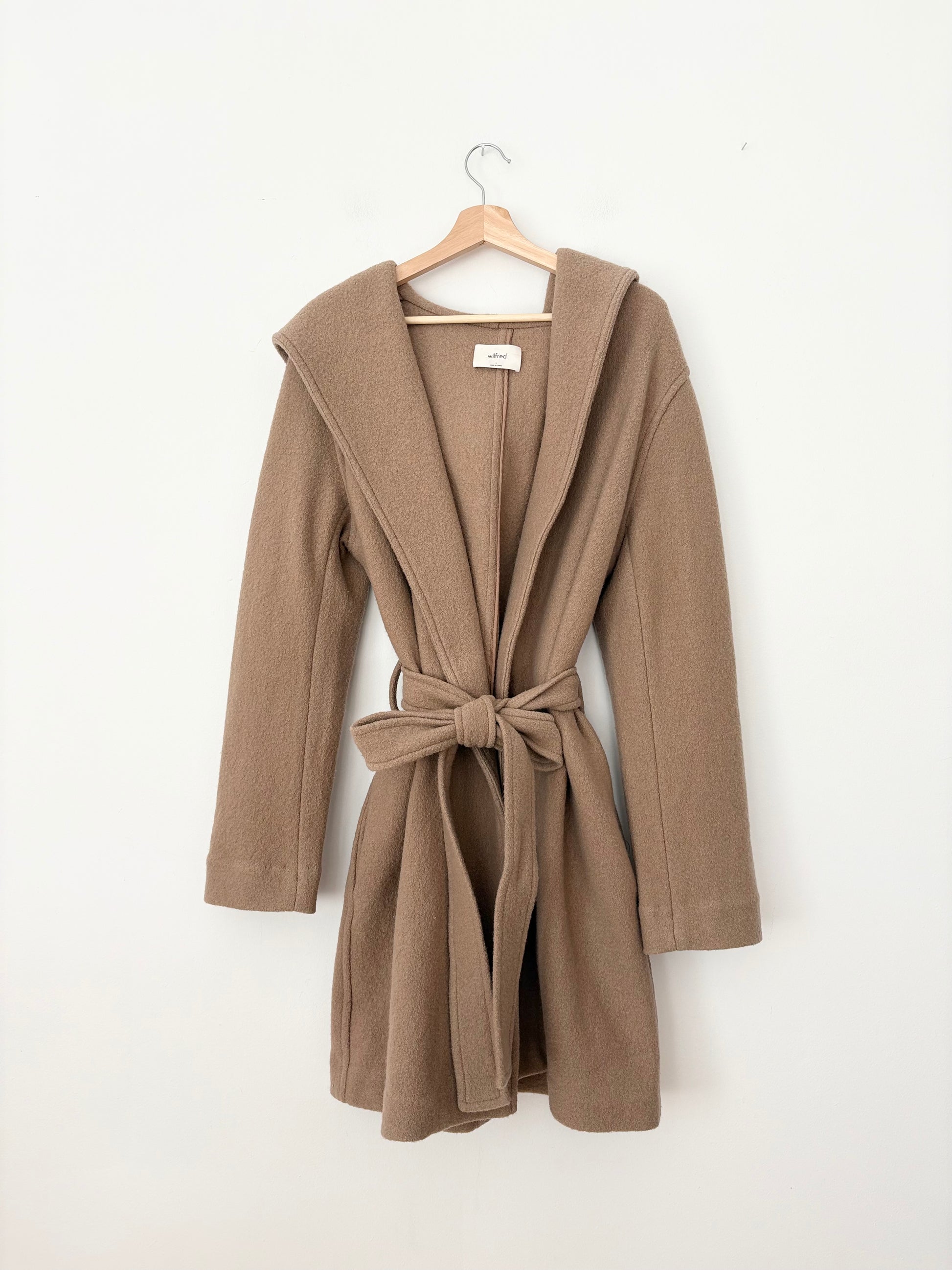 Cette veste-peignoir à capuche est dotée d'une ceinture amovible et de poches intérieures. Elle est confectionnée en laine mérinos bouillie, douce, dense et texturée.