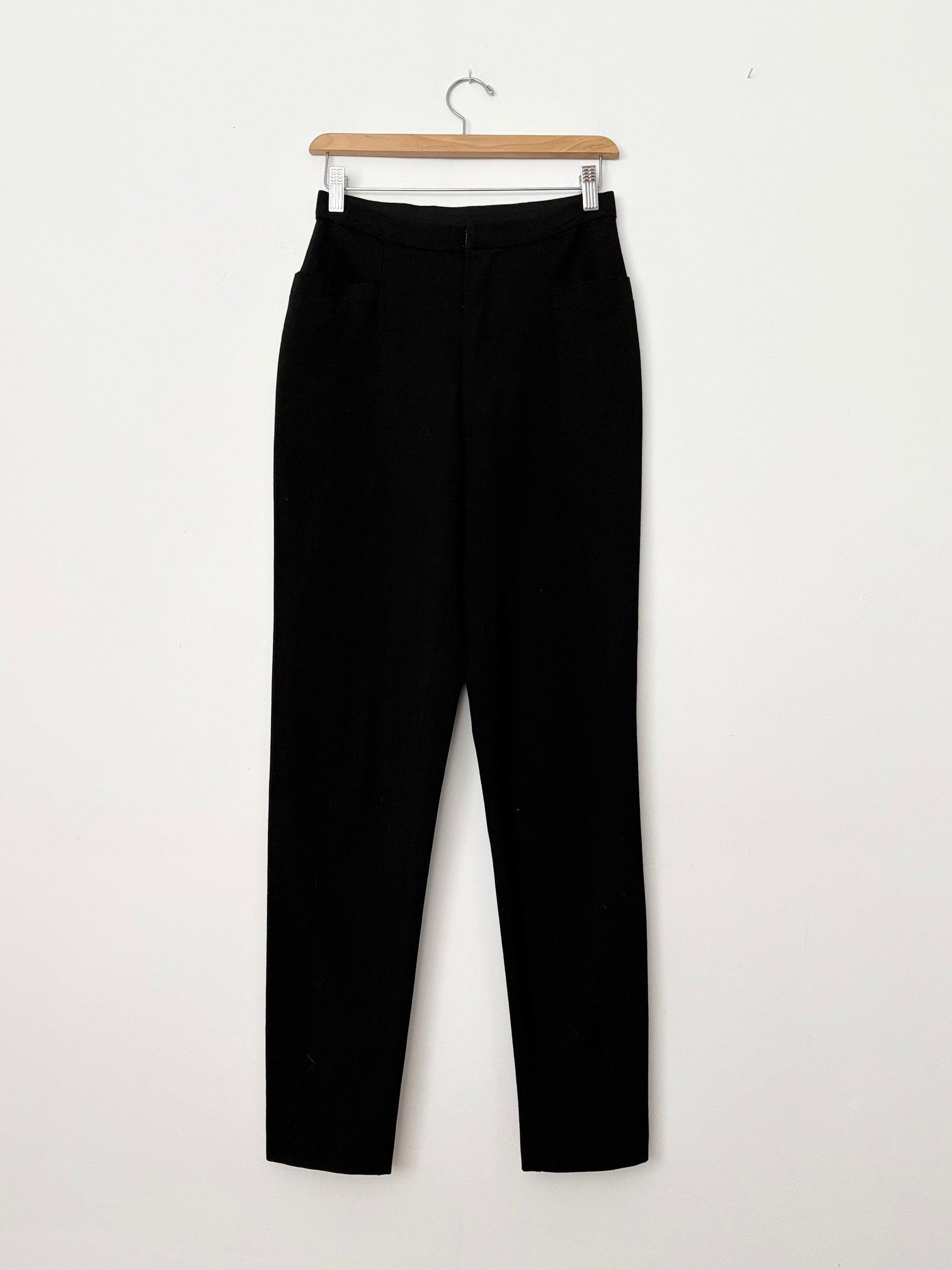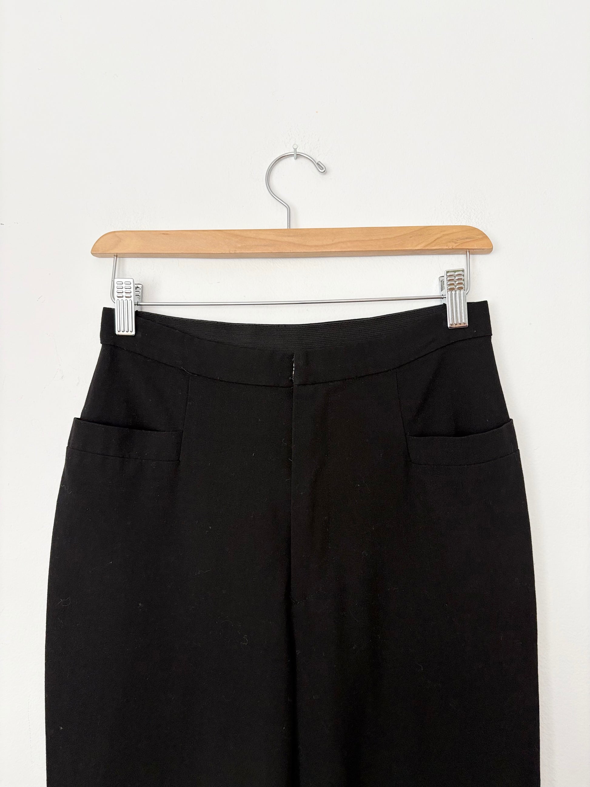 Pantalon legging noir vintage fabriqué au Canada, avec taille élastique et poches carrées sur le devant.