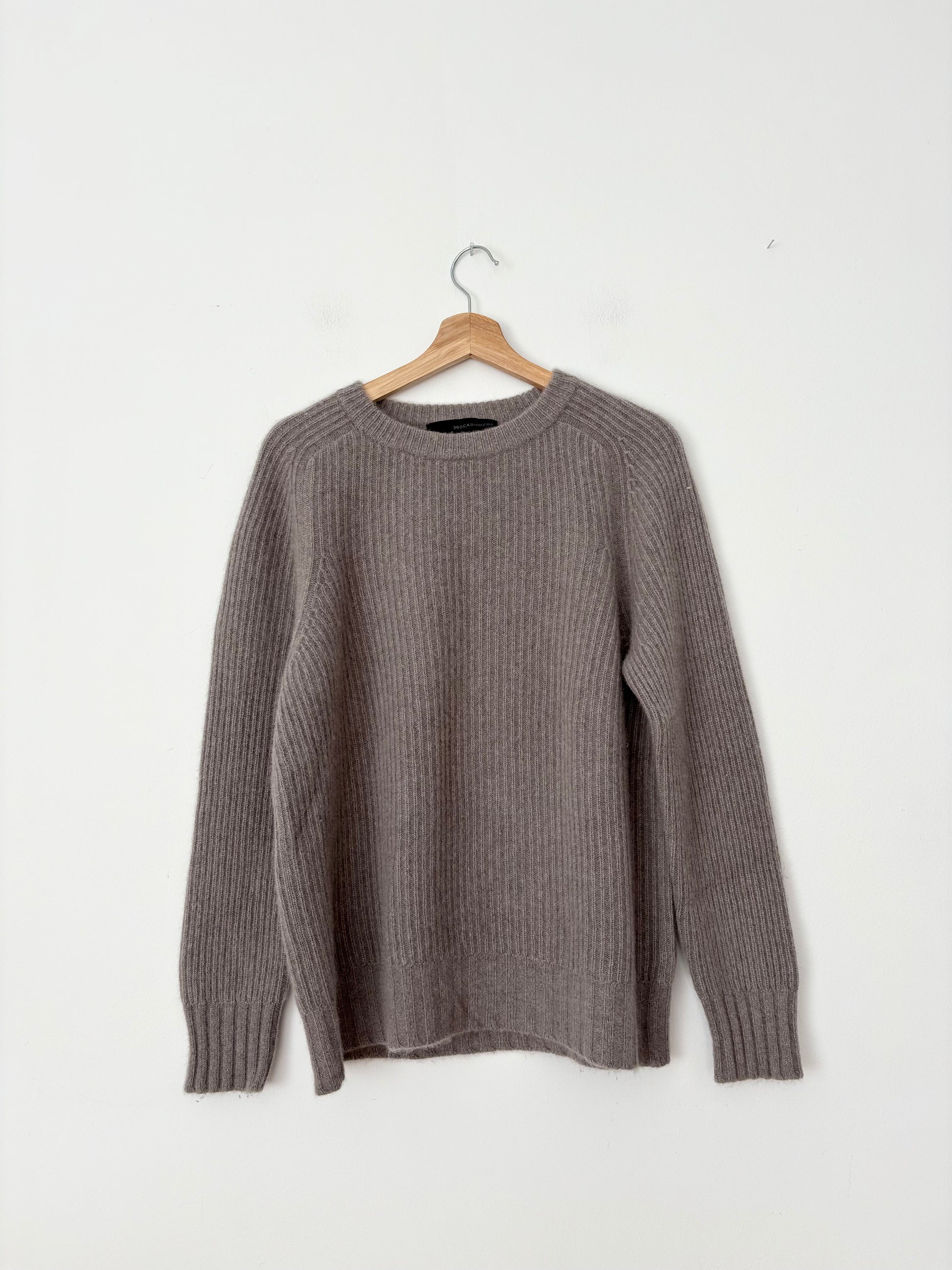 Grey ribbed in the softest cashmere, round neckline and boxy fit.