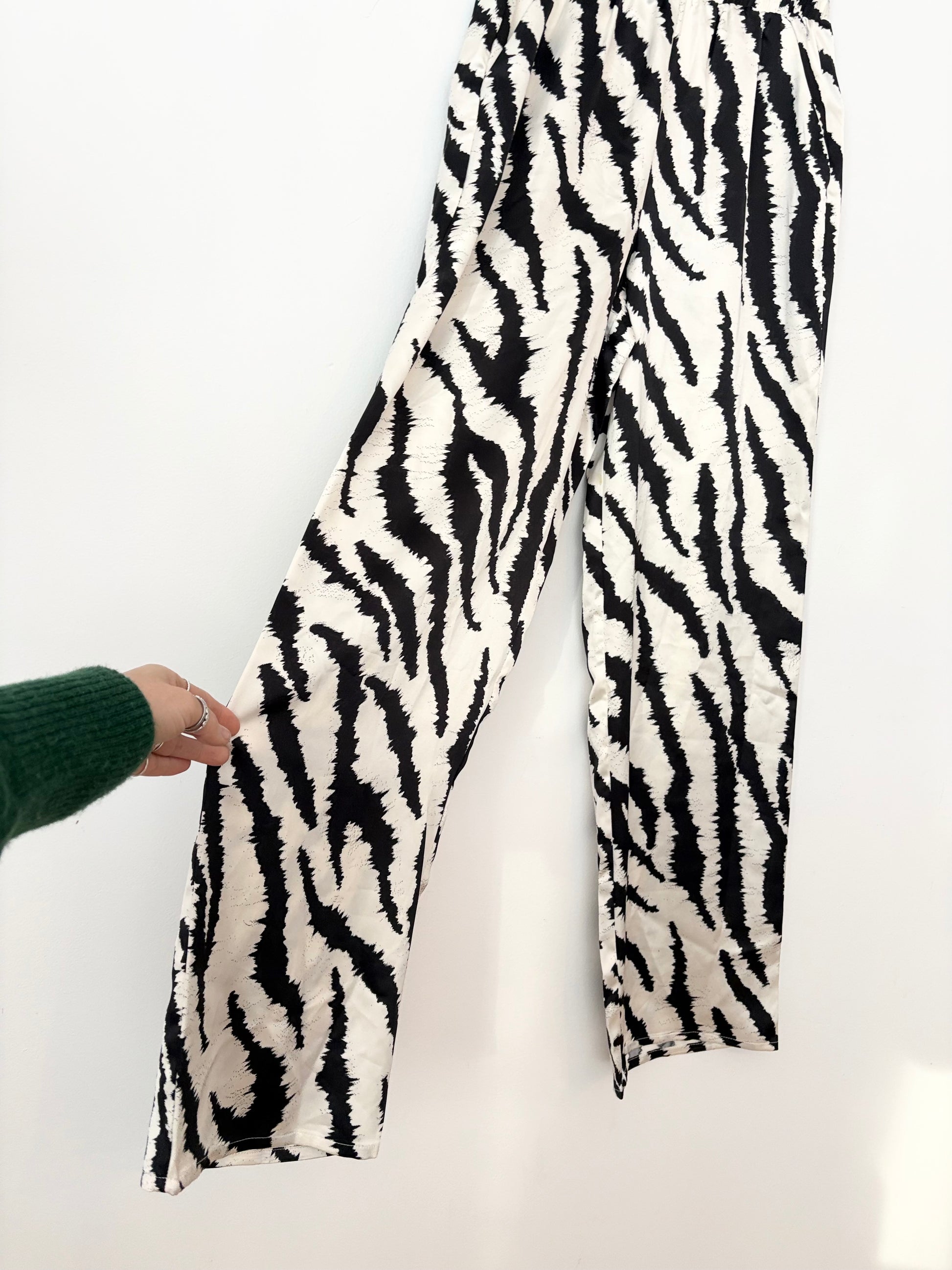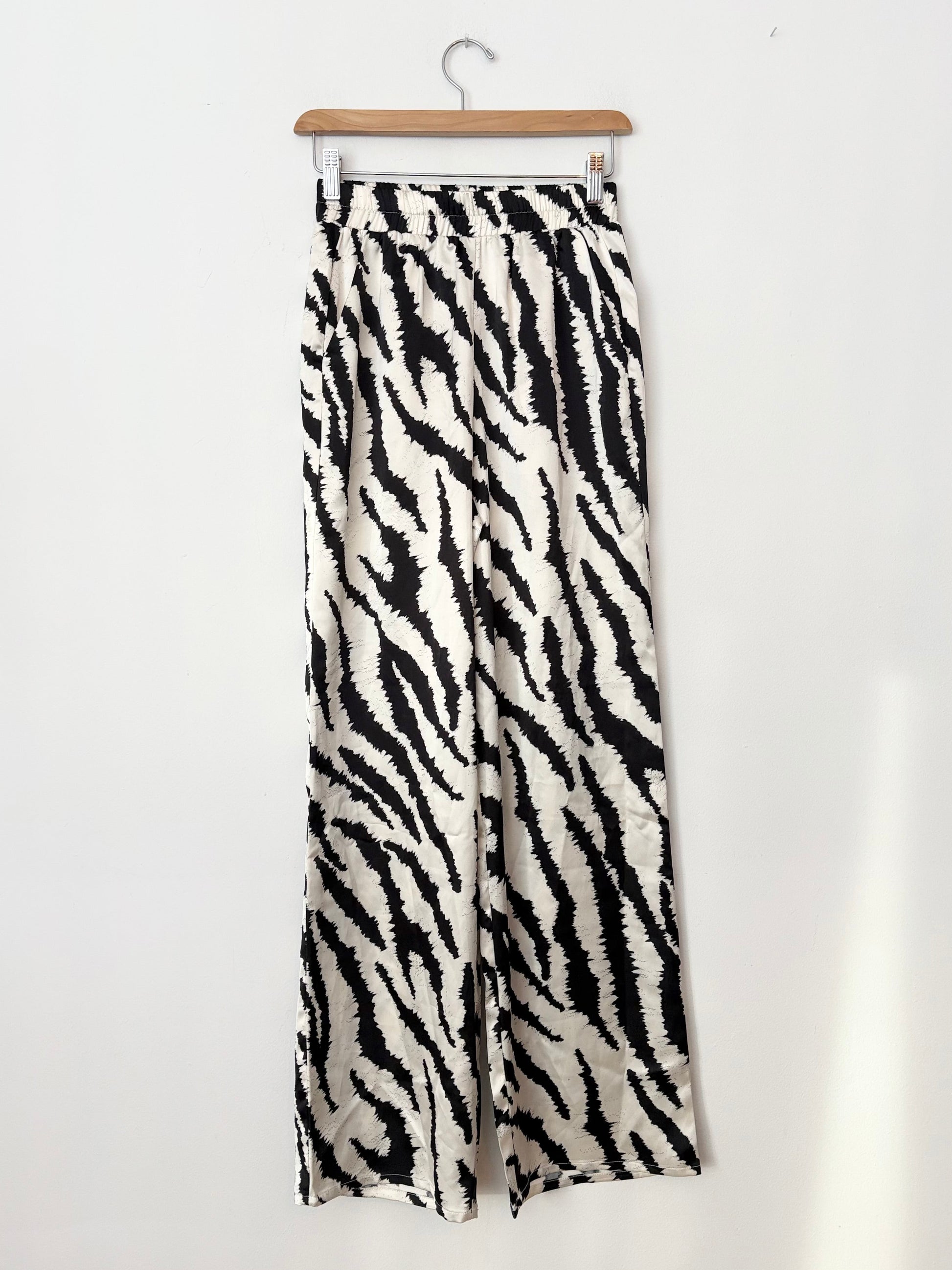Wide leg satin pants in zebra print with elastic waist