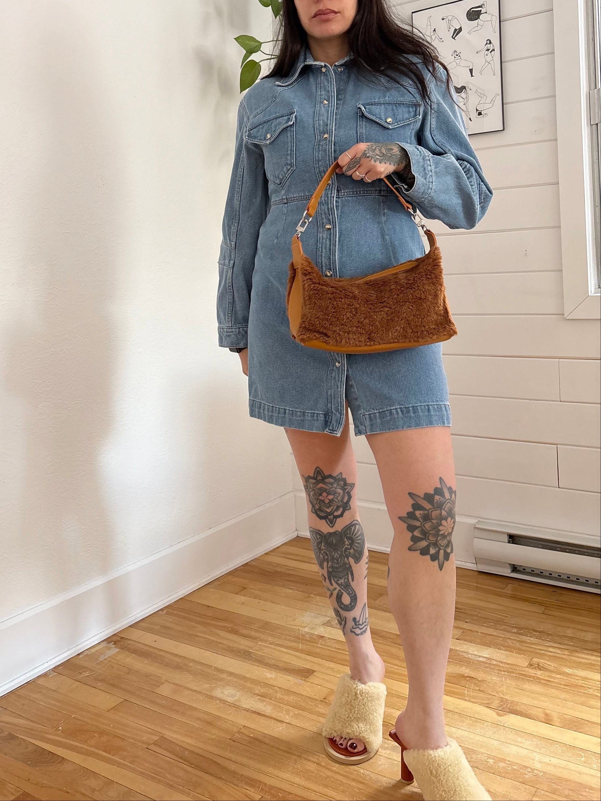 Brown faux fur bag featuring silver hardware, top zipper & inside pocket.