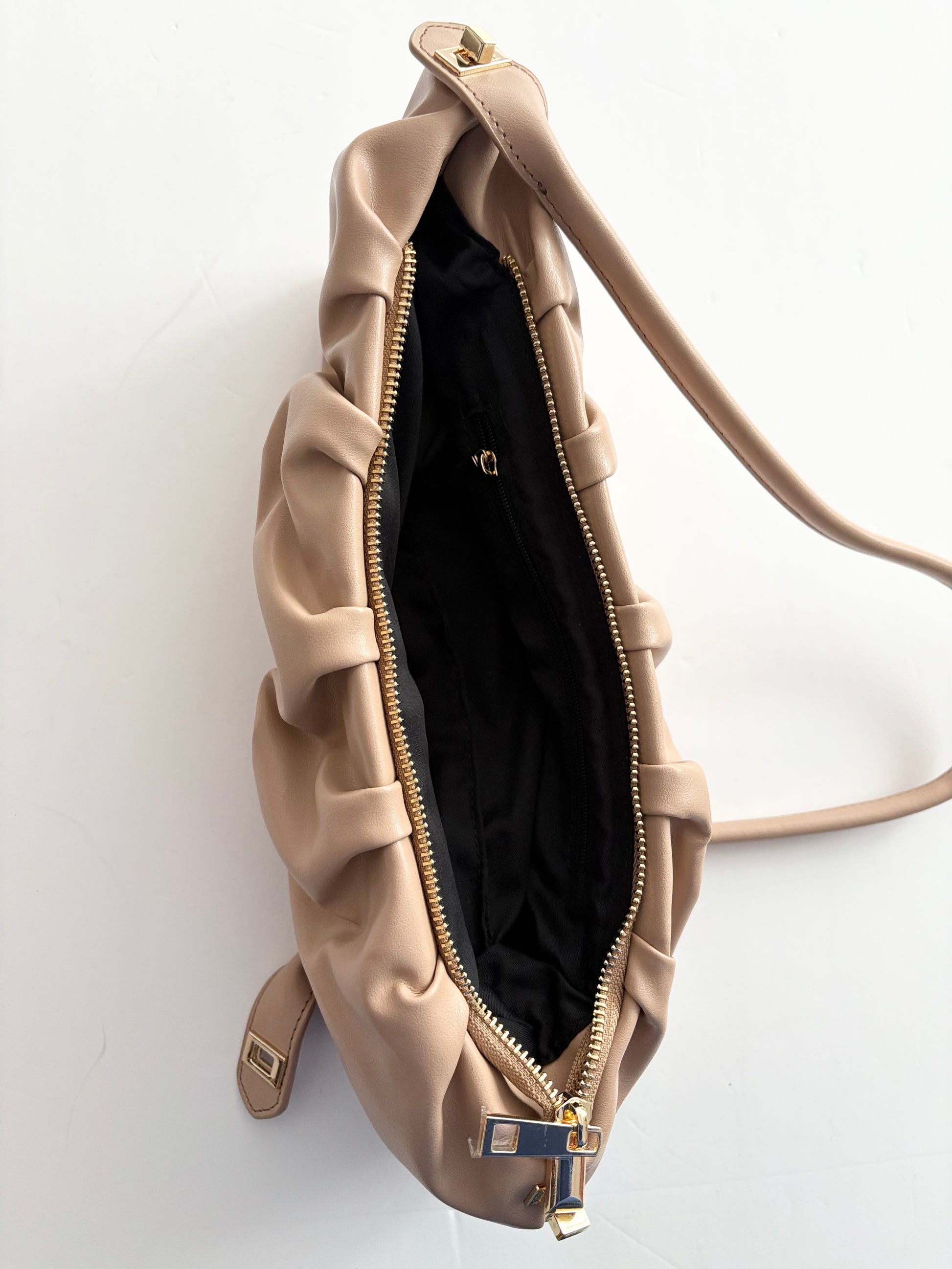 Faux leather ruched exterior with twill lining, top zipper closure and detachable tubular shoulder strap with gold-tone turn lock closures.