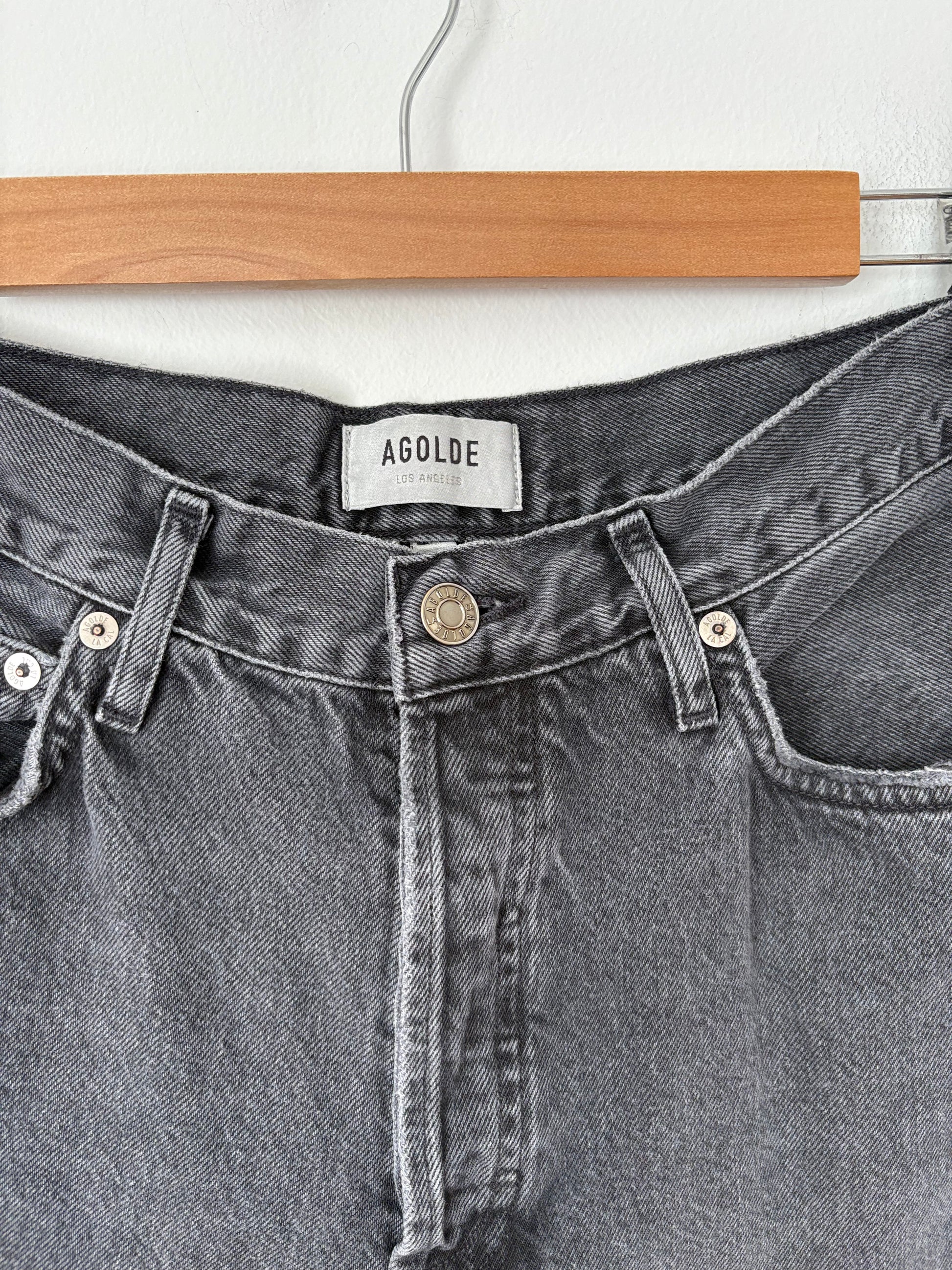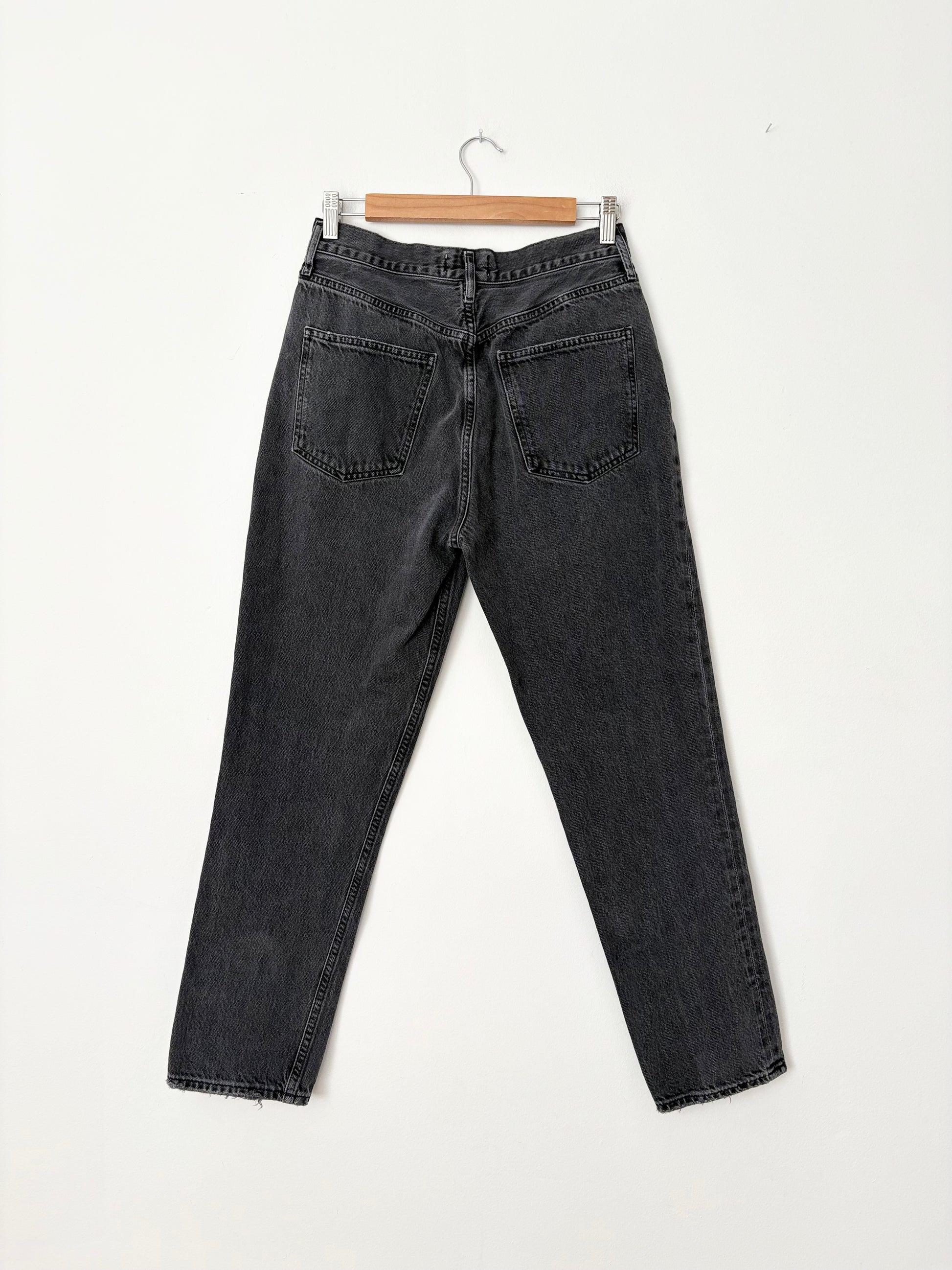 These are high-rise jeans with a relaxed fit and gently tapered leg. They're cut from lightweight, non-stretch denim that's soft to the touch.