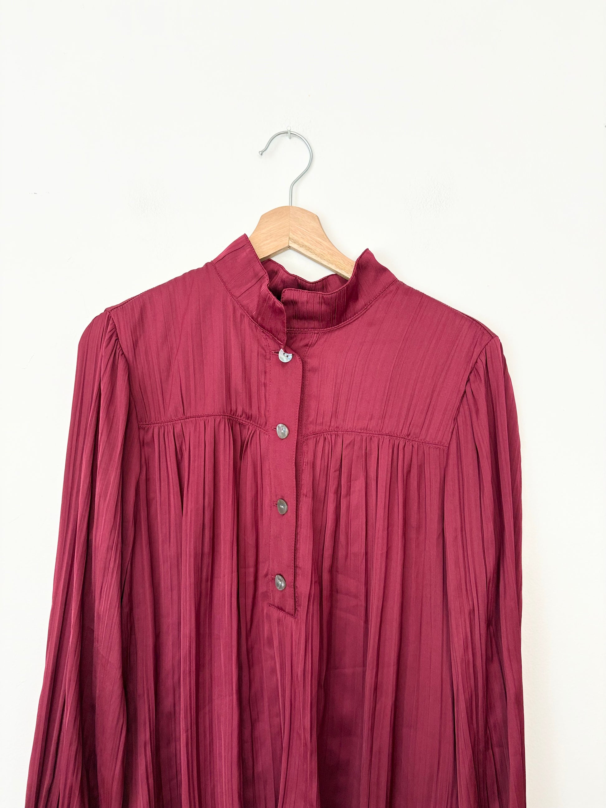 Henley style button front pleated satin blouse in a deep burgundy hue