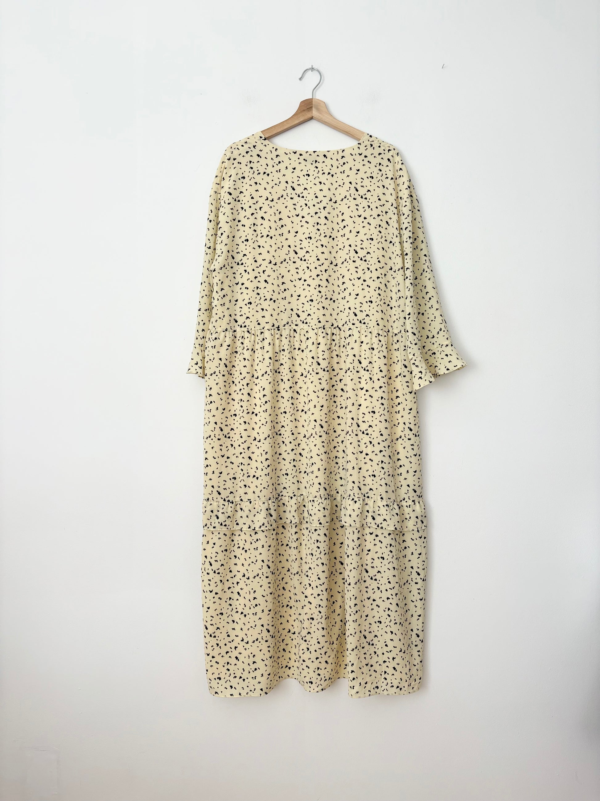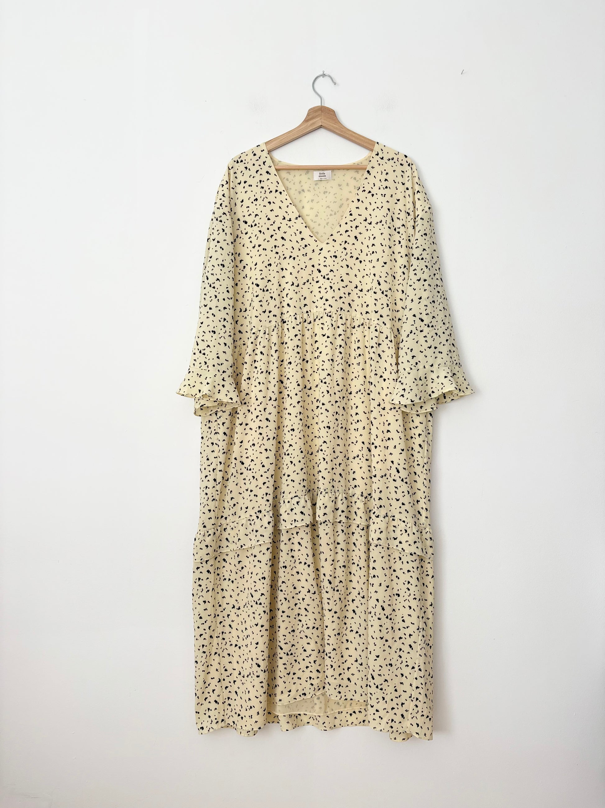 The dress features an oversized, tiered midi silhouette with ruffled layers that create airy volume and movement, has a V-neckline, 3/4 sleeves, and is designed as a pullover with a relaxed fit.