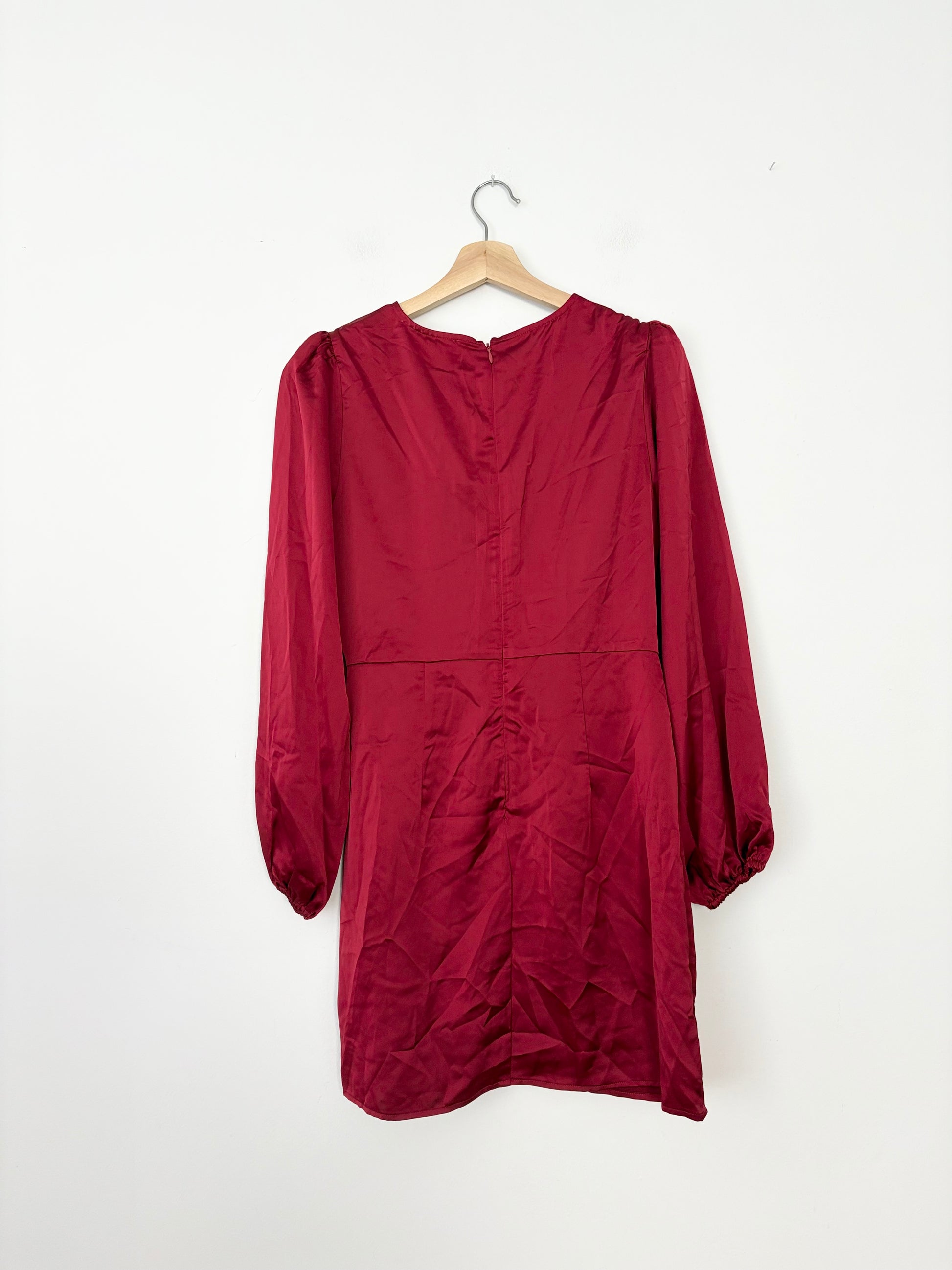 Voluminous balloon sleeves frame this satin mini dress designed with a draped wrap-style skirt that ties at the waist.