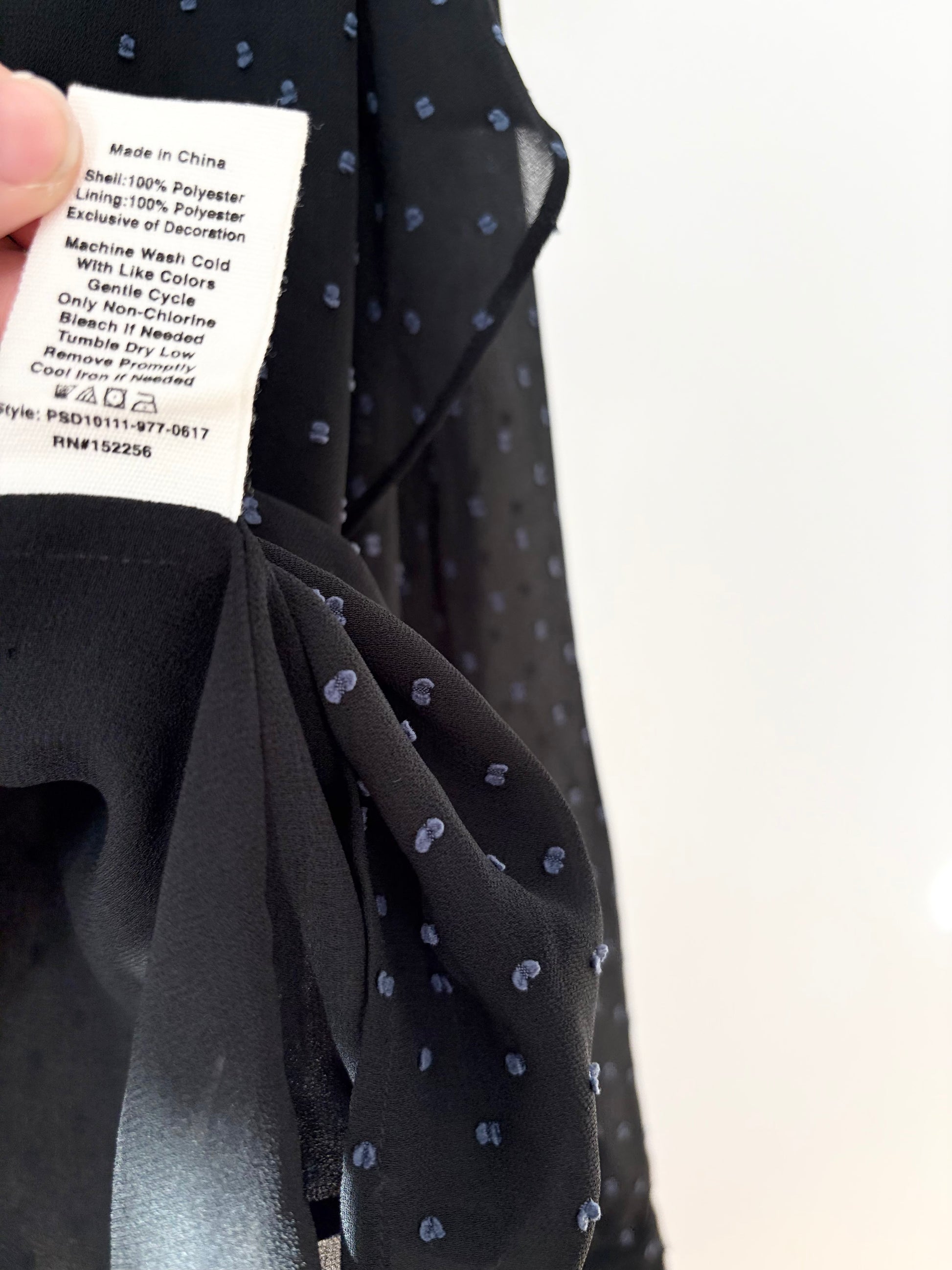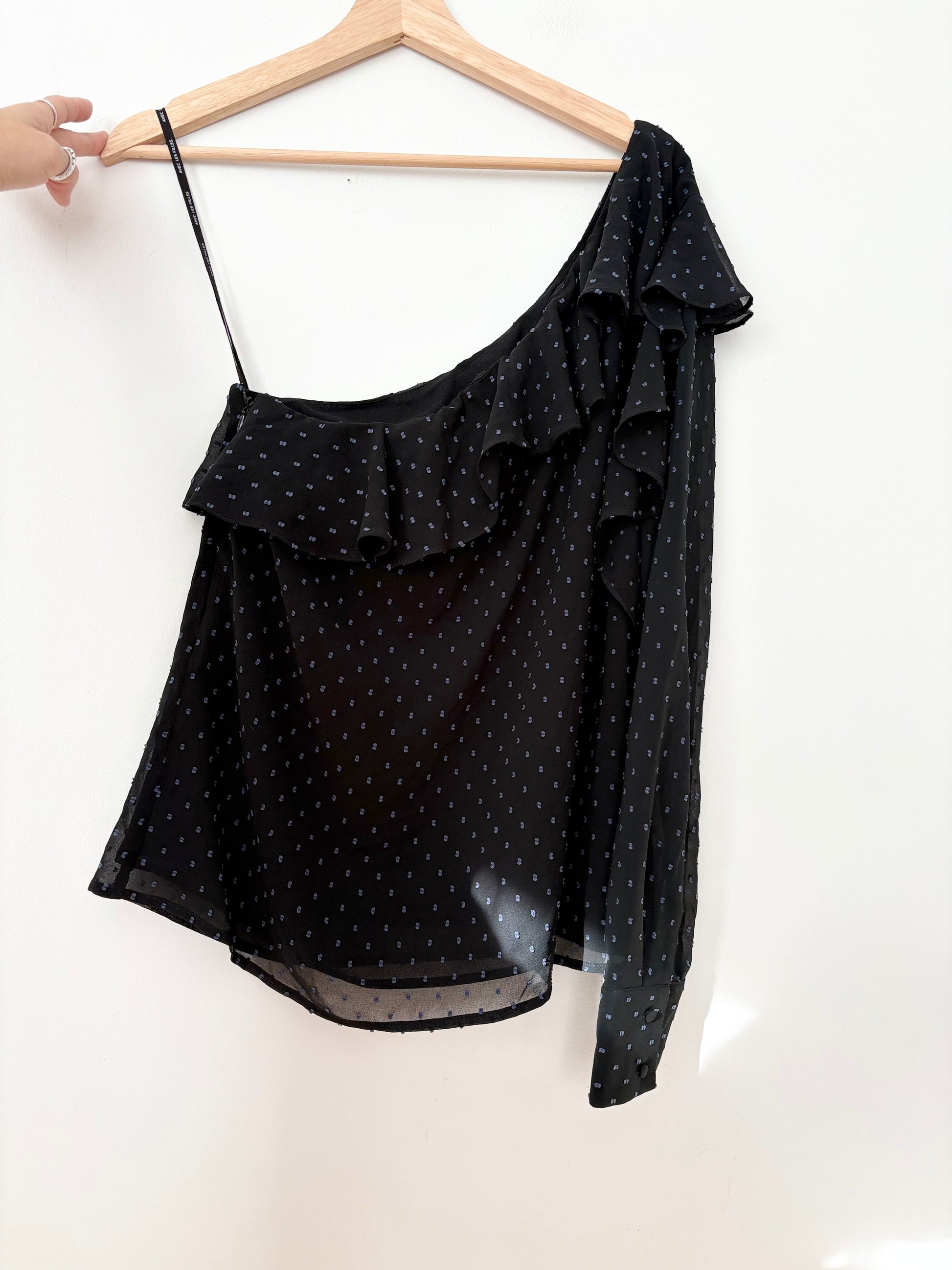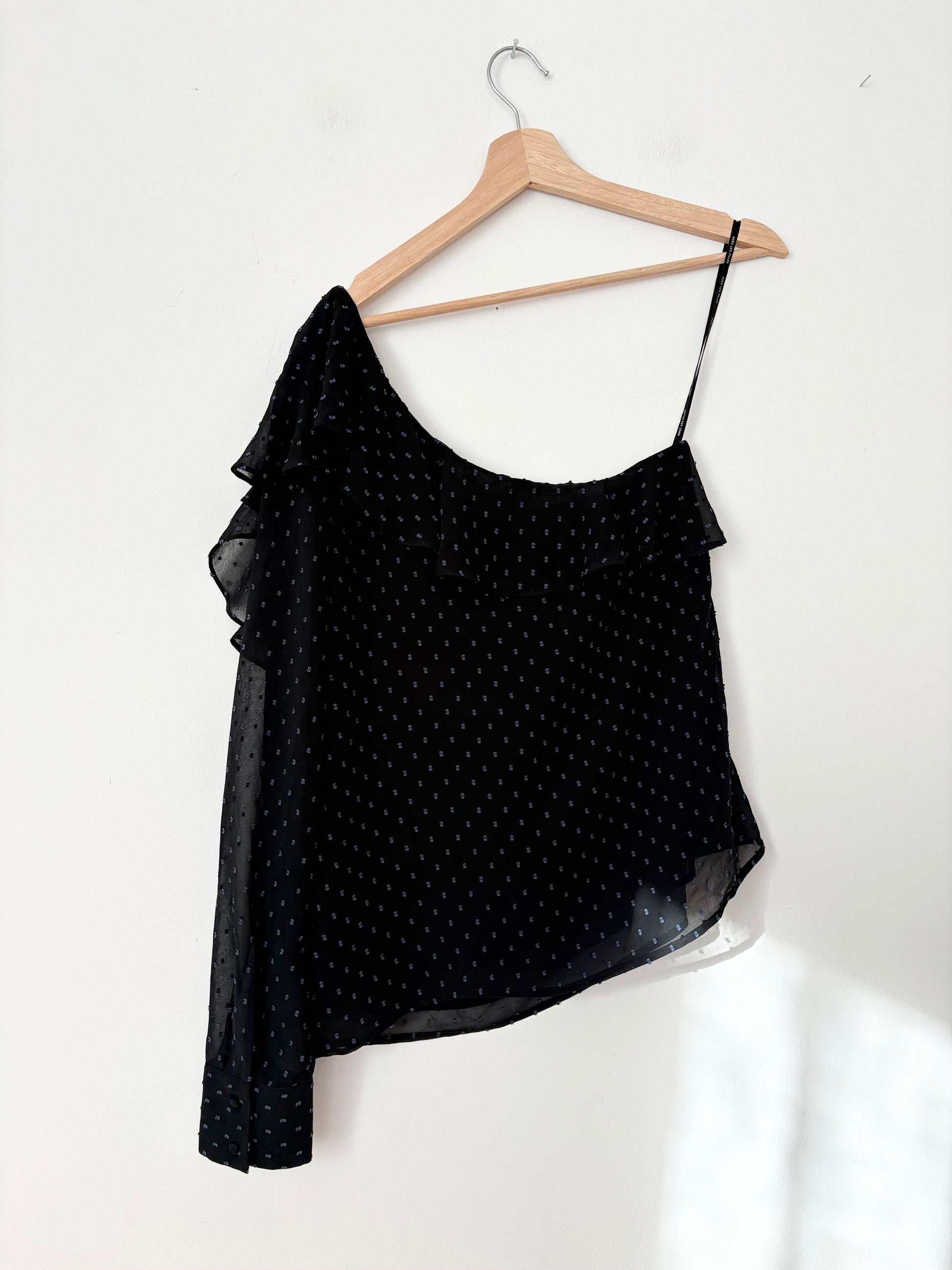 Swiss dot detailed ruffled one shoulder fully lined sheer blouse