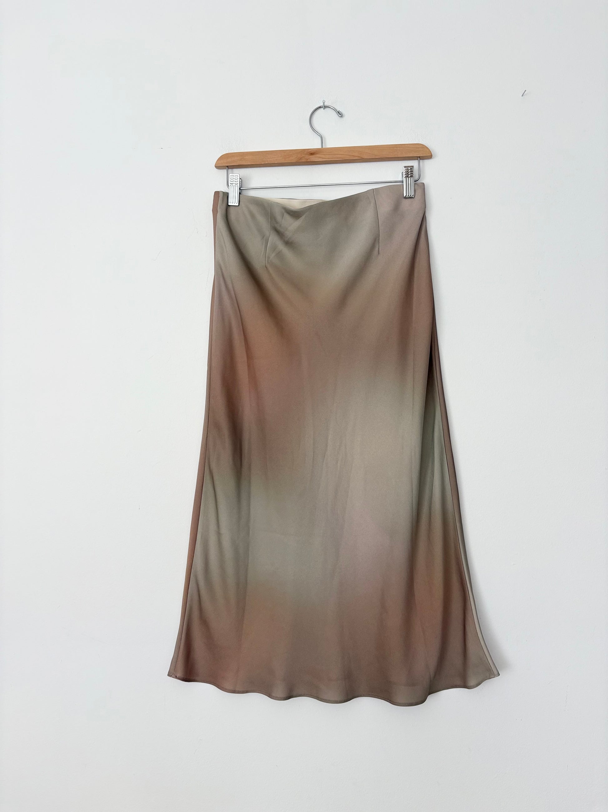 This is a bias-cut, midi slip skirt with an elastic waist. It’s made from lightweight Japanese satin with a glossy finish. This version comes in an exclusive ombre print that was designed in-house and features a darted back