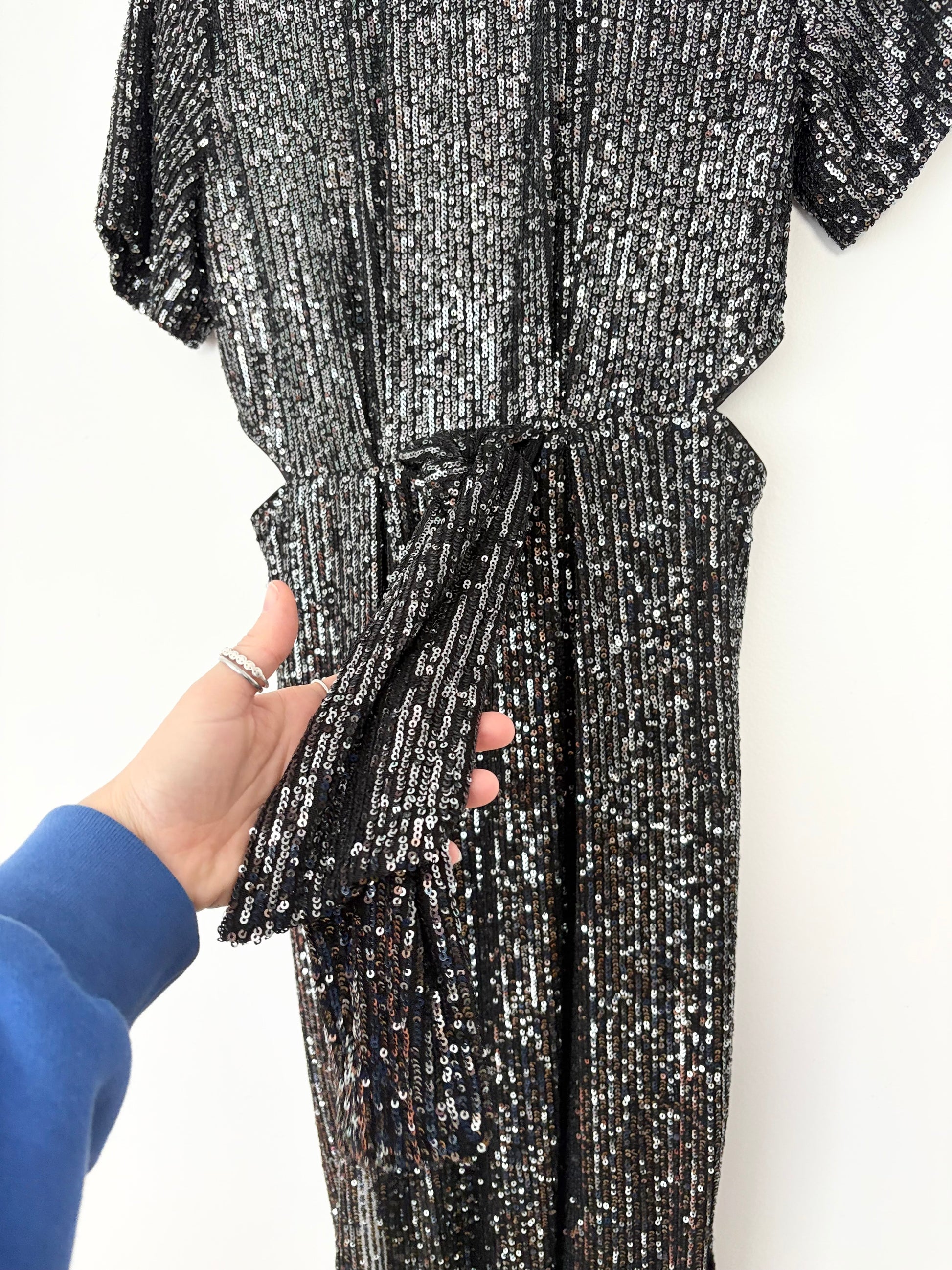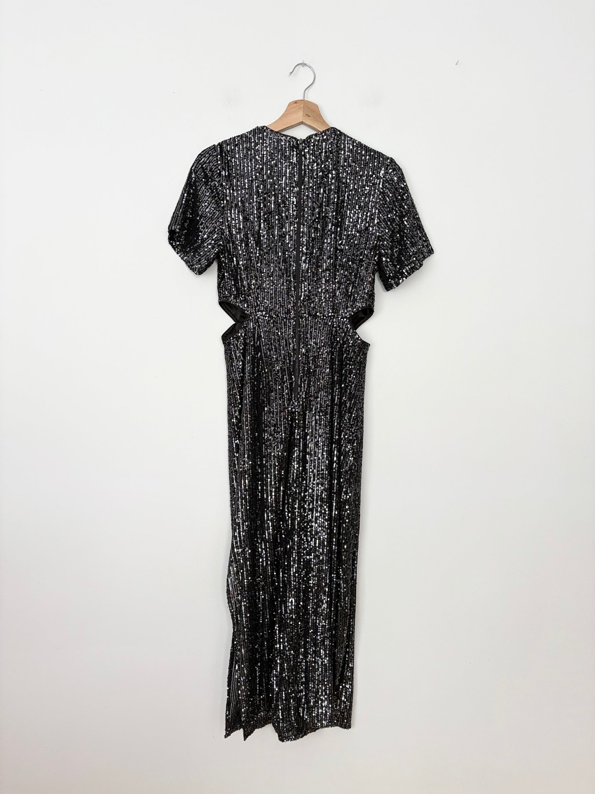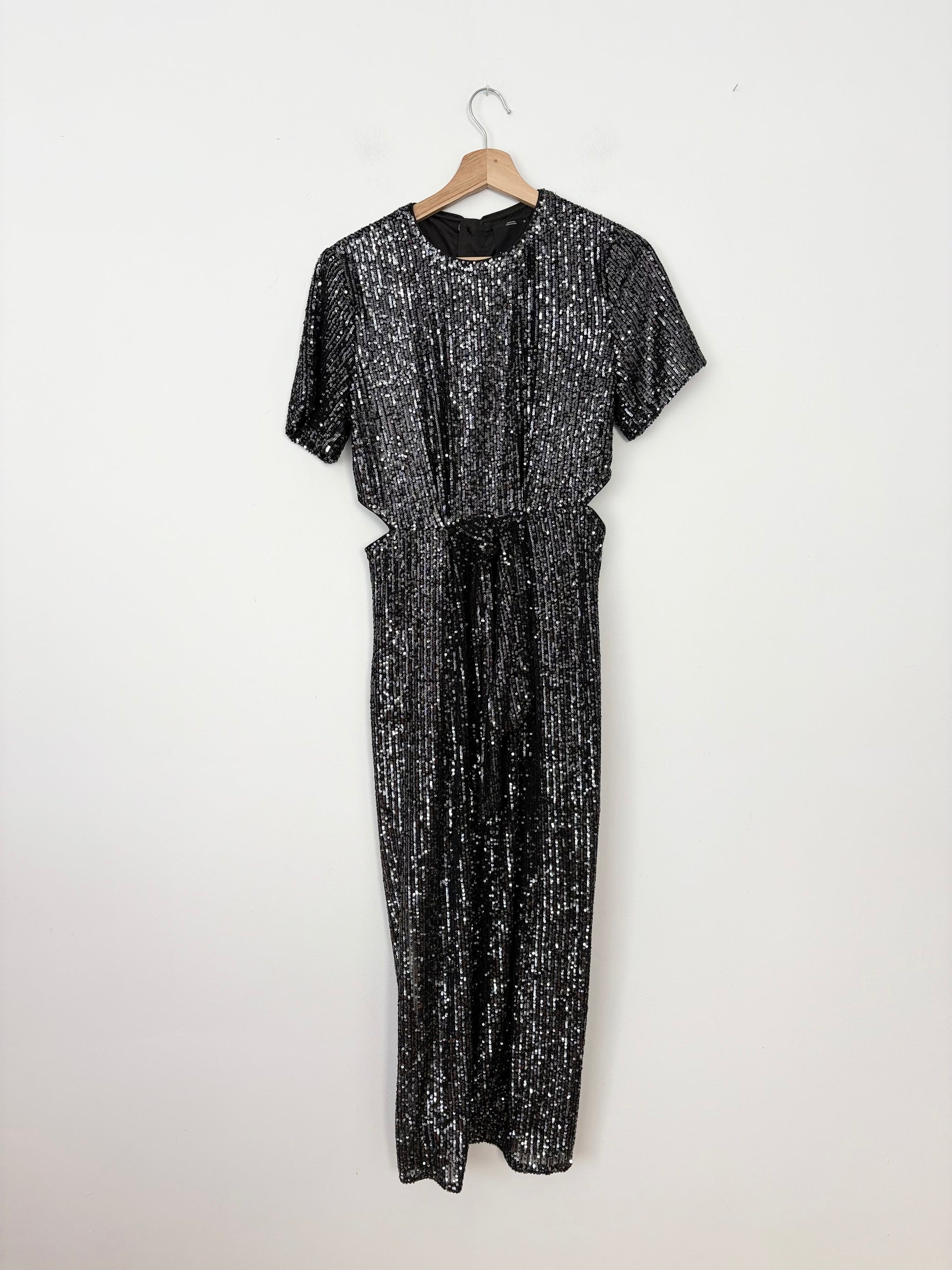 Black sequin midi with a sleek, body-skimming silhouette and short sleeves. Features a crew neckline, subtle draping, and modern waist cut-outs for added shape.