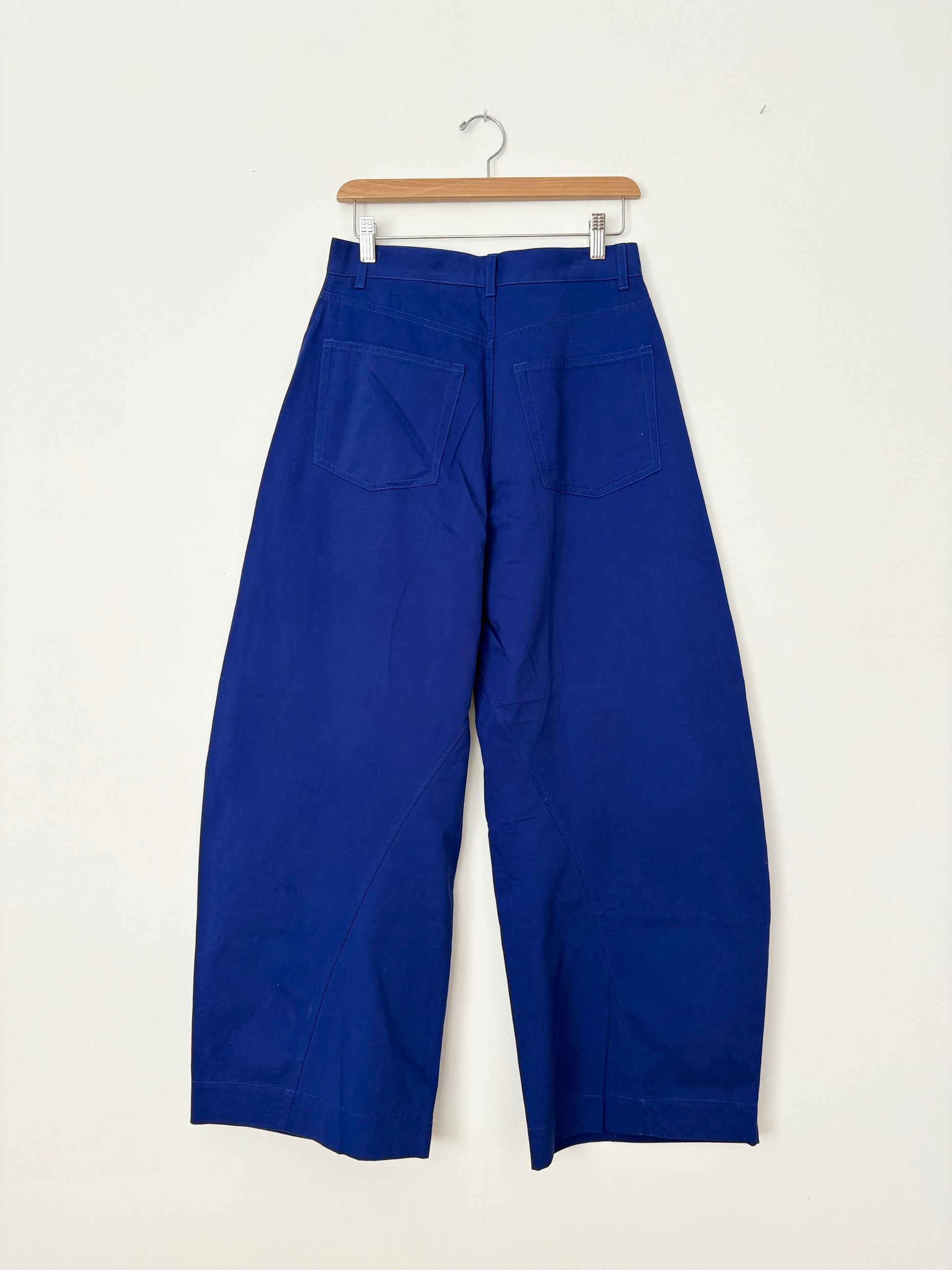 Designed with sweeping seams that curve around the leg, these pants are made from vibrant blue cotton and cut in an amped-up barrel shape.