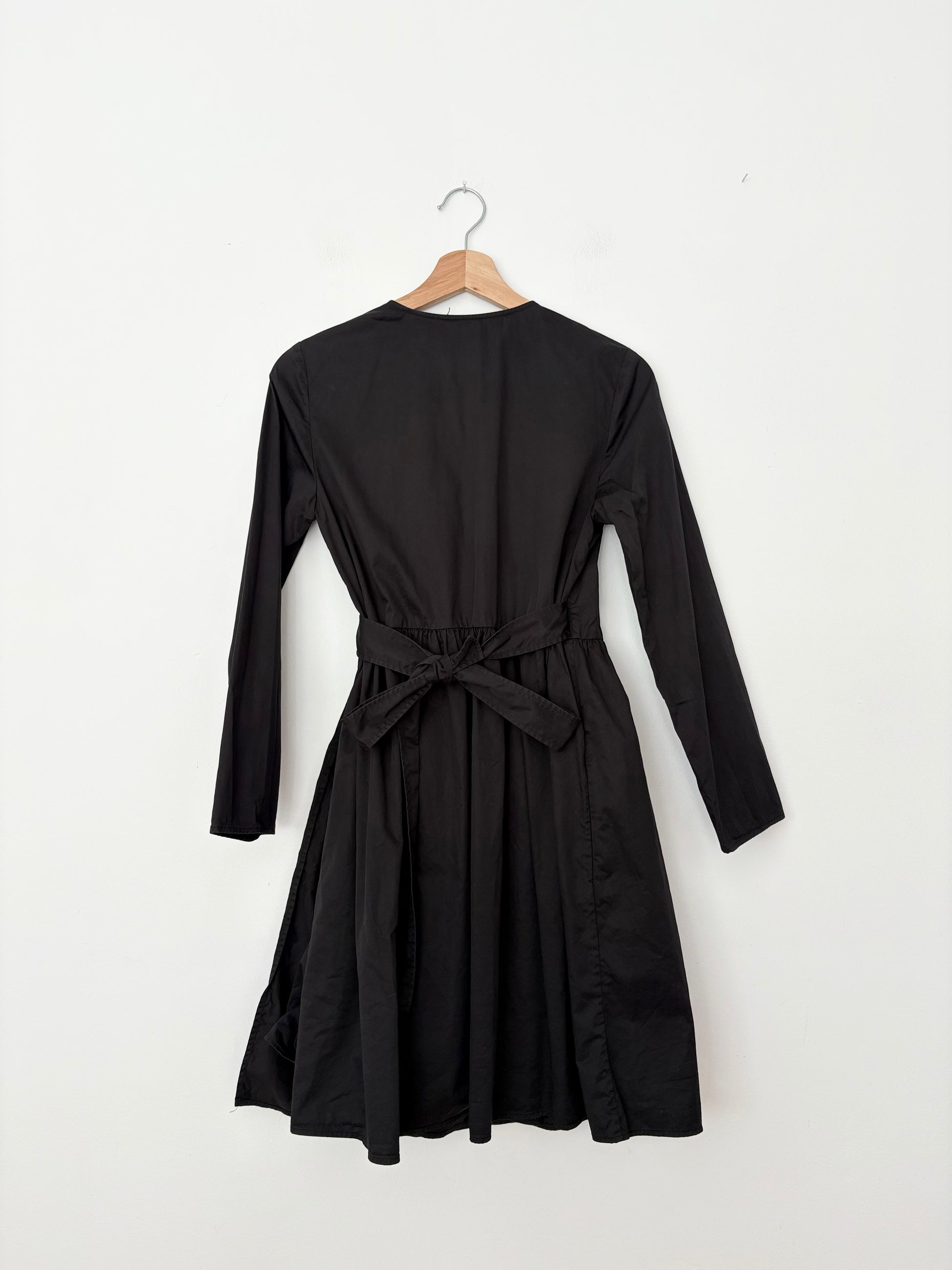 A contemporary design with an unexpected construction , this dress is made from crisp cotton and is layered with geometric panels that tie-up over the front and back. Cut with long-sleeves, it has a pleated skirt, side pockets and a V-neck under layer