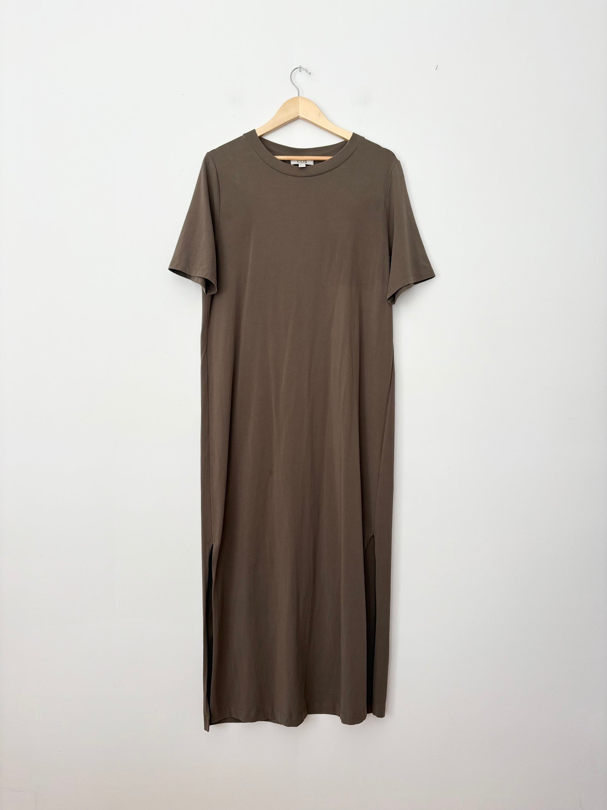This navy T-shirt dress is a modern wardrobe hero thanks to its clean lines and minimalist silhouette. Crafted from plush cotton-jersey, it features a ribbed round neckline, dropped shoulders and a split midi hem. Style it with sandals or knee-high boots for a refined aesthetic.