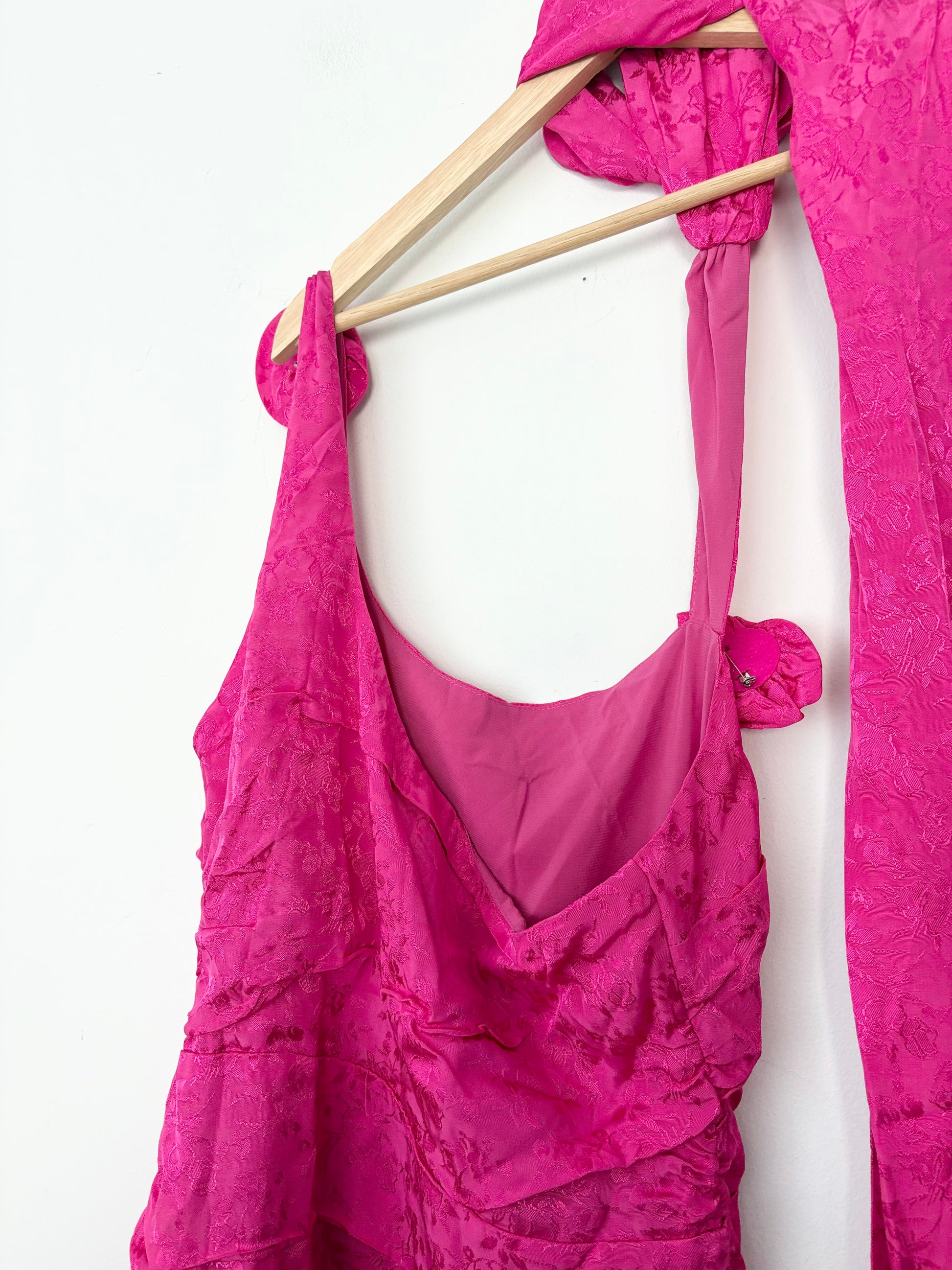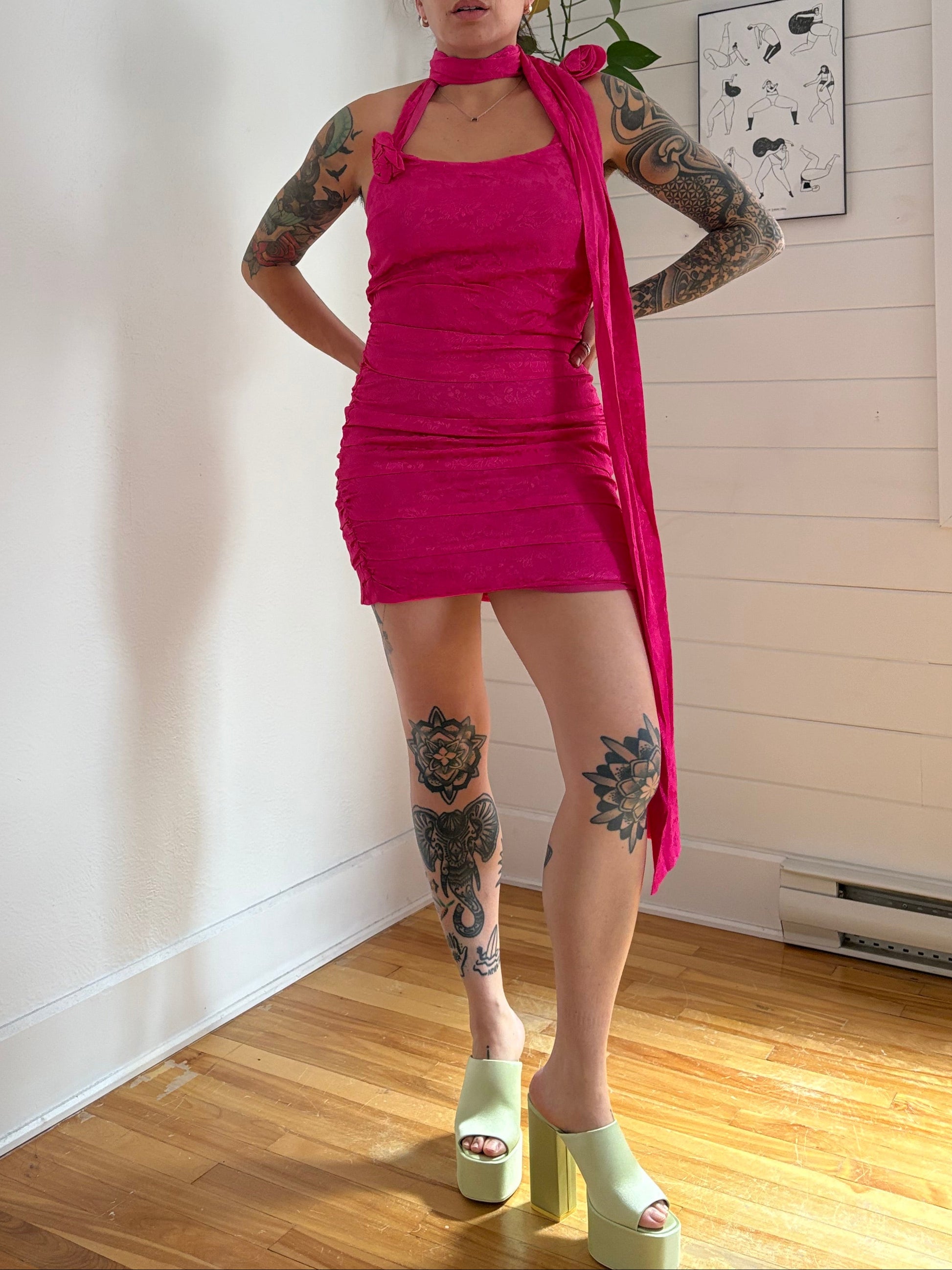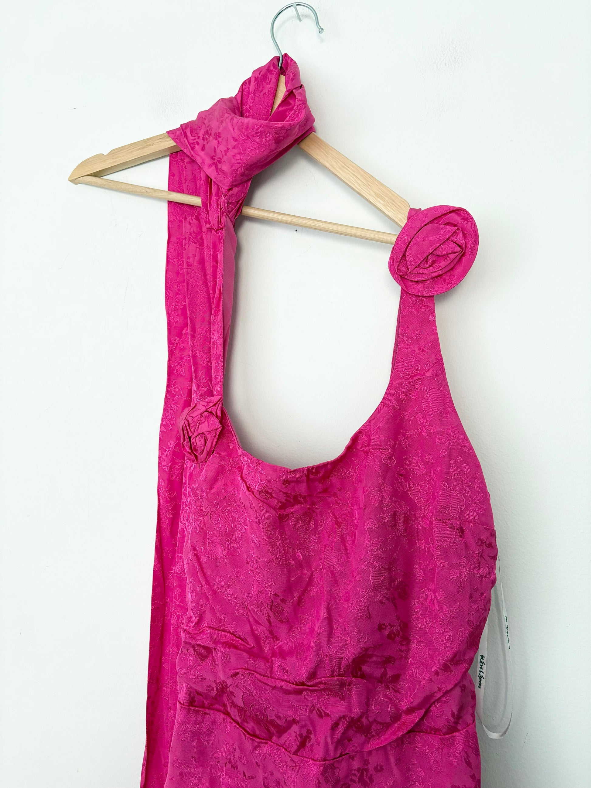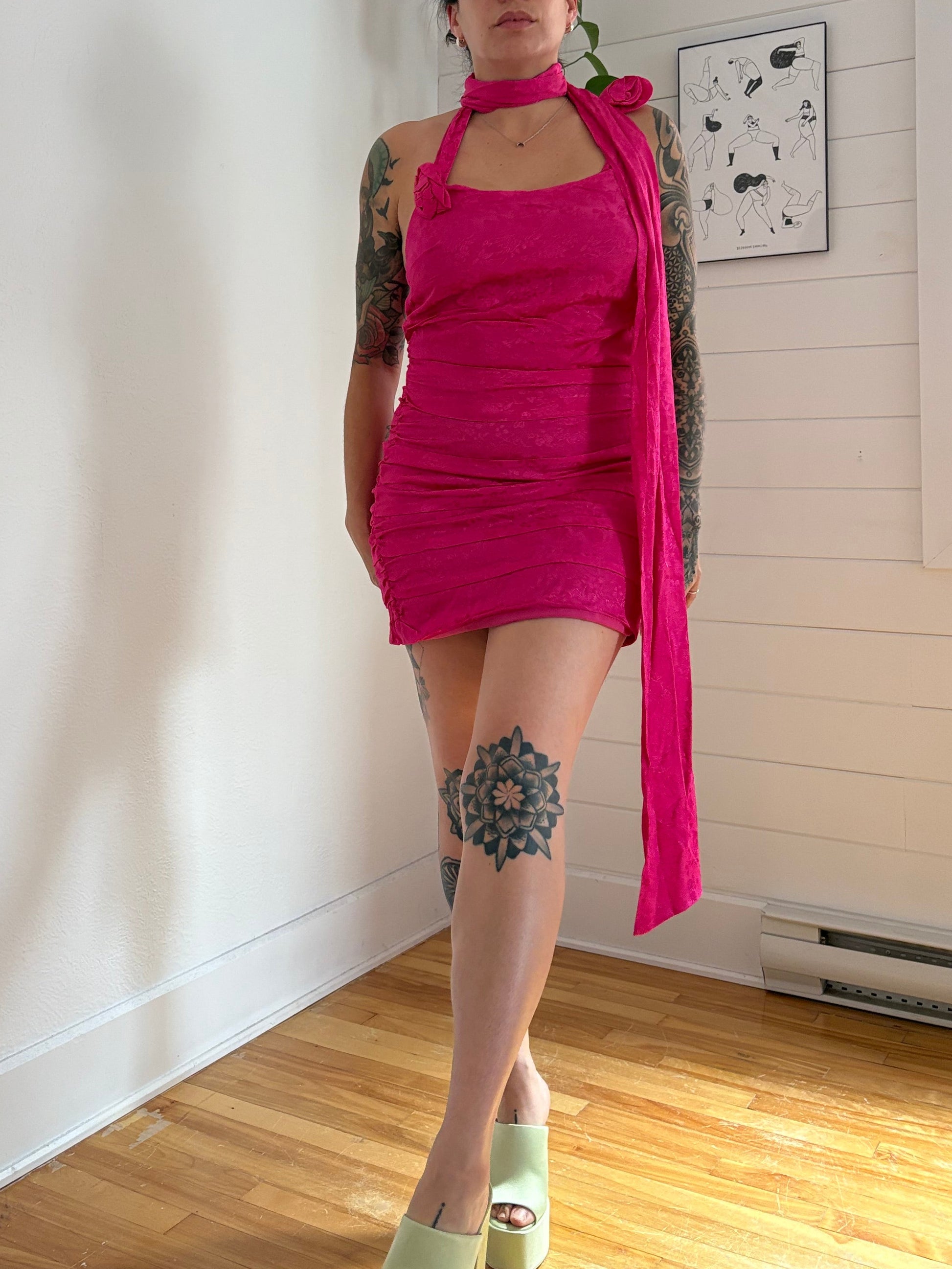 a vibrant pink floral mini with adjustable straps, ruched sides, and a playful floral brooch detail. Crafted from lightweight rayon with a flattering, feminine silhouette.
