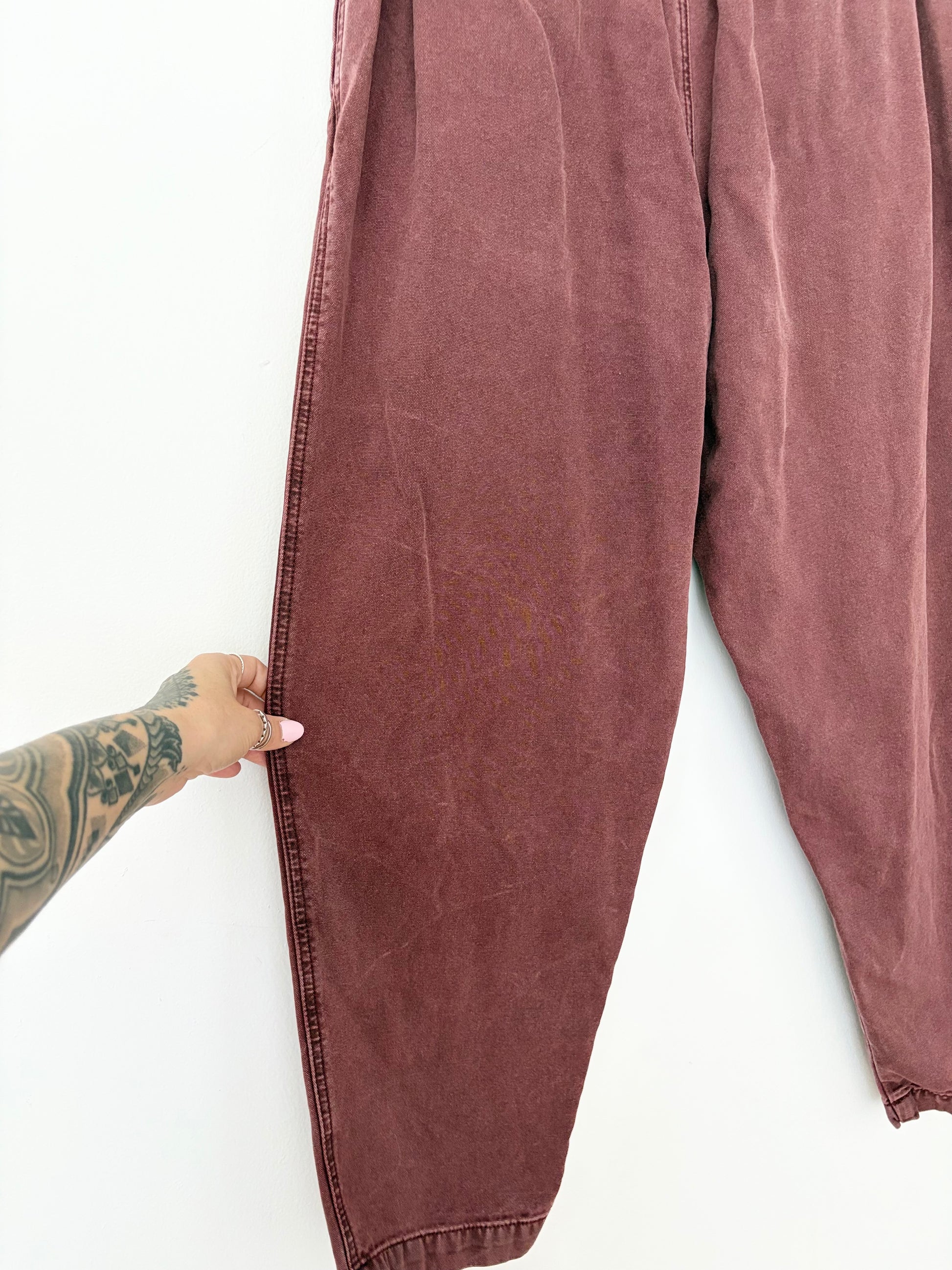 High-rise paper-bag waist pants with pleated fronts, a straight-leg silhouette, ankle-grazing inseam, and a drawstring or tie around the waist for adjustment. Made from a soft blend of 59% cotton and 41% rayon, they have a relaxed yet structured boho vibe, with four pockets.