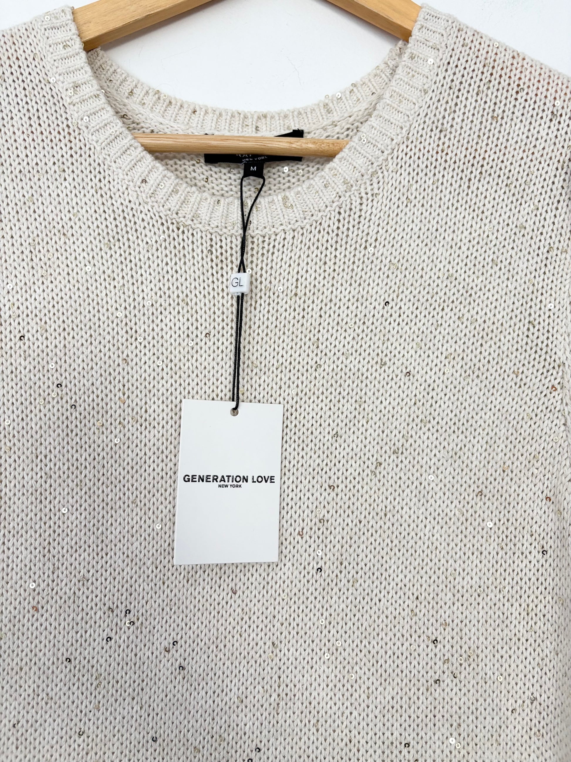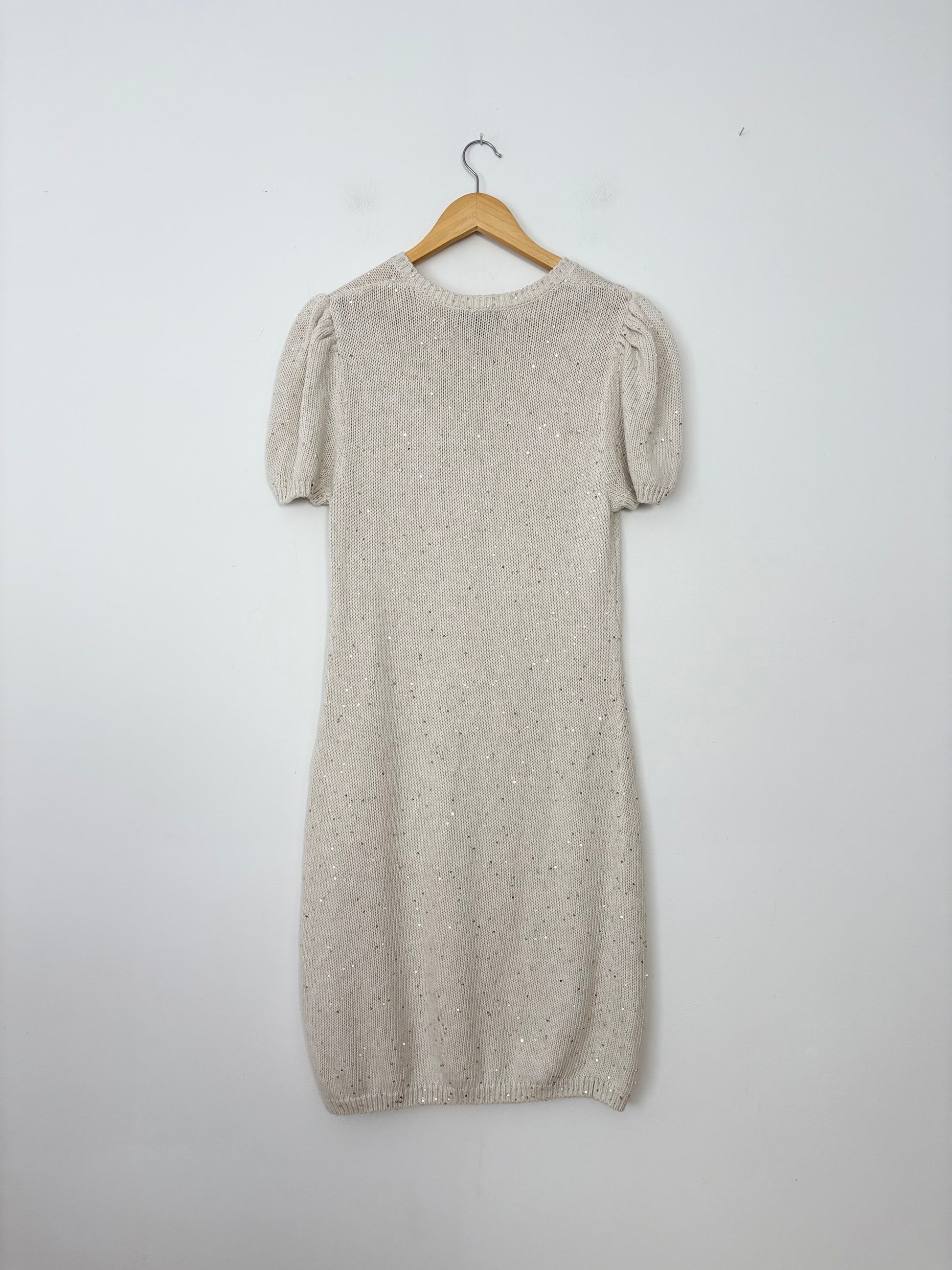 Sequin Dress that blends a cozy knit with allover subtle sequins for a soft, luminous shimmer. The mini silhouette features puffed short sleeves and a classic crew neckline for an elevated yet effortless look