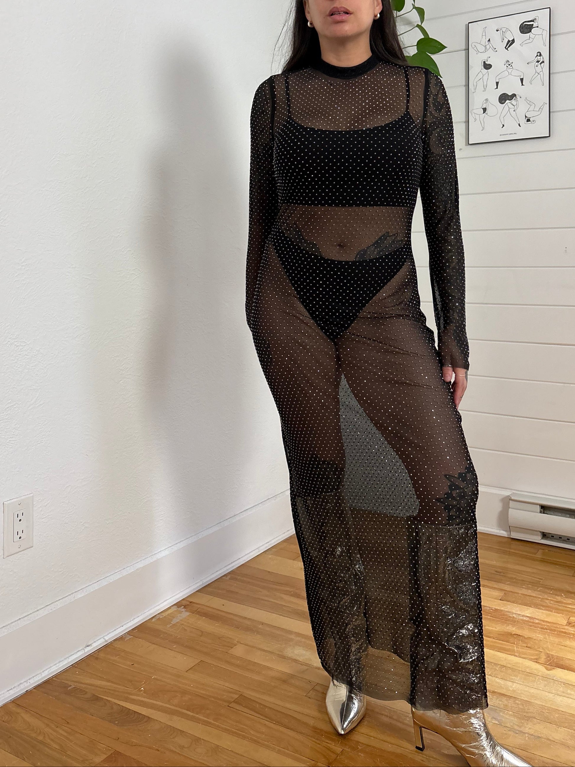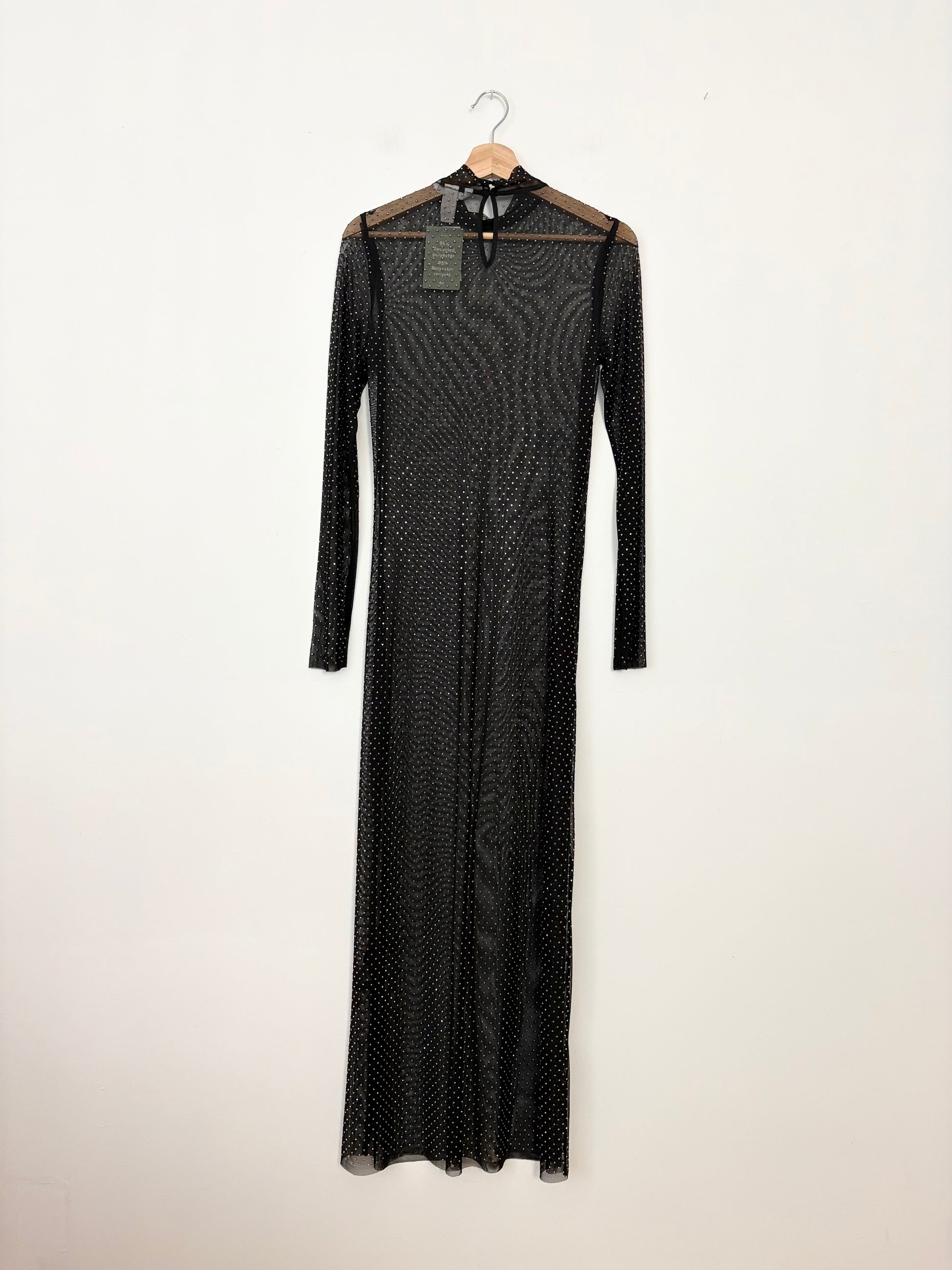 Ankle length fitted dress in mesh embellished with sparkling rhinestones, small stand up collar and keyhole opening with concealed buttons at back.