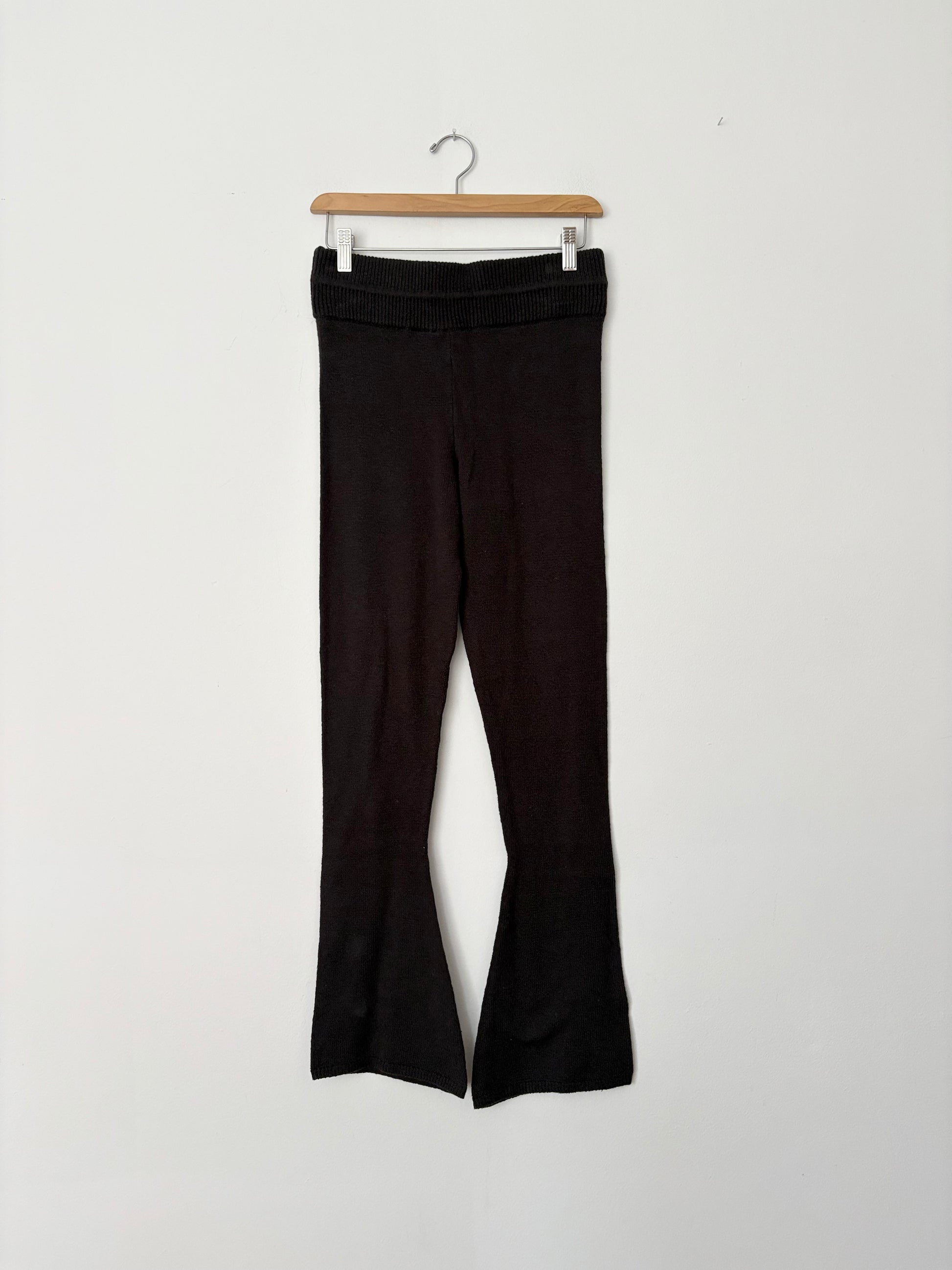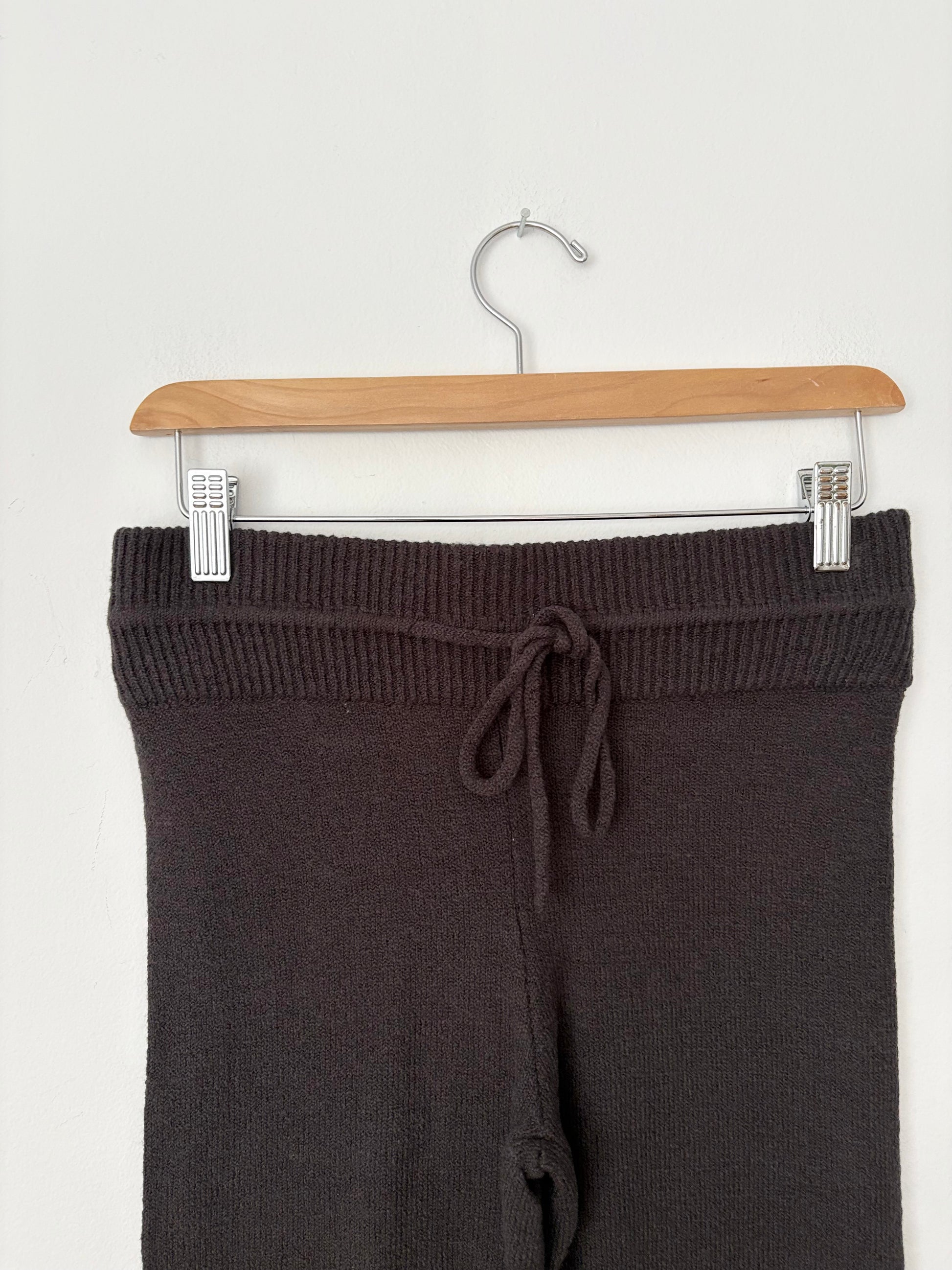 A relaxed loungewear pant in a soft boucle knit blend, features a ribbed drawstring waistband for adjustability and flared leg silhouette with a long inseam