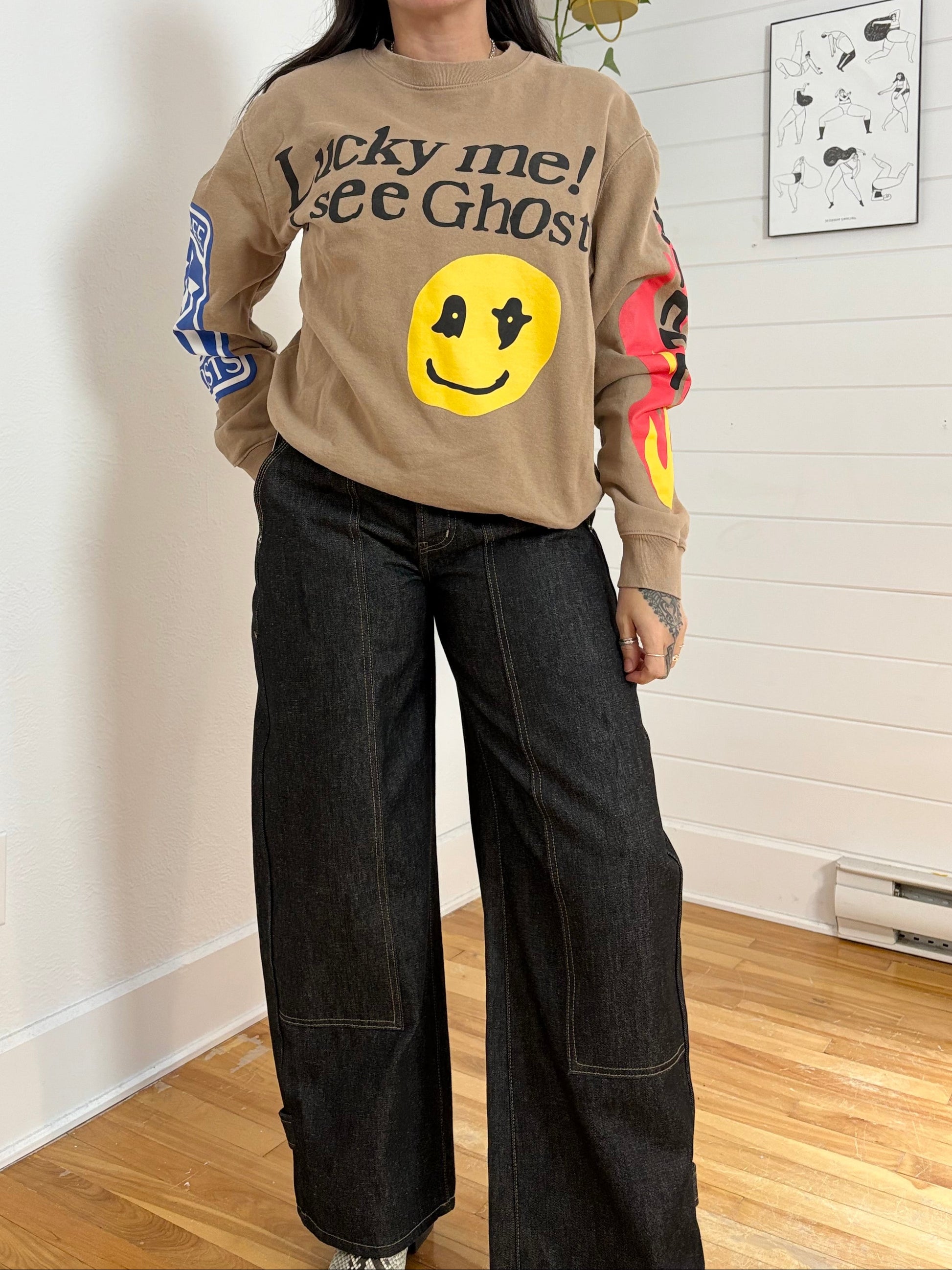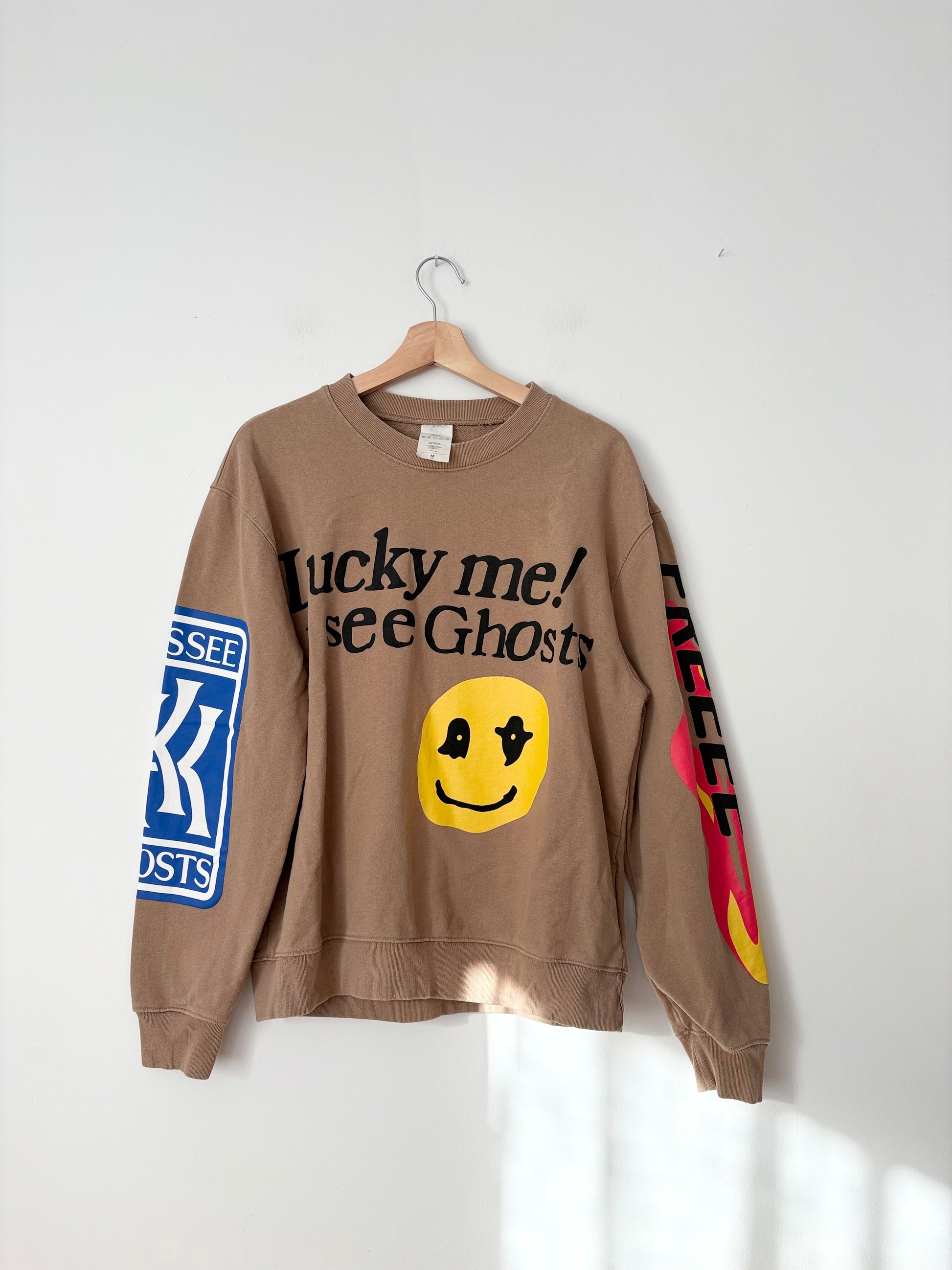 Limited-edition crewneck featuring the iconic “Lucky Me I See Ghosts” graphic across the chest, bold heart and flame motifs on the sleeves, and signature vintage-style distressing. Originally released in collaboration with Kanye West’s Kids See Ghosts project.