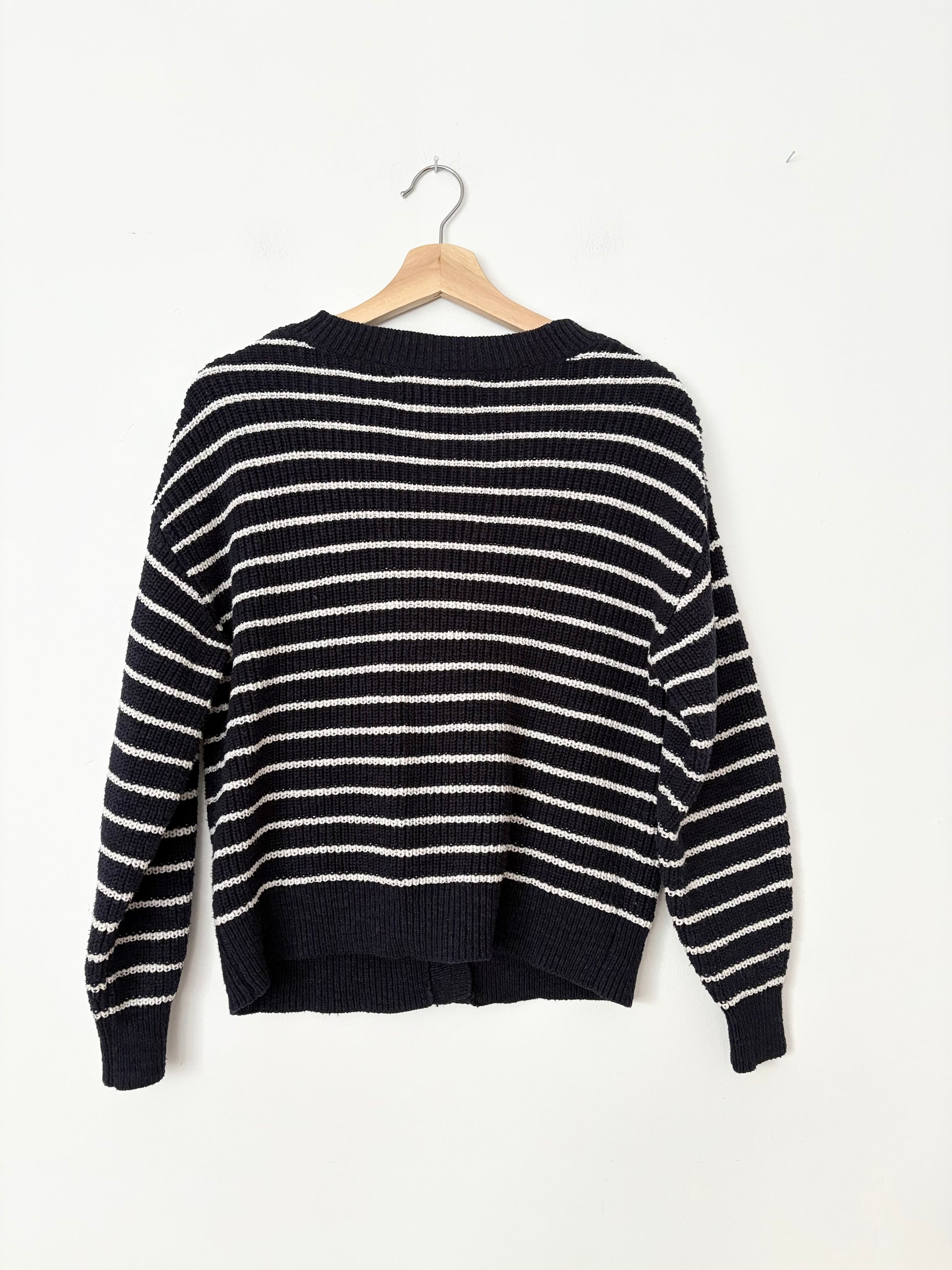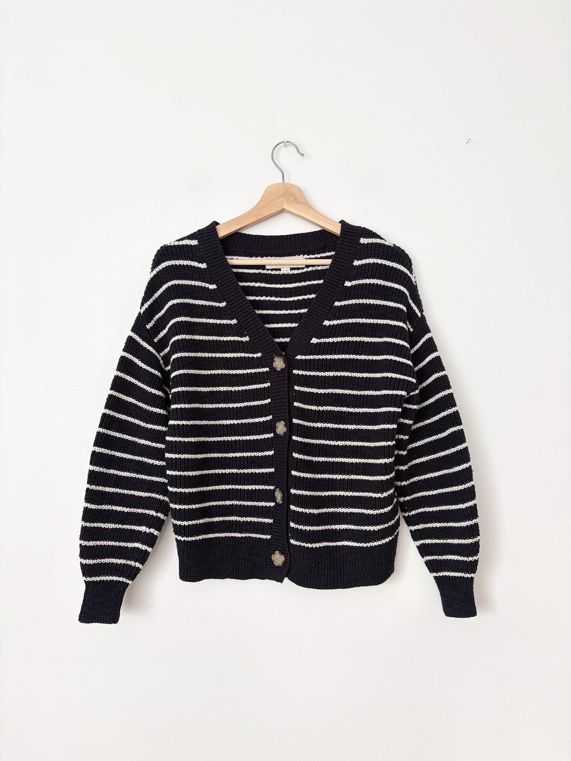 Navy & white stripe nautical cardigan with tortoise buttons, 3/4 length sleeves and boxy fit