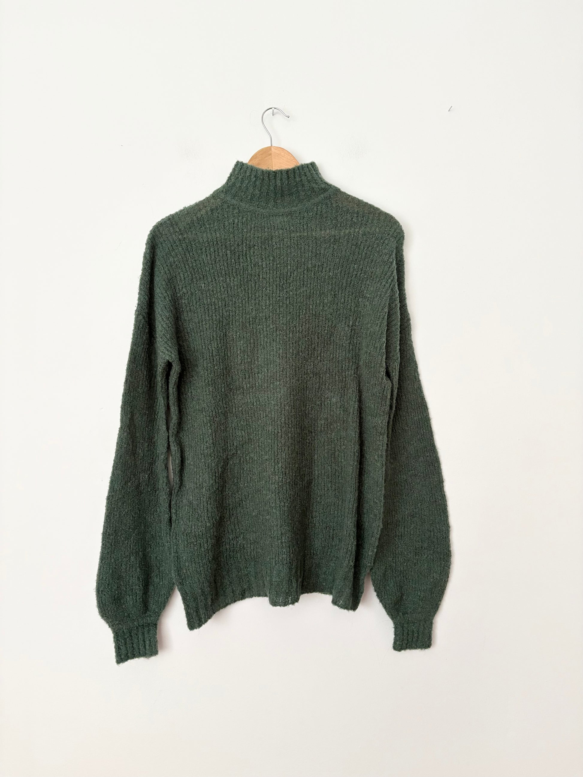 slouchy, fuzzy-knit pullover made from a cozy wool-blend, featuring ribbed trim on the neckline, cuffs, and hem. It has a relaxed, lived-in silhouette designed for a loose, effortlessly stylish fit