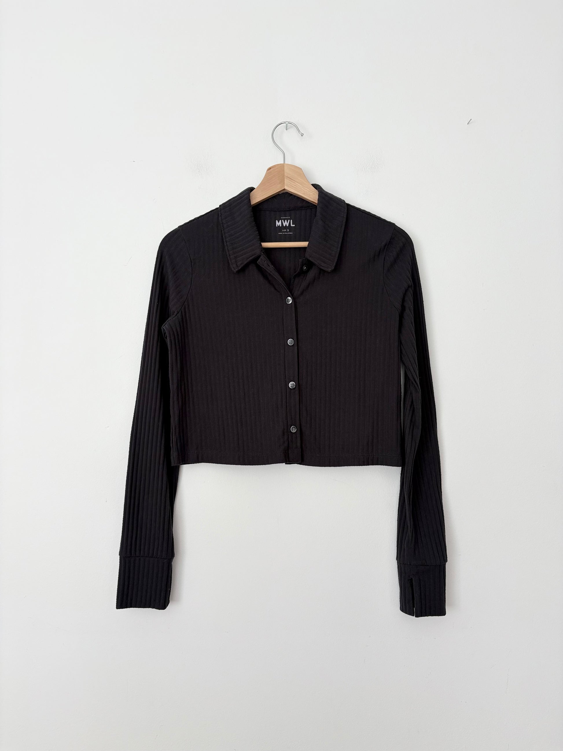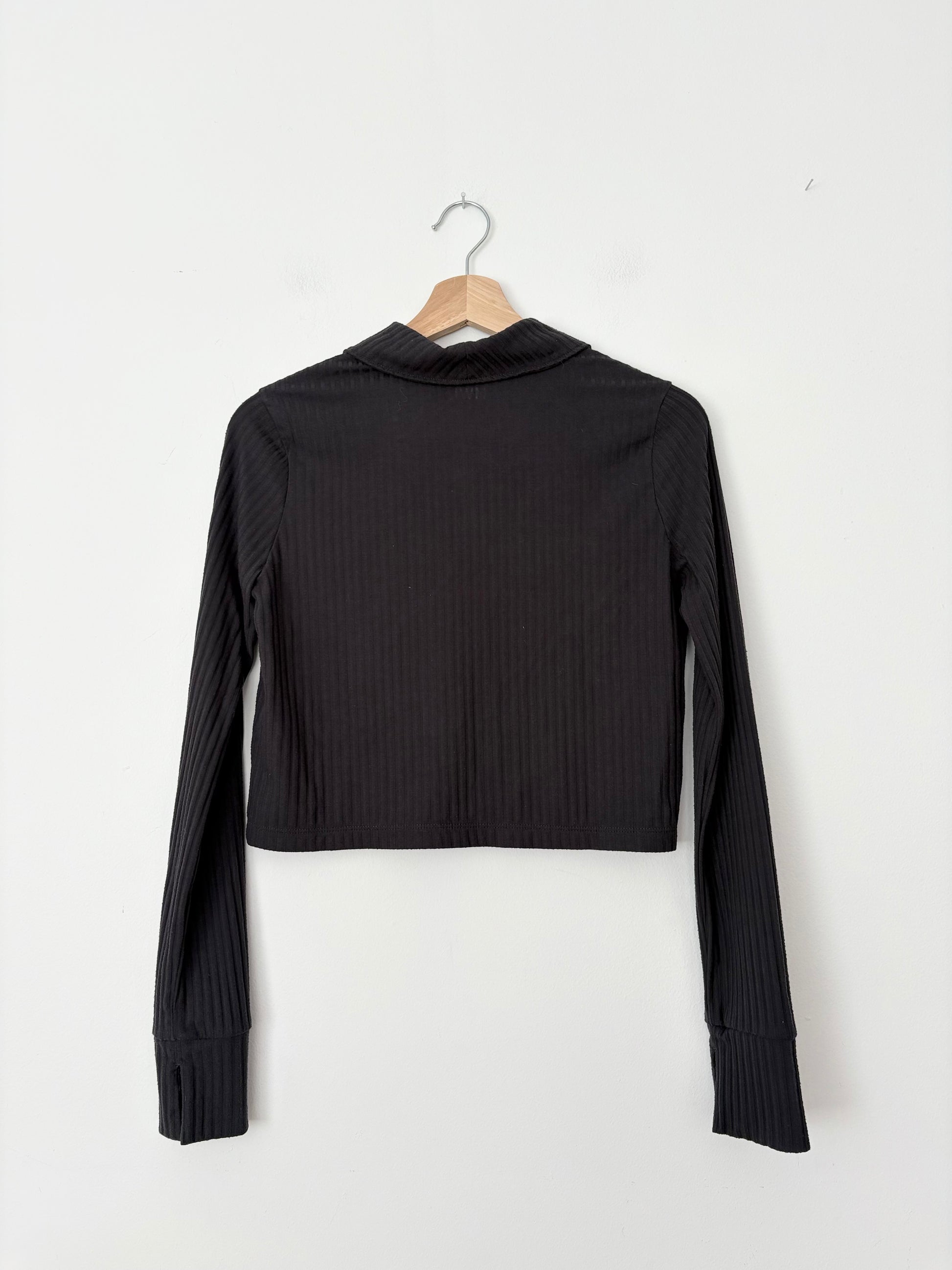 The fabric: brushed and supersoft ribbed with a touch of comfy stretch. The fit: Cropped and cozy, this cardigan has a retro polo collar and long fitted sleeves with slits on the cuffs.