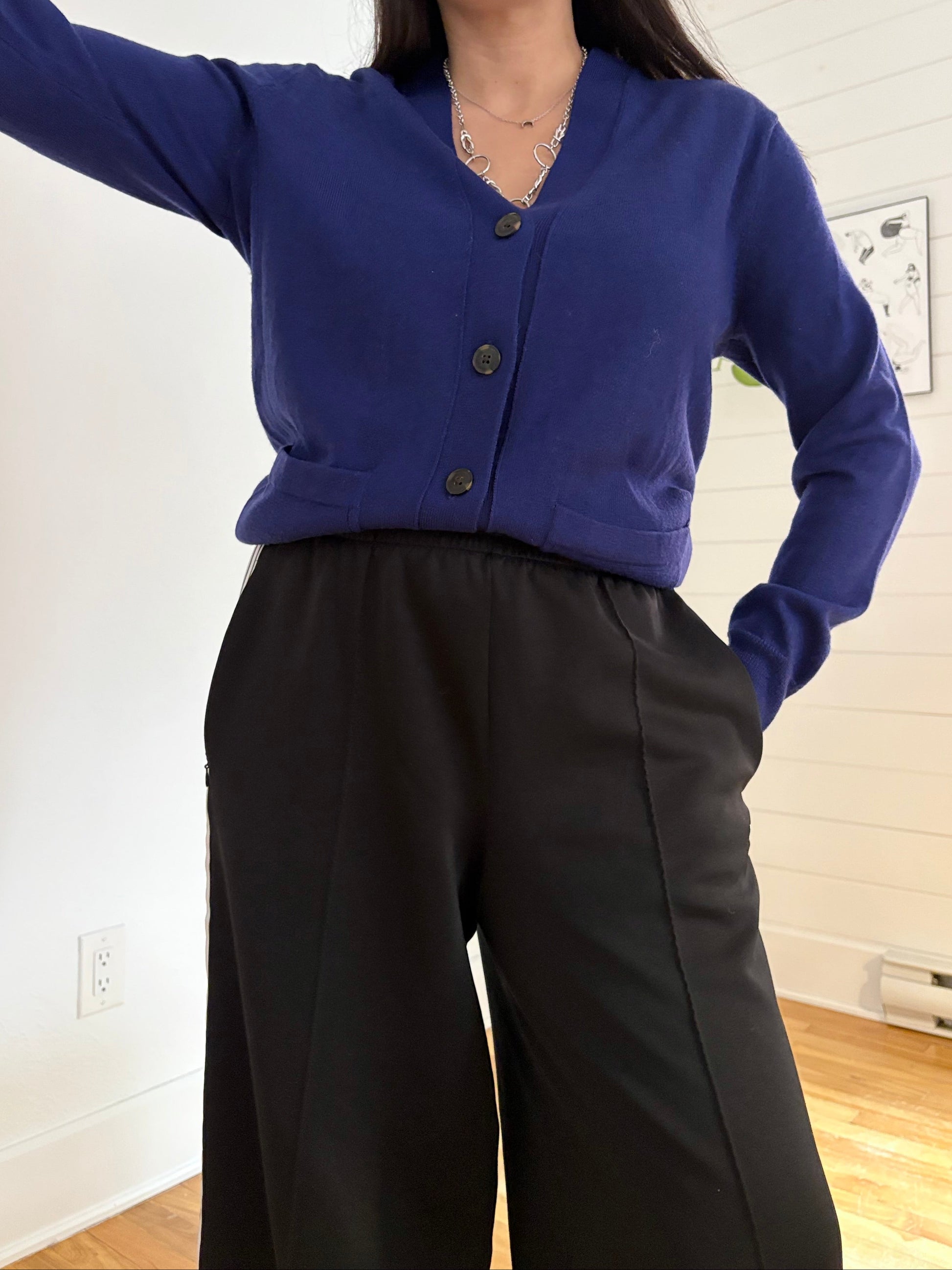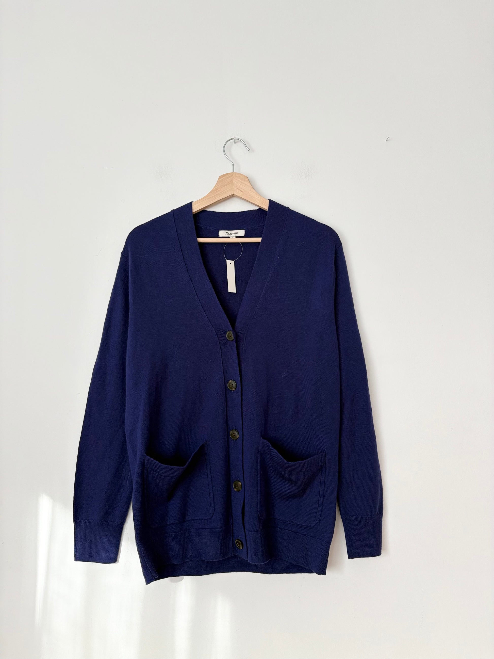 A cozy classic in blue, this V-neck cardigan comes in 100 percent merino wool. Its patch front pockets, button front and übercomfy relaxed fit make it the perfect addition to your fall wardrobe.