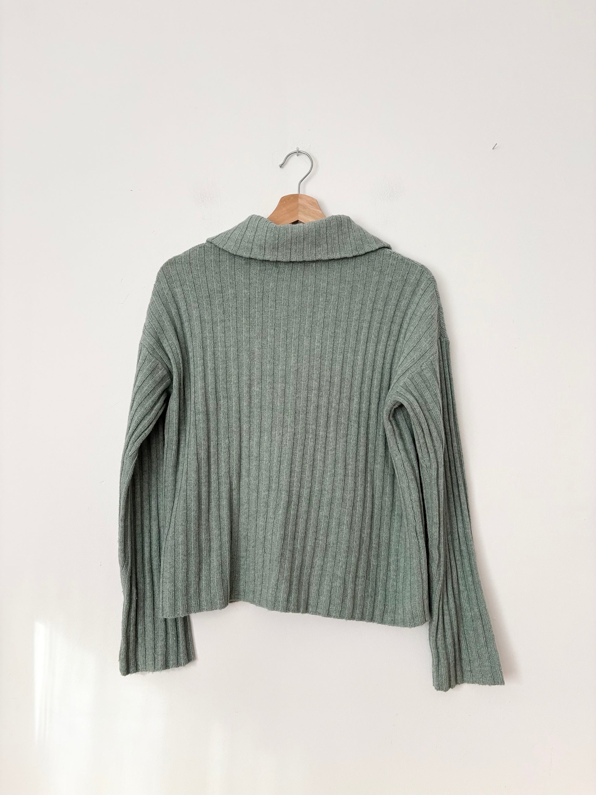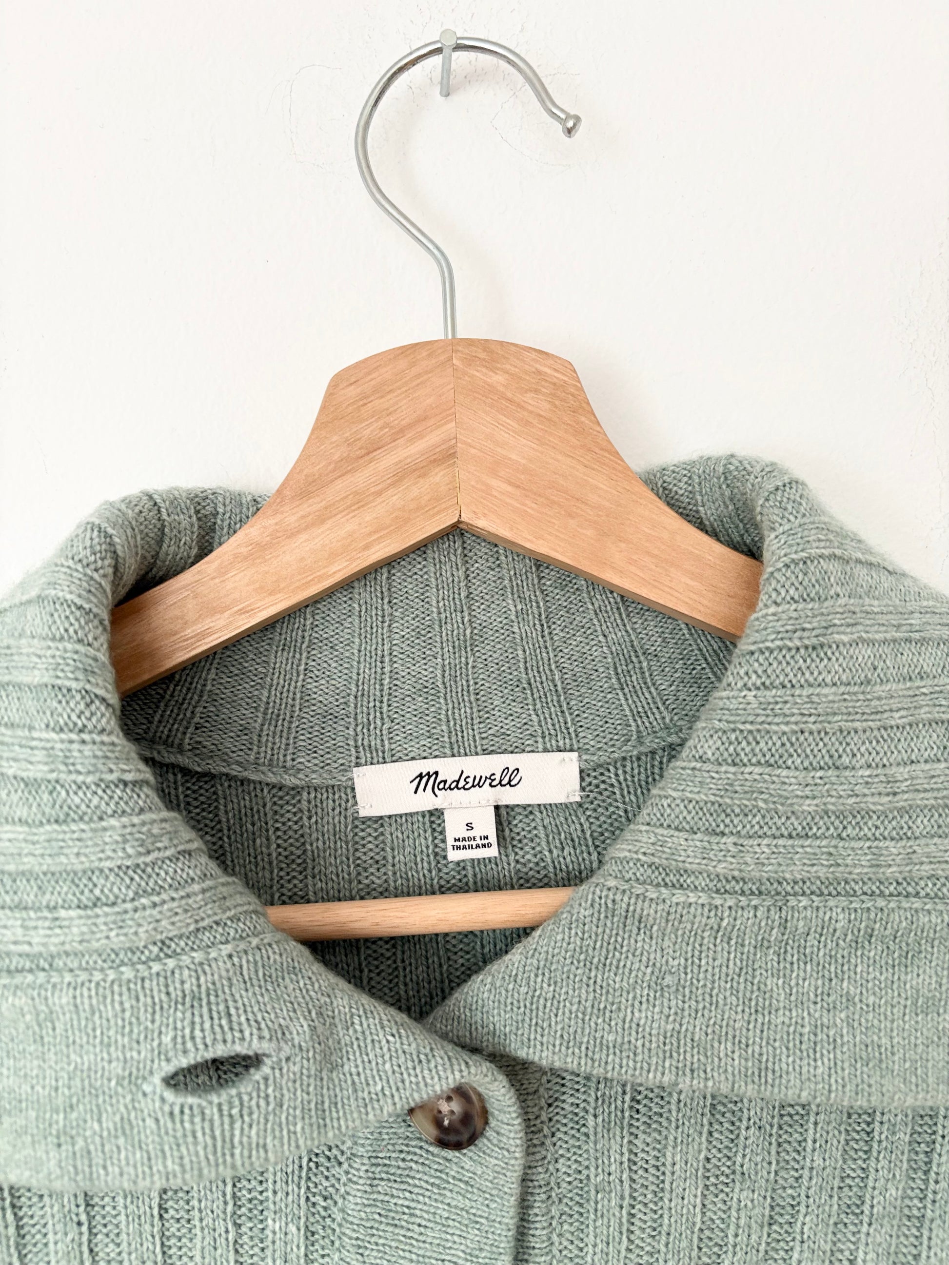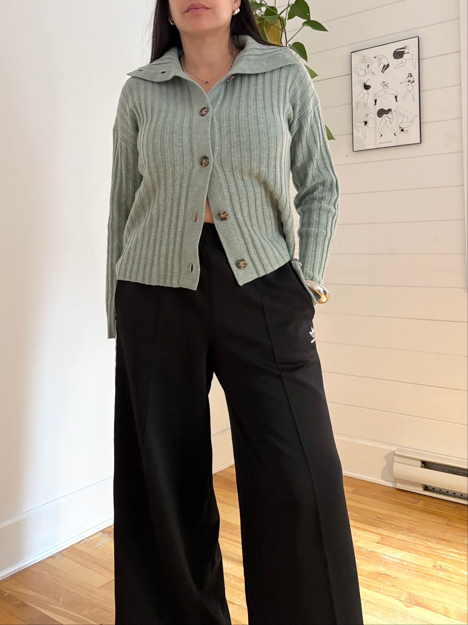 Coming in a wide ribbed stitch, this wool-blend cardigan has an oversized foldover collar that buttons all the way up on those super chilly days.