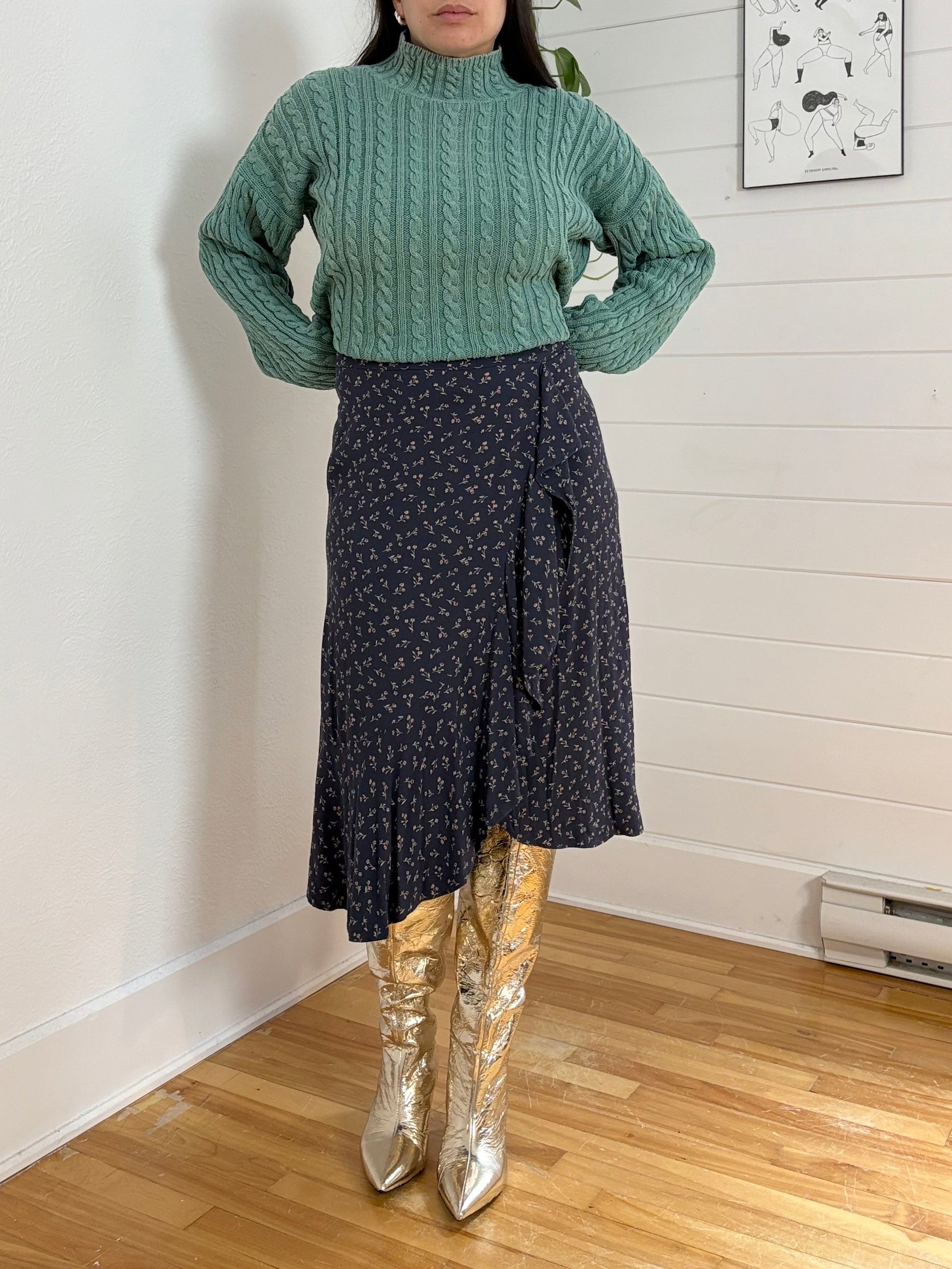 This faux-wrap midi skirt has a vintage-y feel thanks to its sweet floral print and swingy ruffle front.