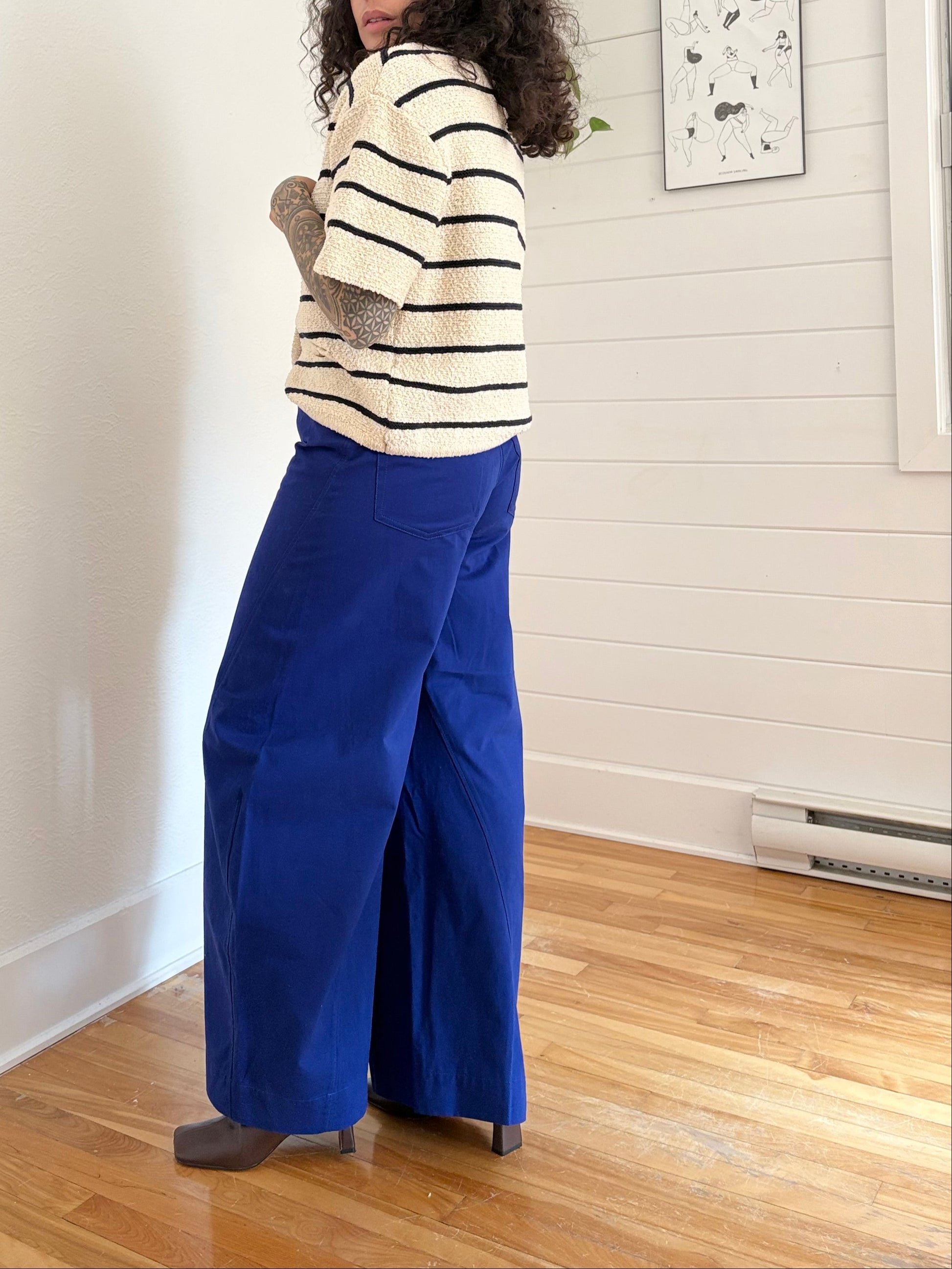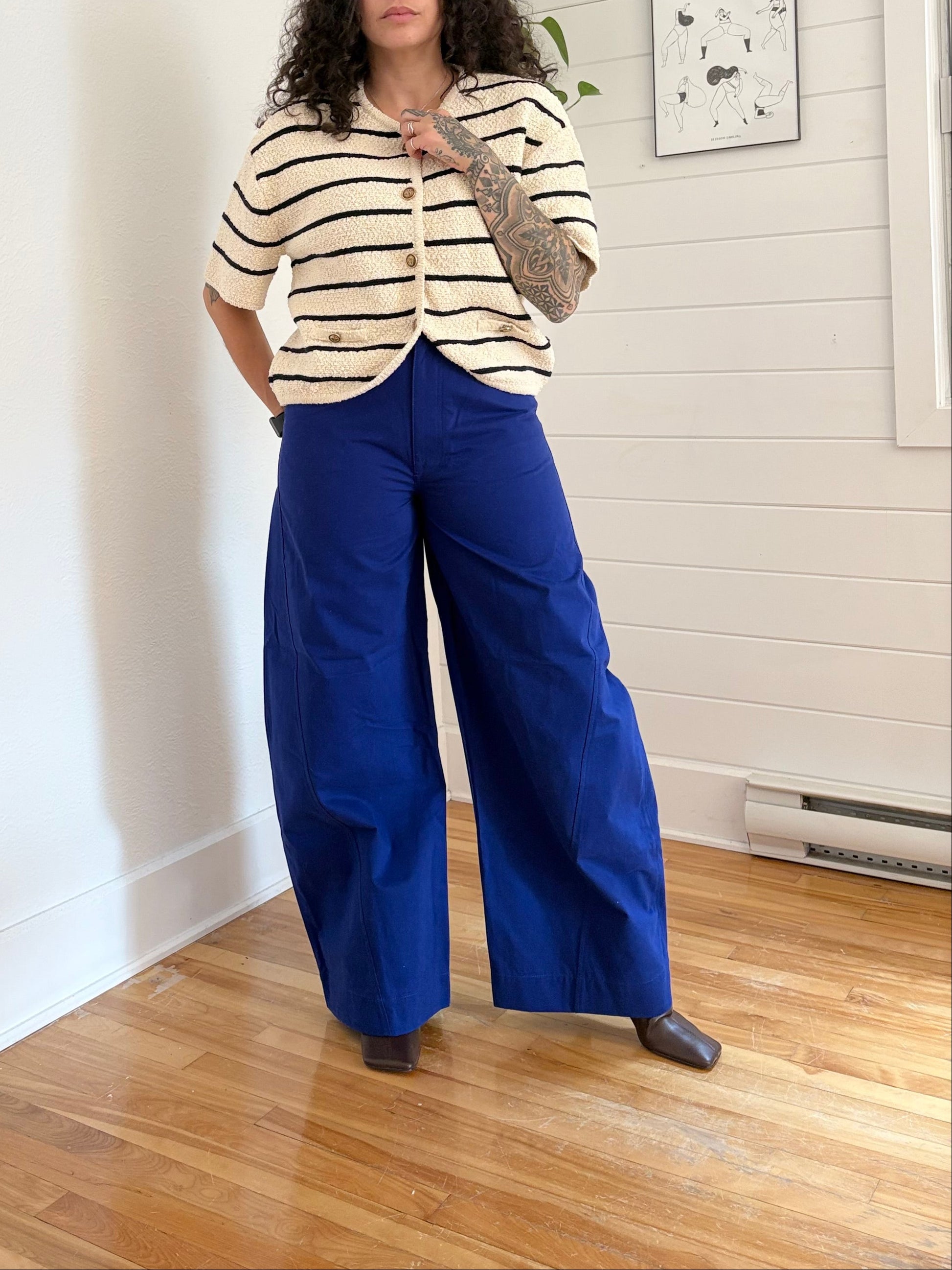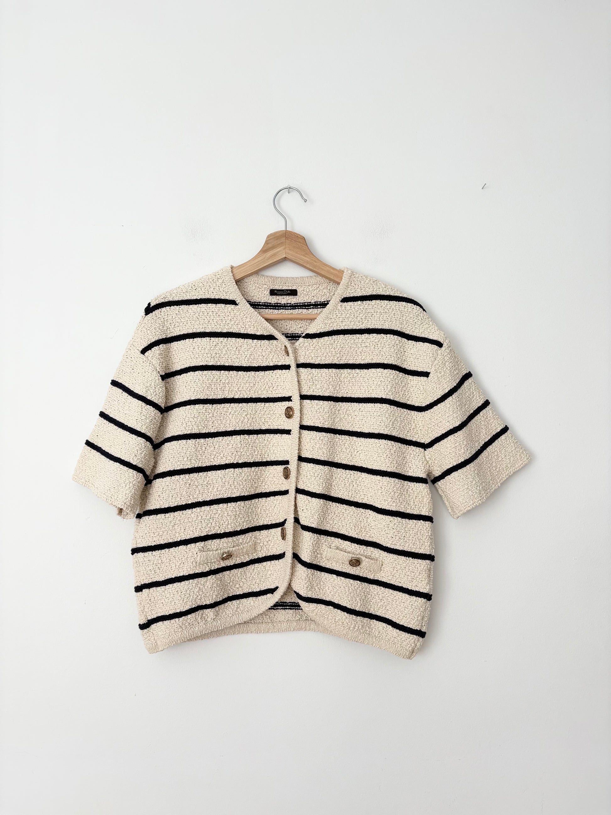 This short sleeve cardigan features a striped pattern, textured knit and button details
