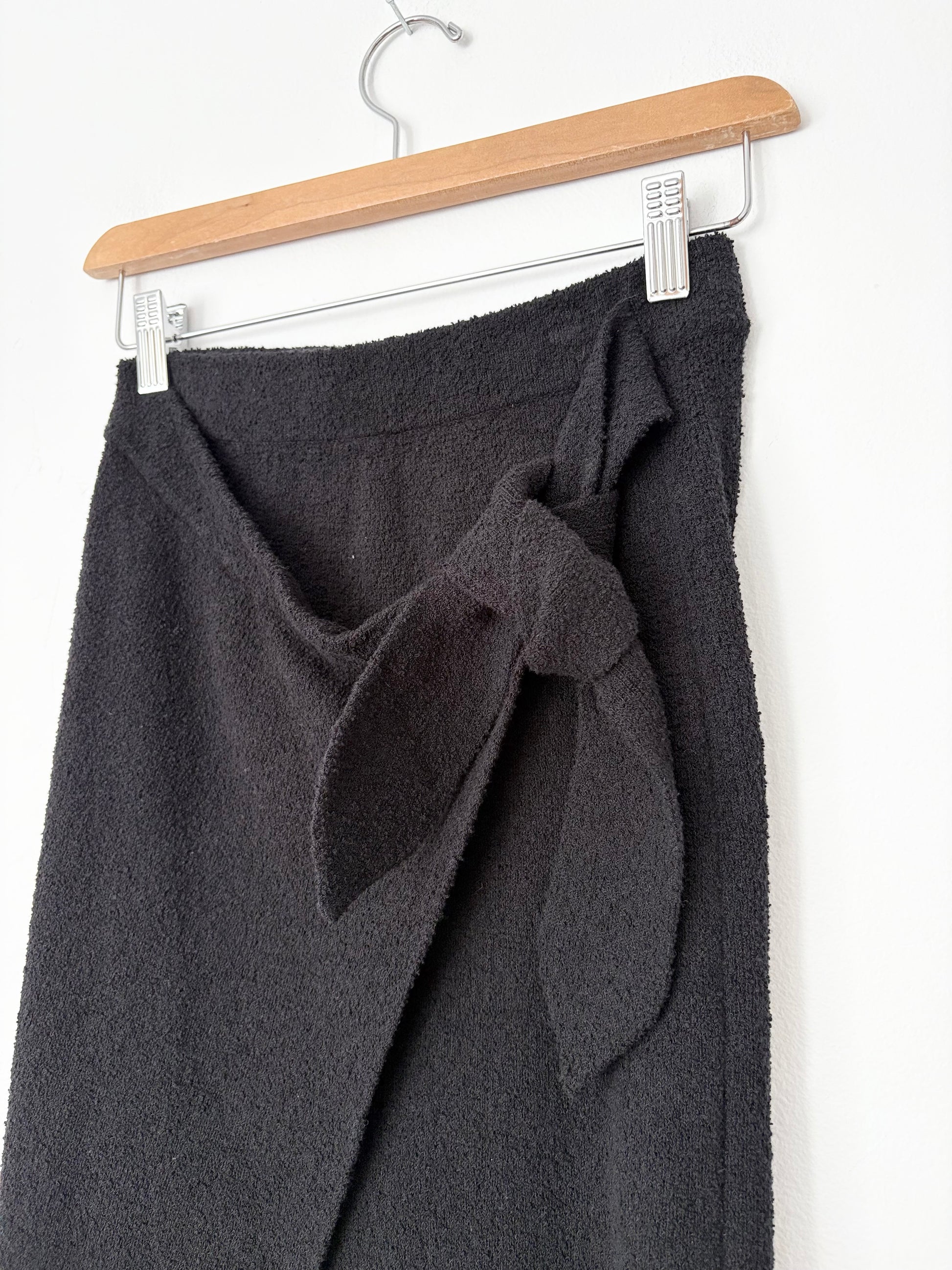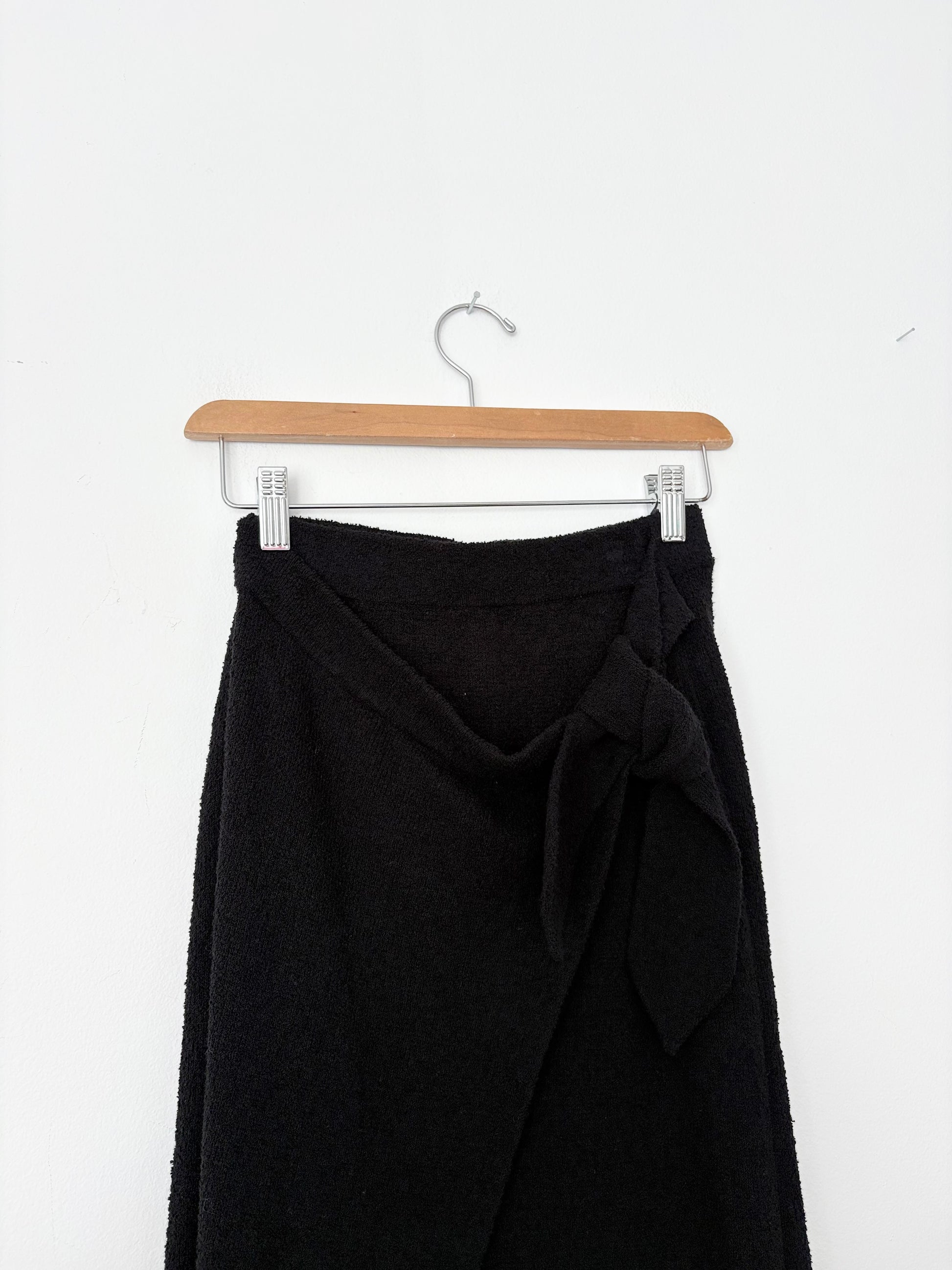 Cotton midi wrap skirt High rise Straight silhouette Hem falls below the knee Self-tie closure Organic cotton/nylon Dry clean Imported
